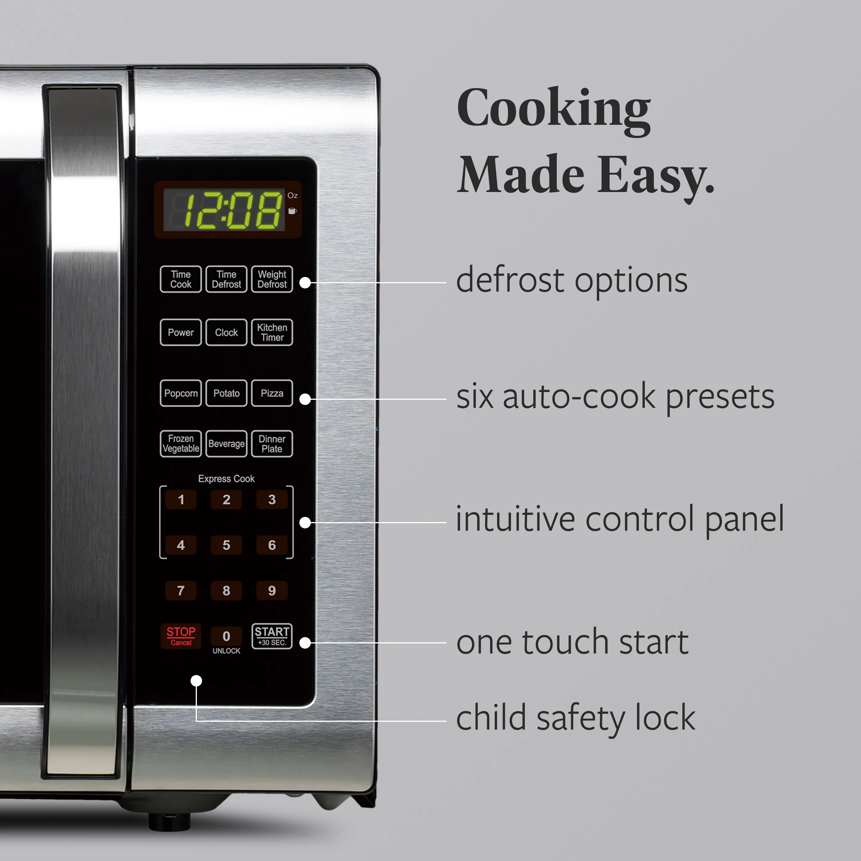This microwave oven is the ideal size for office break rooms or home kitchens. One-touch cooking programs let you cook six of the most popular food items with the touch of a button. Choose from ten power levels up to 1100. The large digital screen has a clock feature and can display a countdown timer in addition to the remaining cook time. The memory function lets you customize and save your favorite settings, and the large door has an easy-grip handle and child-safety lock.