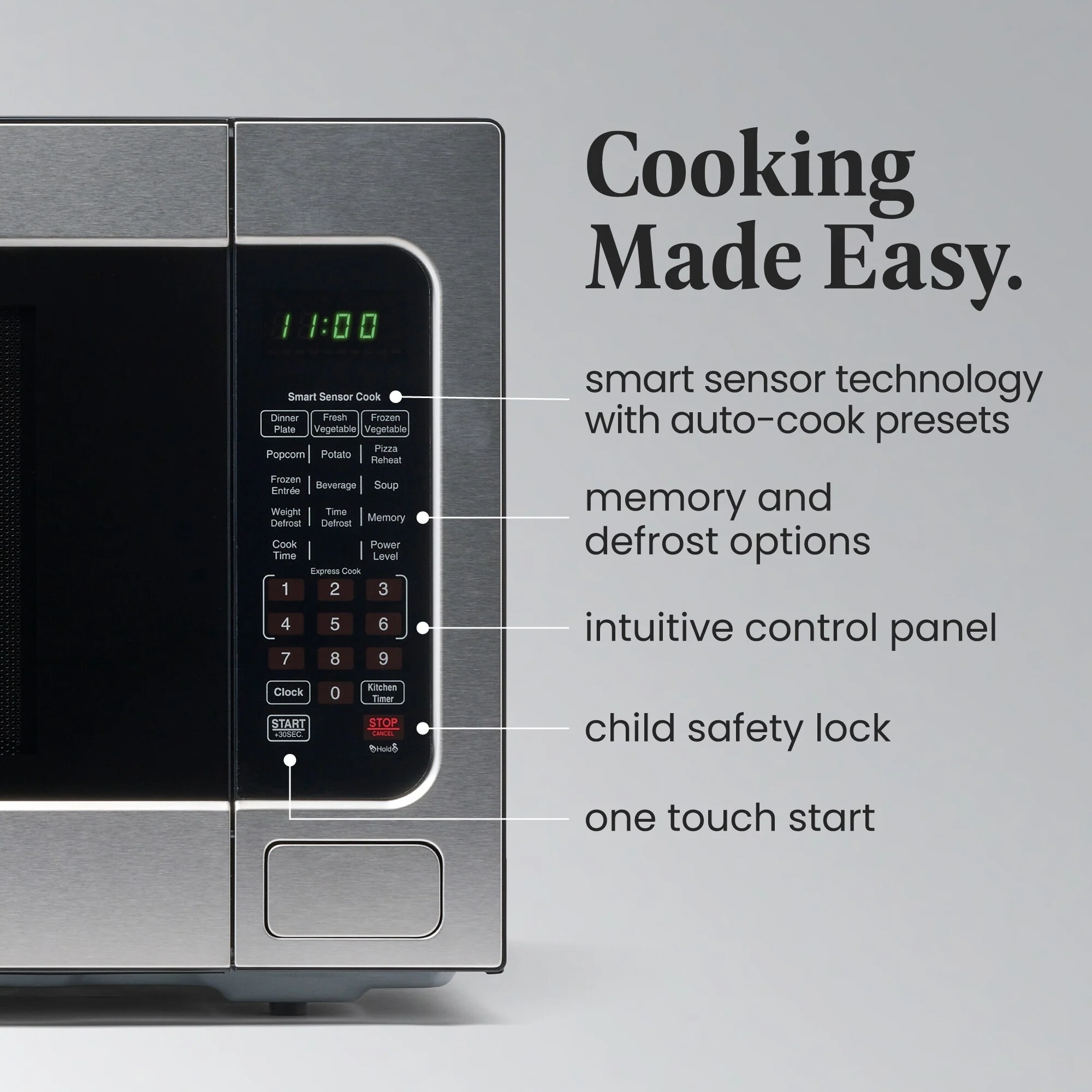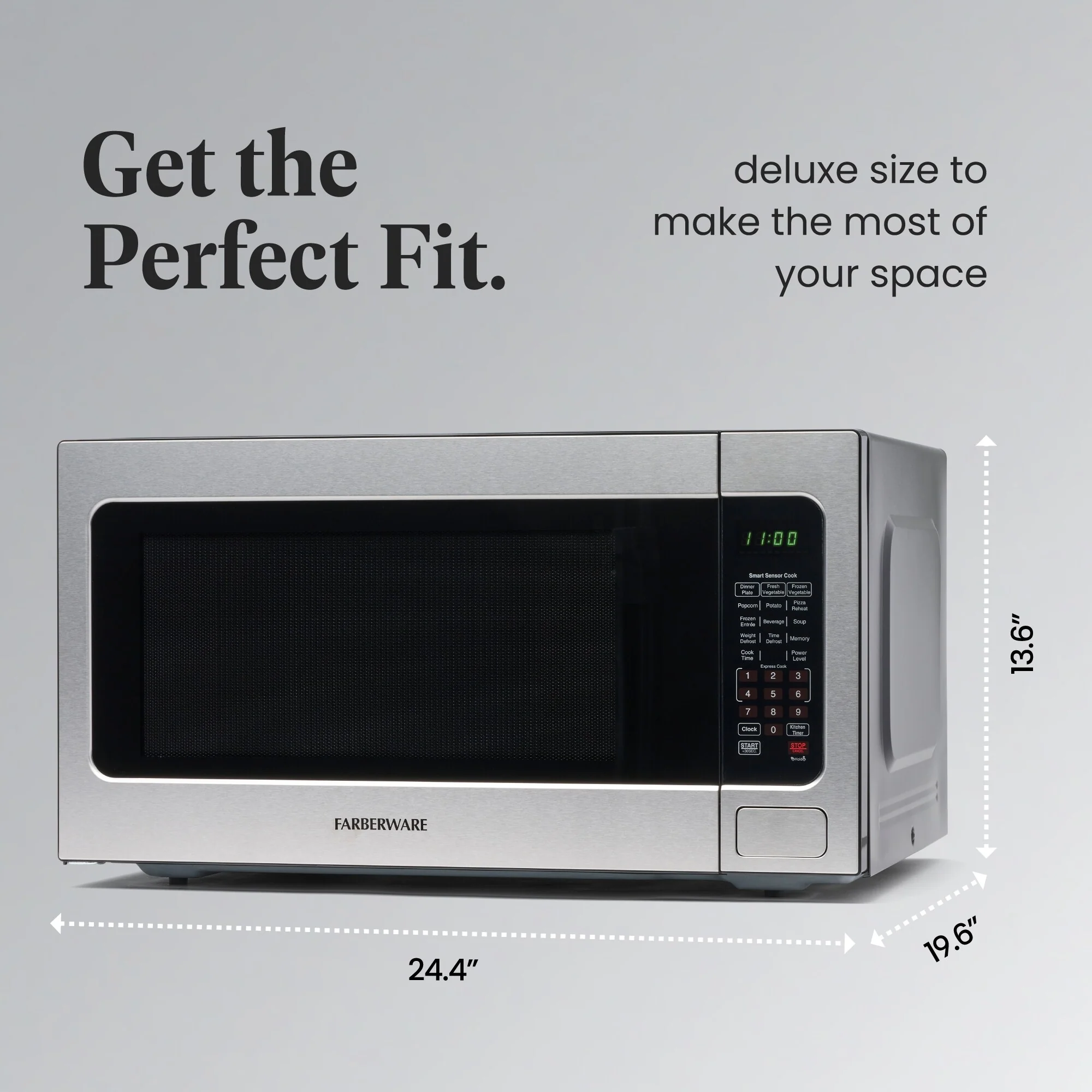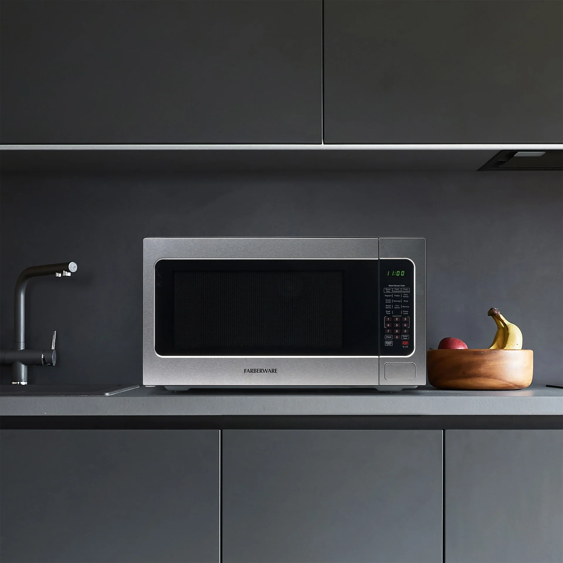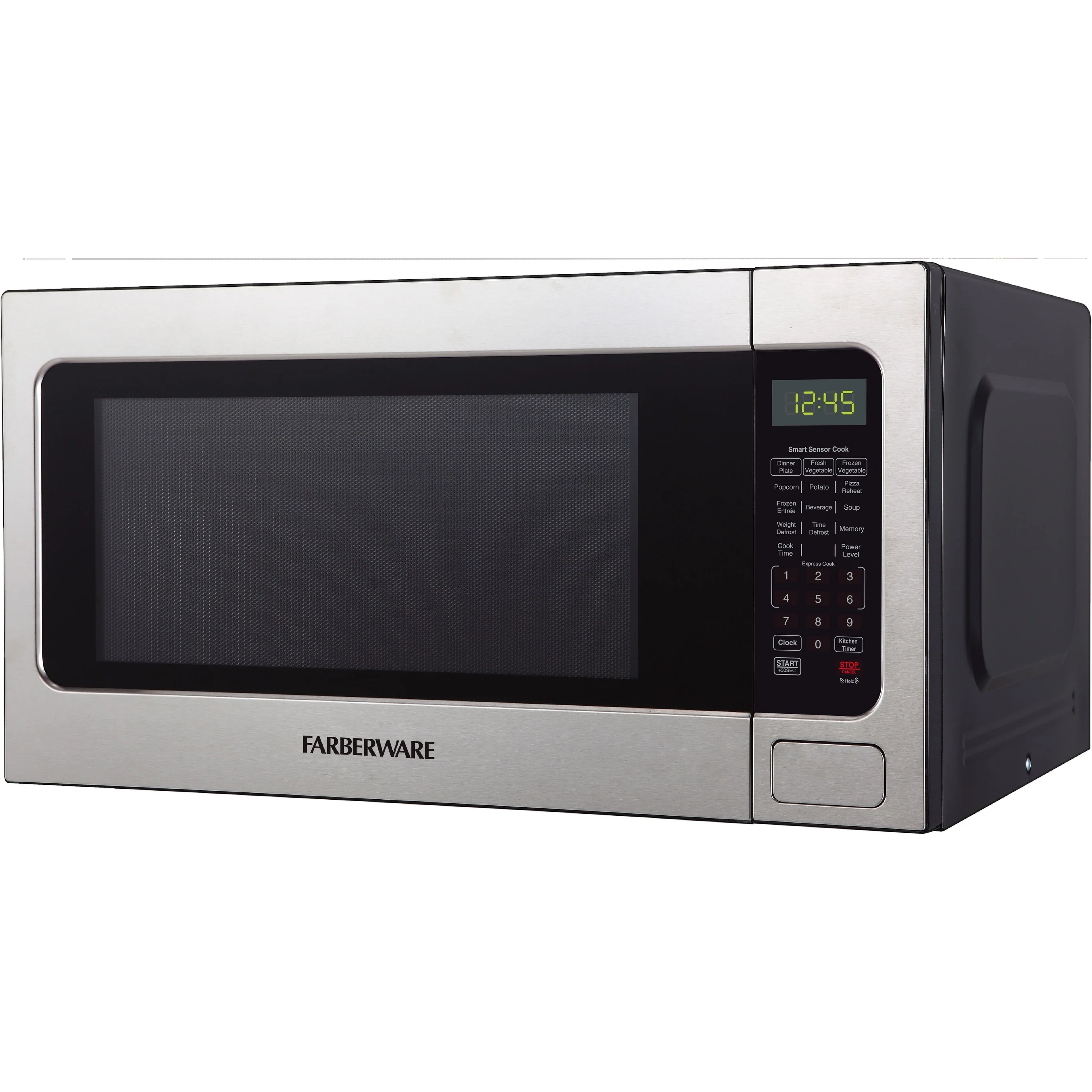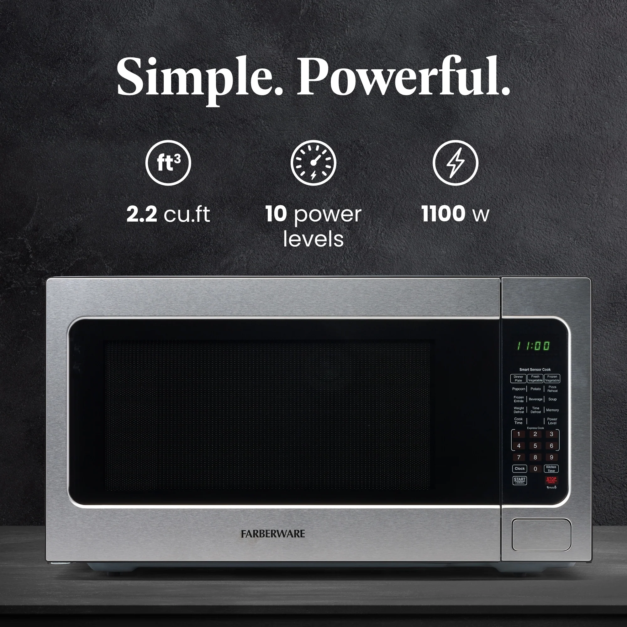 The Farberware Professional 2.2 Cubic Foot 1200 Watt Microwave Oven with Smart Sensor Cooking delivers power, style, and convenience with a sleek Stainless Steel design to complement your kitchen. With a 16.5-inch turntable, this model's roomy interior accommodates oversized dinner plates, perfect for a large family gathering. Smart Sensor cooking allows you to prepare preset menu items and reheat foods without overcooking using humidity sensors inside the microwave that determine when the food is ready. An Energy Saver power mode allows you to conserve energy when the microwave is not in active use. 7 One-Touch cooking programs allow you to heat up everyday items in seconds. Amenities such as 1 to 6 minute instant start functions, a +30-Seconds control button, 10 power control levels, and Memory Function take the guesswork out of food prep. 5 Auto-Cook pre-programmed settings including Bacon, Frozen Bread Reheat, Beverage, Chicken, and Oatmeal make you a versatile chef with little effort. The microwave includes 3 Automatic Defrost pre-programmed settings making defrosting your favorite item a cinch. Features such as 4 Melt pre-programmed options, and 3 Soften pre-programmed options set this microwave apart from the rest. Additional features include a blue LED display with kitchen timer and clock as well as a child safety lock function to prevent accidental operation.Premium Stainless Steel front design with push button door releaseSmart Sensor cooking functionLarge 16.5-Inch turntableEnergy Saver power save mode7 One-Touch cooking programs: Sensor Reheat, Frozen Pizza, Frozen Entrée, Potato, Rice, Vegetable, and Popcorn5 Auto-Cook pre-programmed settings: Bacon, Frozen Bread Reheat, Beverage, Chicken, and Oatmeal3 Auto Defrost pre-programmed settings: Meat, Poultry, and Fish4 Melt pre-programmed cooking options: Butter/Margarine, Chocolate, Cheese, and Marshmallows3 Soften pre-programmed cooking options: Butter, Ice Cream/Frozen Juice, and Cream Cheese1-6 minute Express Cooking function and +30-Seconds control button for added cook timeMemory Function for customized settingsBlue LED display