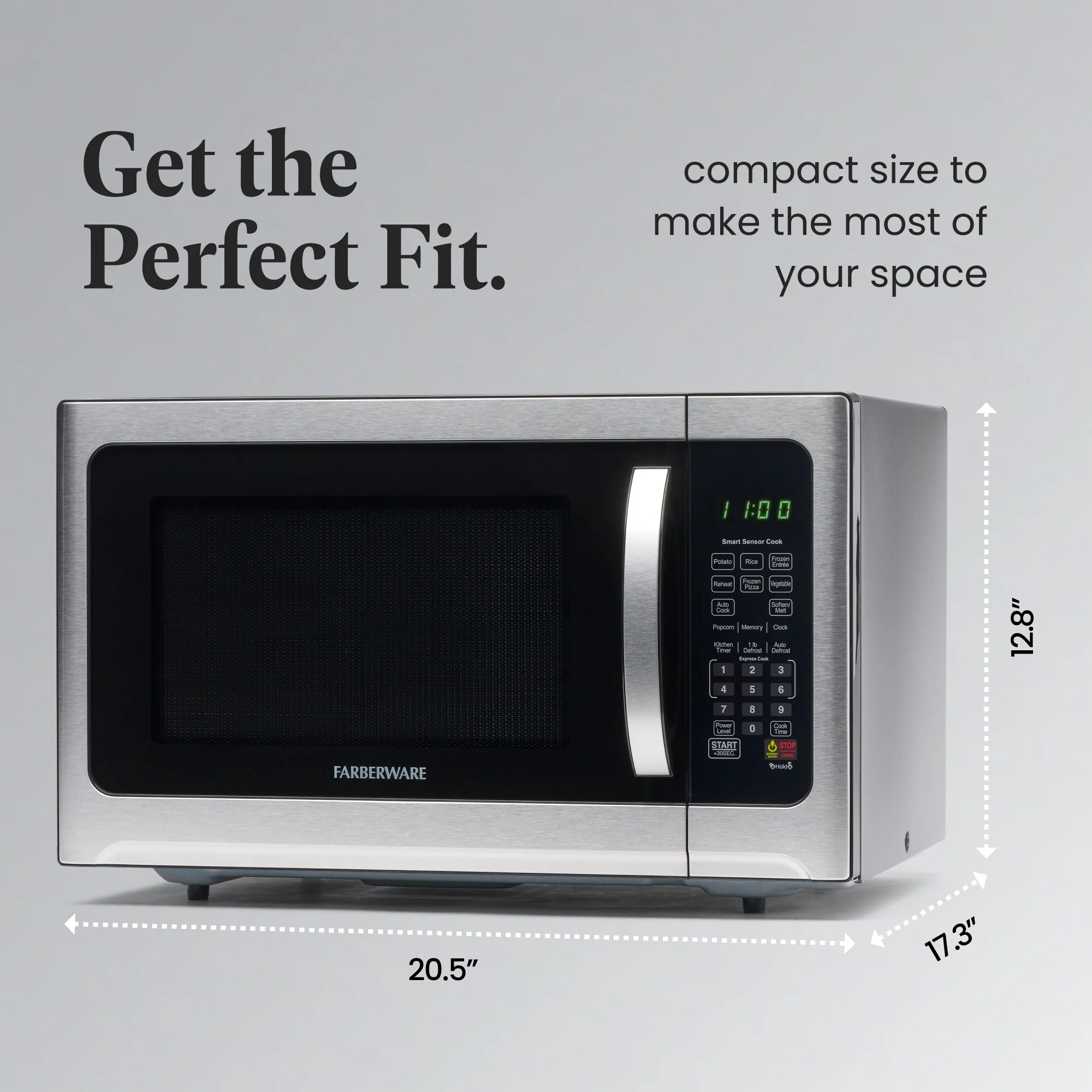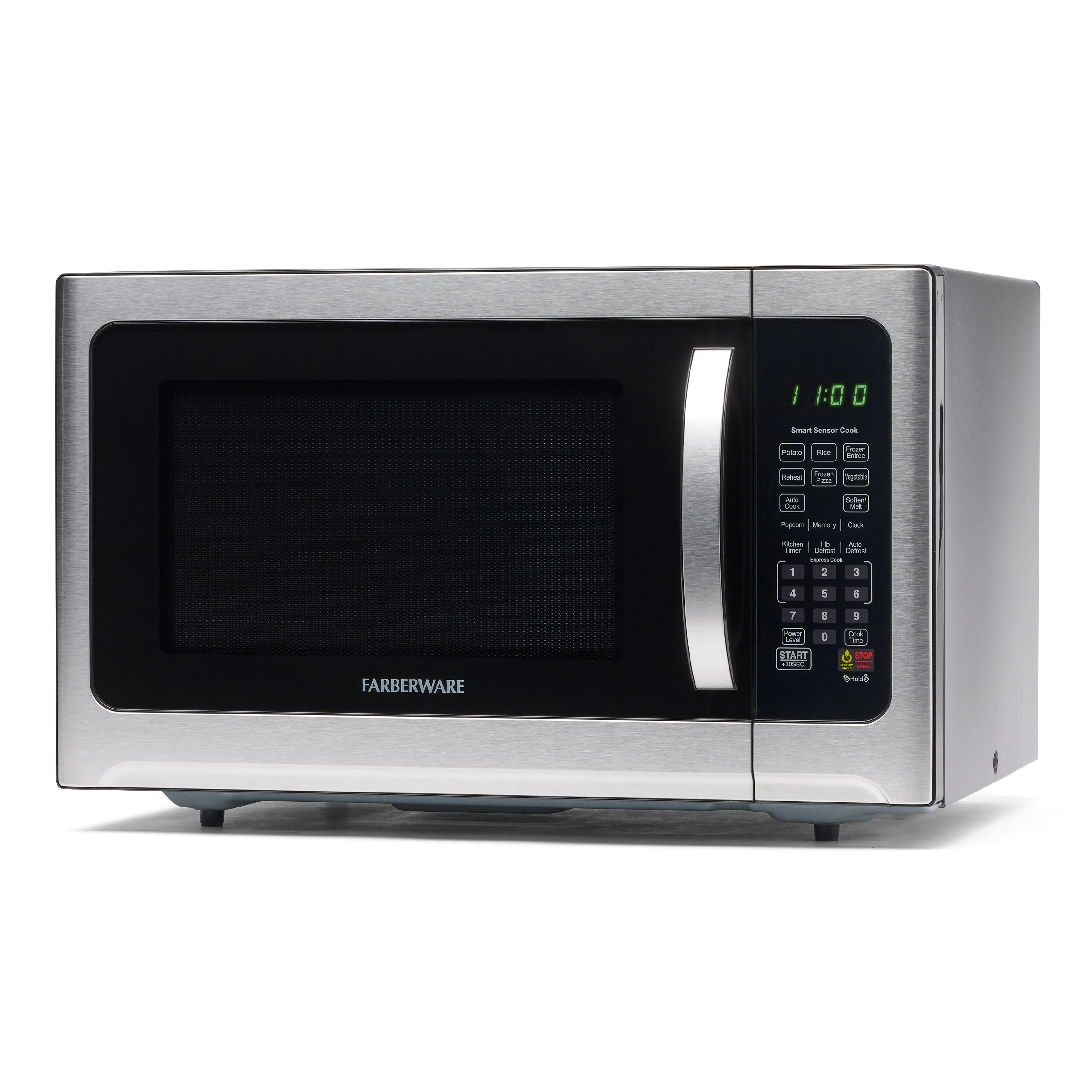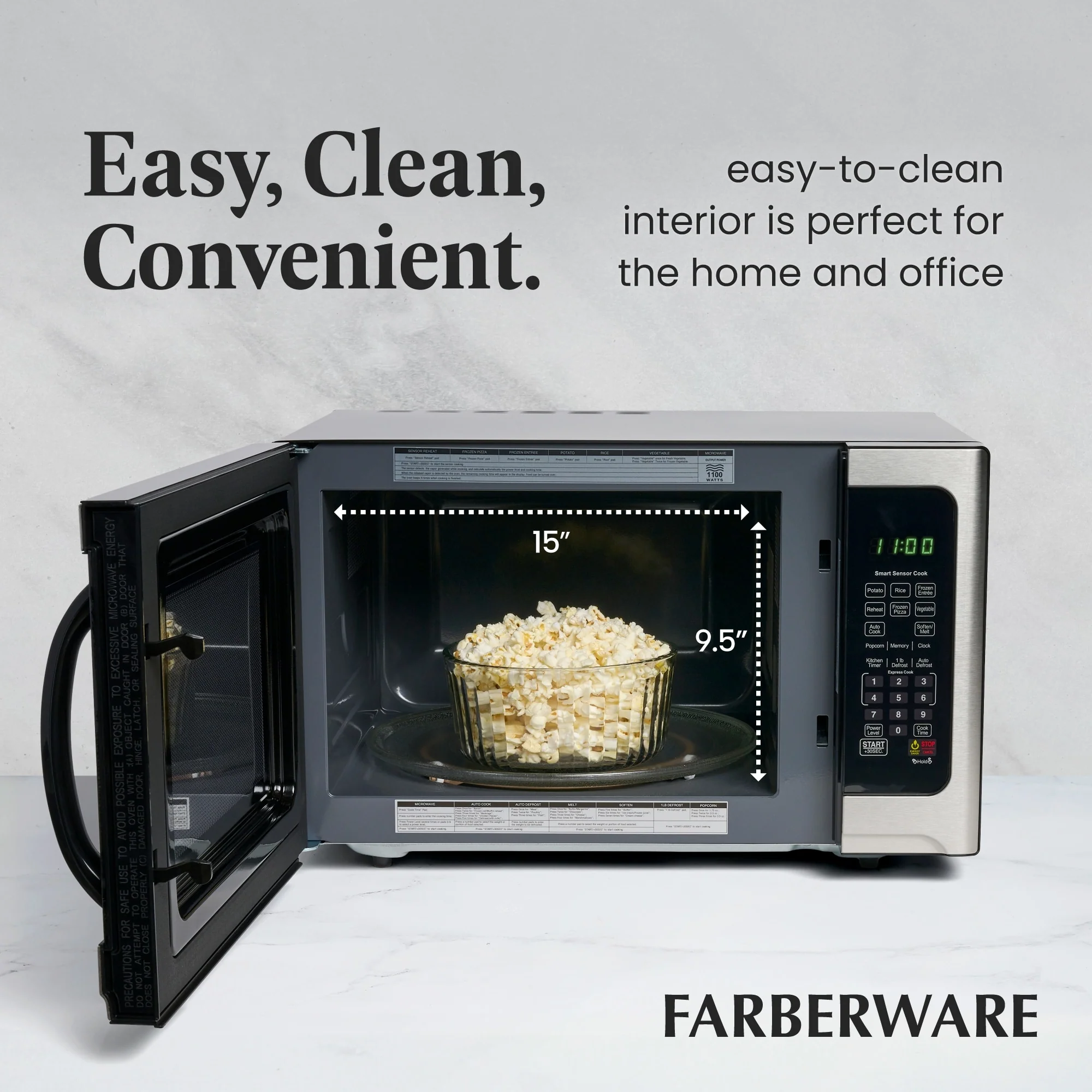 The Farberware Professional 1,000 Watt Microwave oven is the ideal size for office break rooms or home kitchens. One-touch cooking programs let you cook six of the most popular food items with the touch of a button. Choose from ten power levels up to 1000. The large digital screen has a clock feature and can display a countdown timer in addition to the remaining cook time. The memory function lets you customize and save your favorite settings, and the large door has an easy-grip handle and child-safety lock.