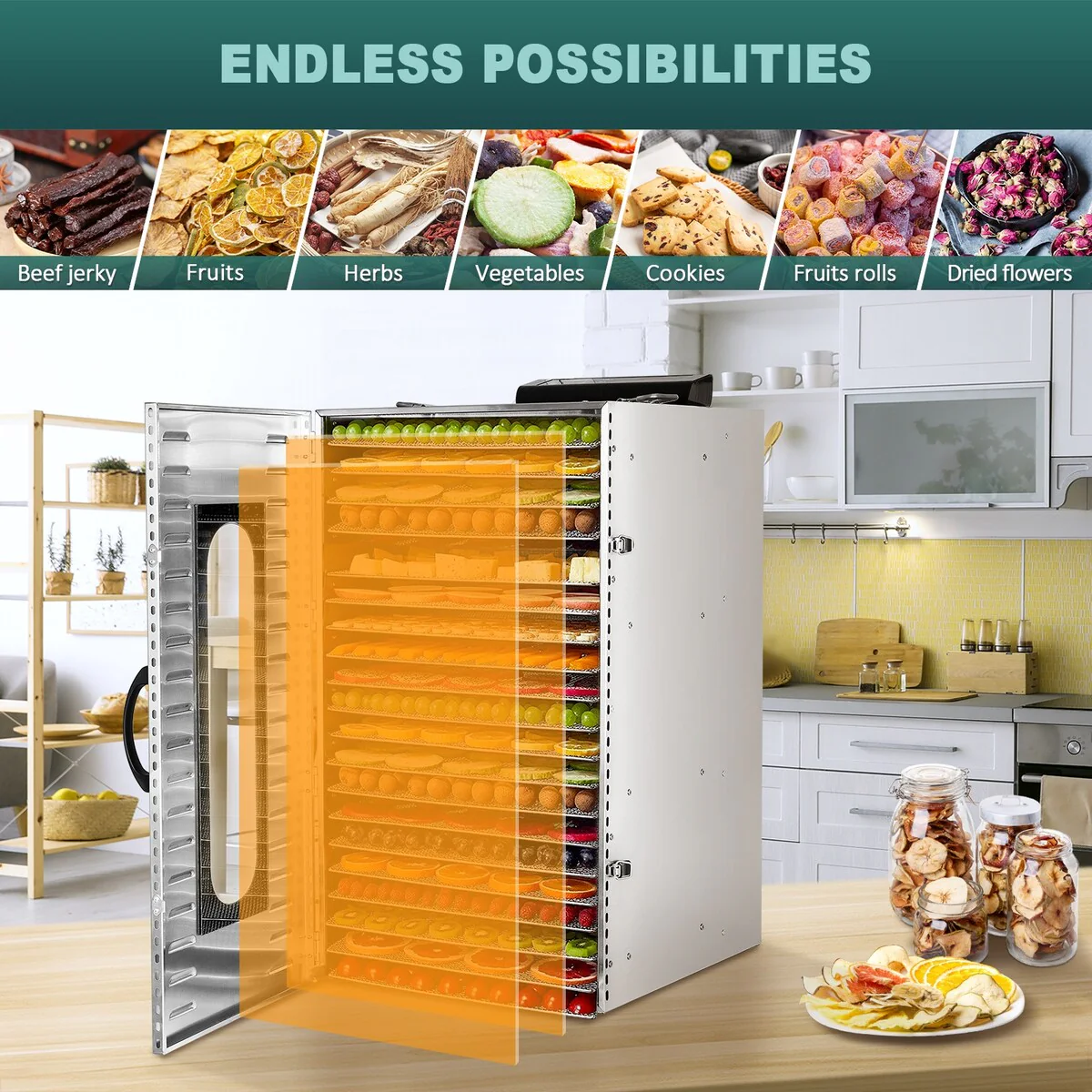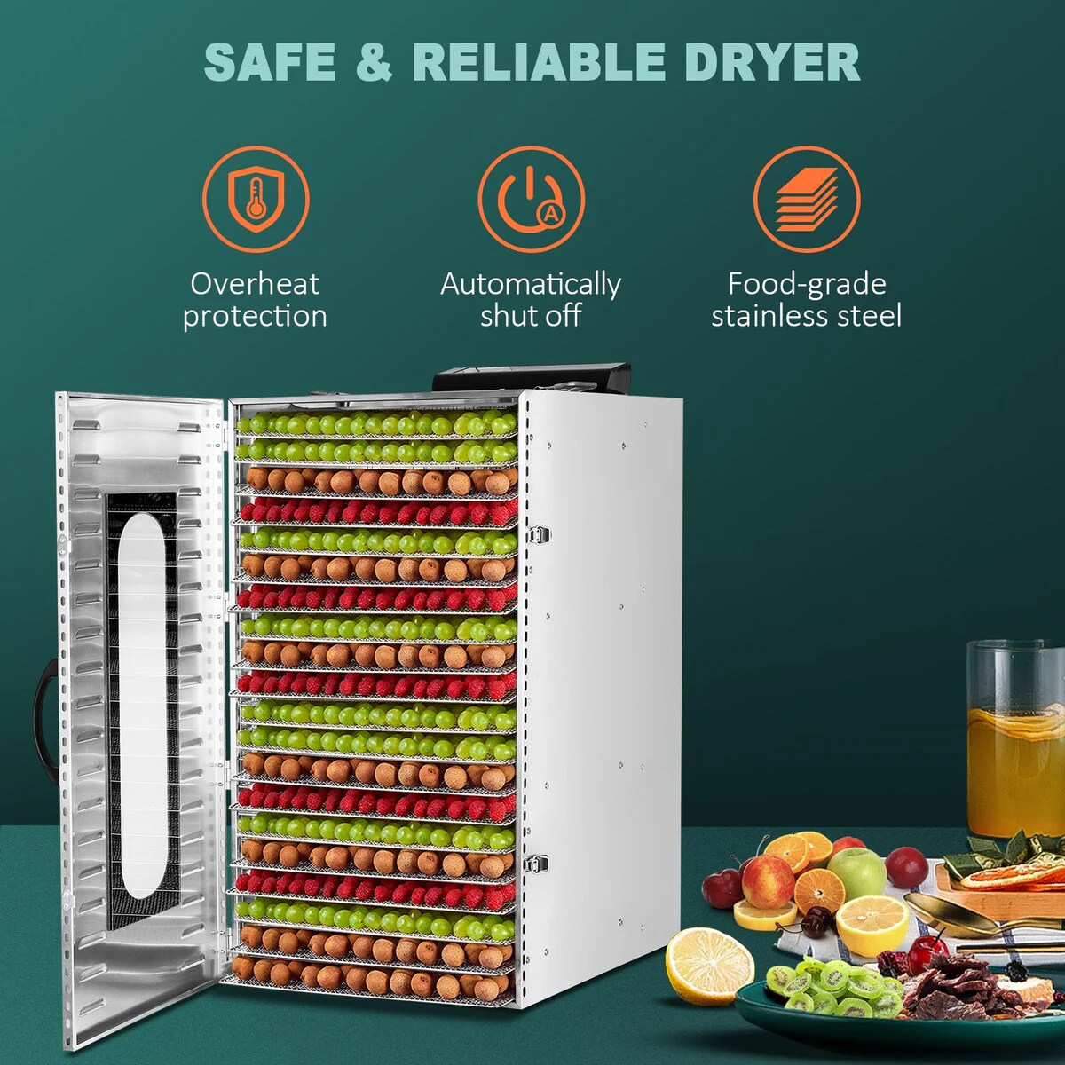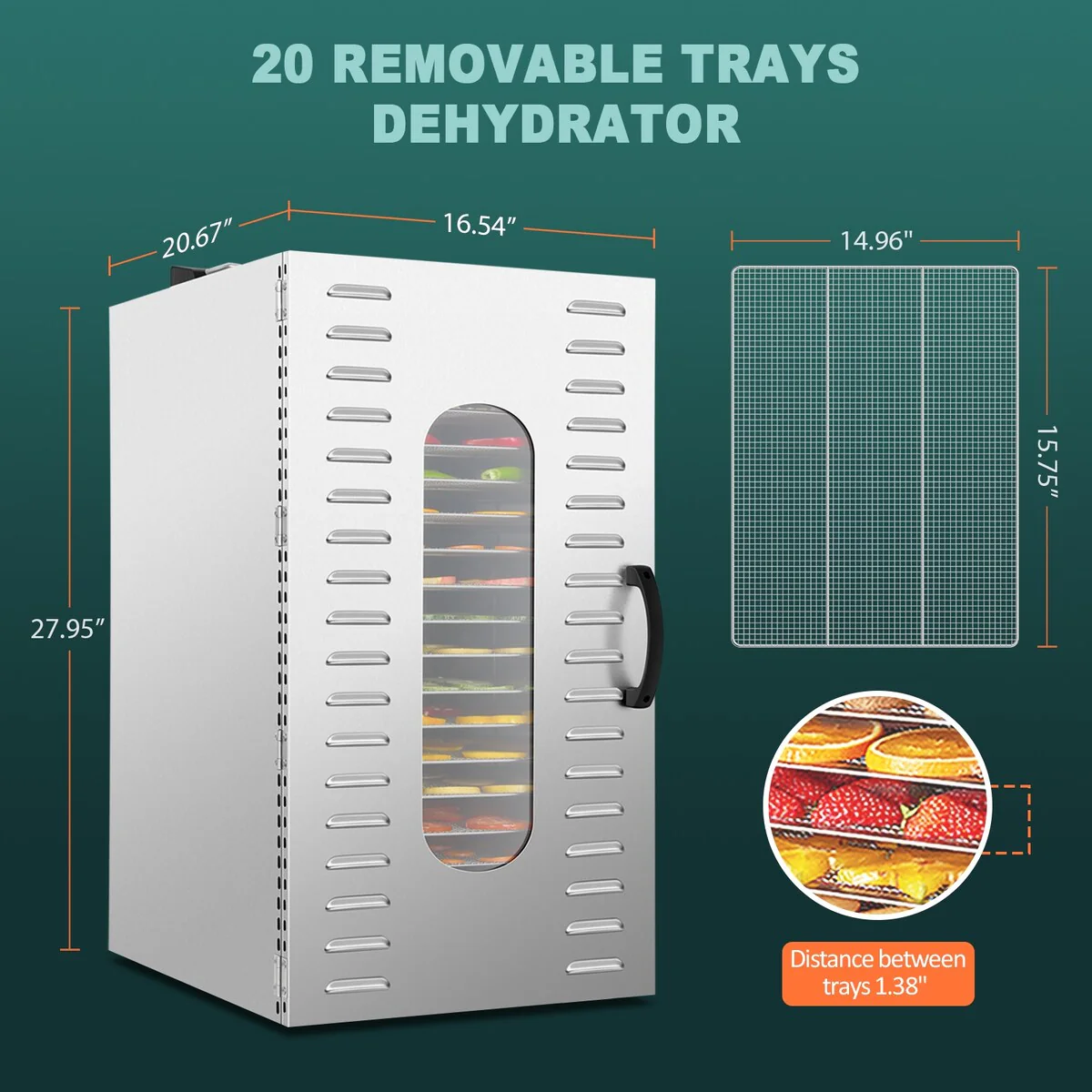 - 🍇【Commercial & Large Capacity】 Our food dehydrator is equipped with 20 stainless steel trays. It can dry many different kinds of food at one time, such as meat, vegetables, fruits, etc. You can choose according to your own needs. The large capacity food dehydrator is very suitable for business use.