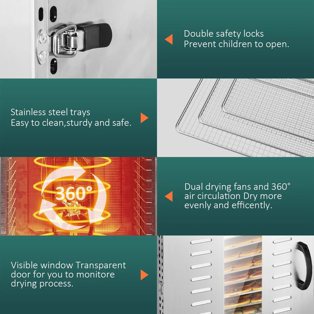 - 🍇【Stainless Steel】 Our food dehydrator is made of food grade stainless steel with good heat insulation, which can not only keep the taste and nutrition of food, but also easily make safe and safe healthy food.