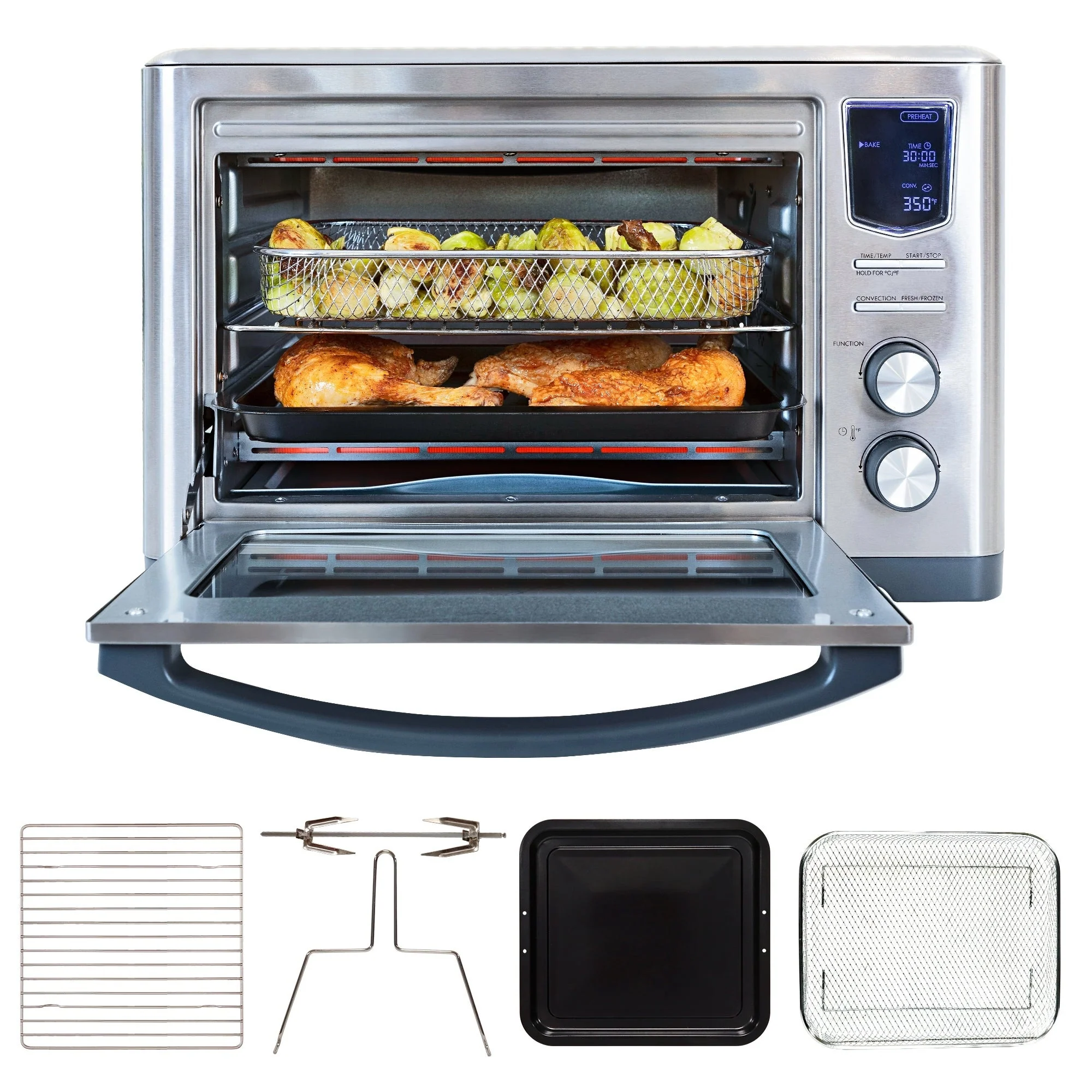 With intuitive controls, 11 one-touch presets including Bake, Air Fry, Slow Cook, Rotisserie & Dehydrate, and 2-speed convection fan, this versatile family-size toaster oven air fryer will transform the way you cook. Generous 25-qt capacity lets you toast 6 slices of bread, reheat a 12' pizza, or even roast a 5-lb chicken. Featuring ultra-fast preheating and dishwasher-safe accessories, this stainless steel countertop oven may just become your favorite kitchen appliance.
