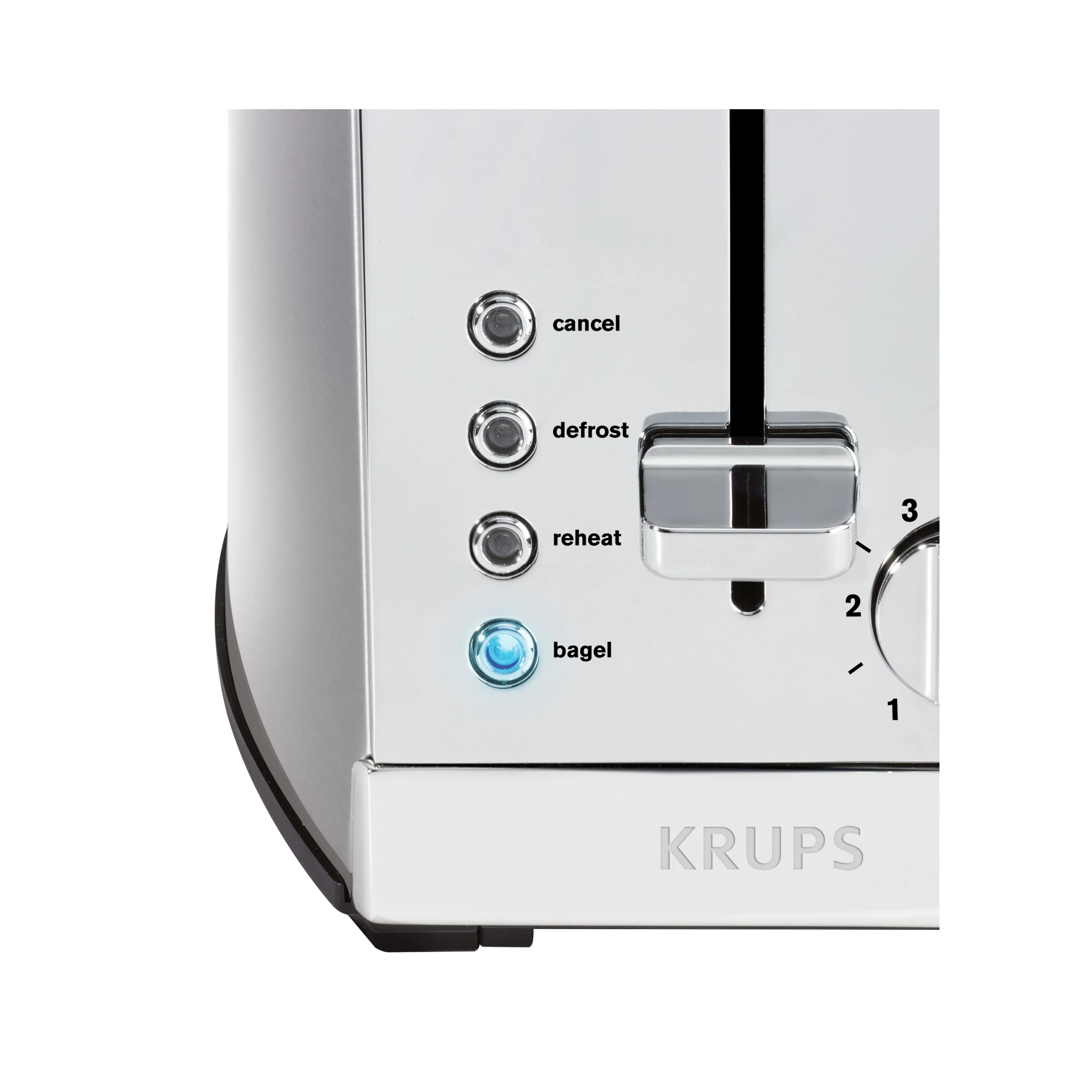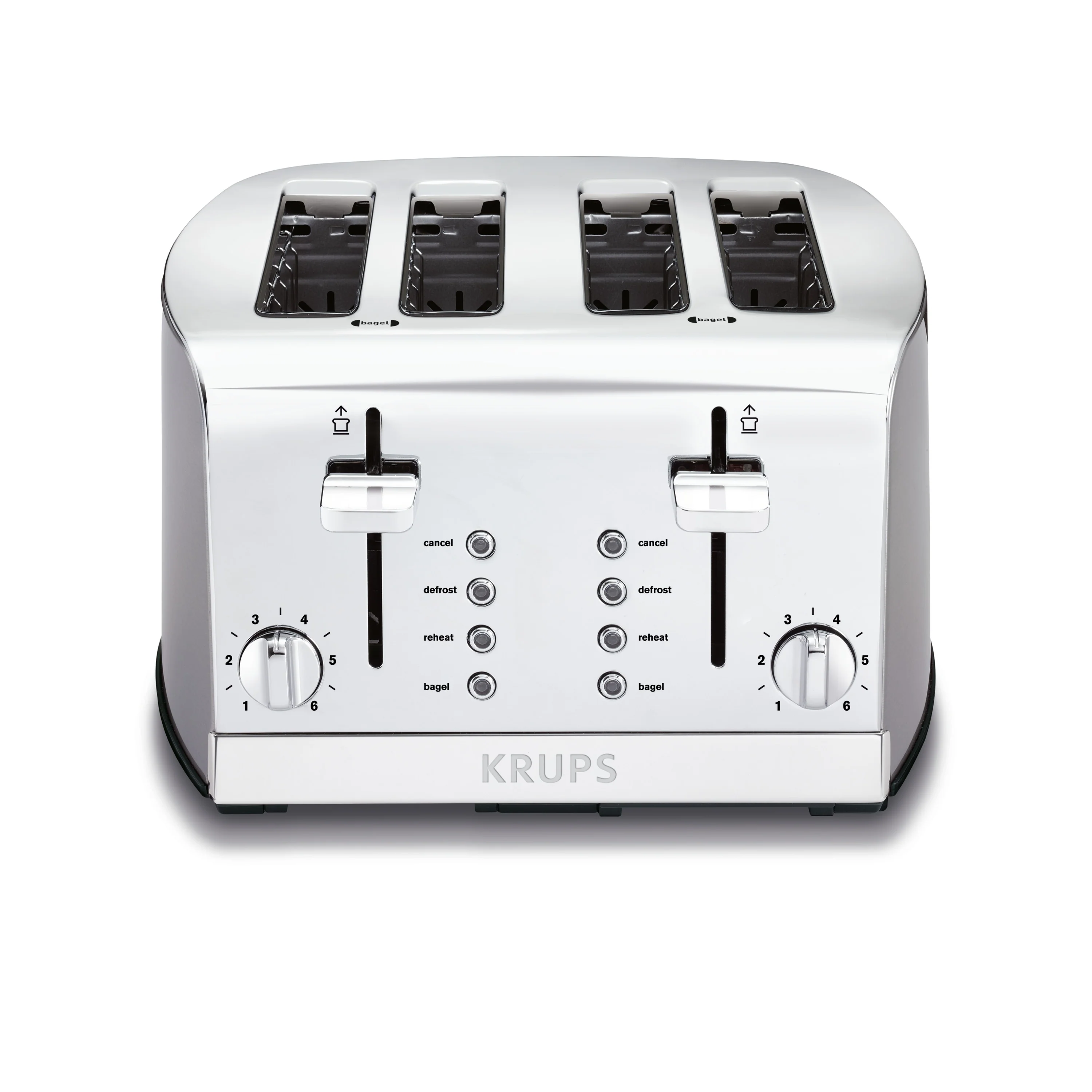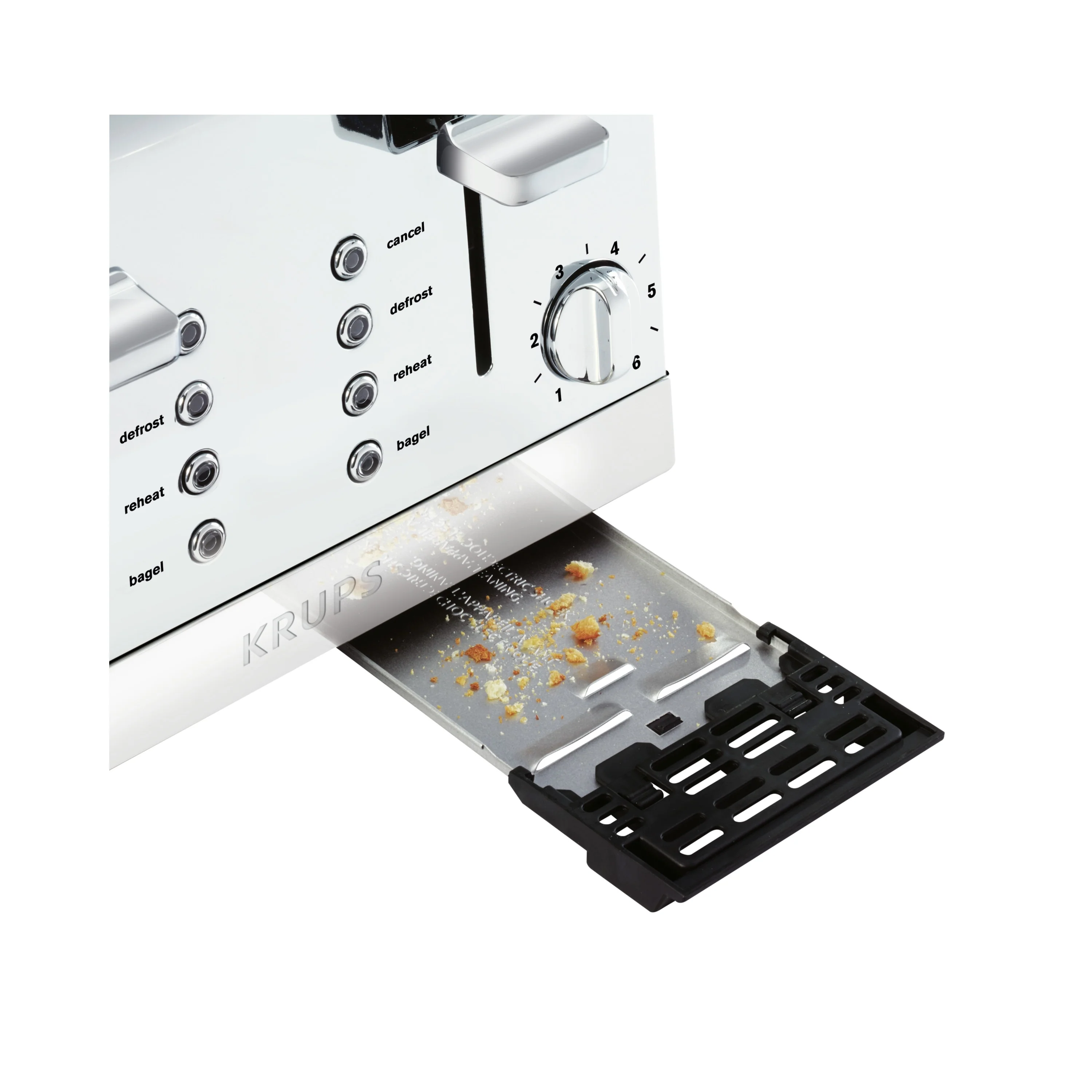 Equipped with enhanced features for outstanding customization, the new KRUPS 4-Slice Toaster gives your breakfast an upgrade, with enough for the whole family. A rotating knob with six browning levels comes together with extra-deep slots, for precise and perfectly even browning results that cover the entire slice. An integrated high-lift lever lets you easily remove your toast or bagel in total safety. Additional features include a 30-second reheat function, a defrost setting and a bagel setting for flawless toasting of bagels. Rounding it all off is a removable rear crumb tray for easy clean-up. This stainless steel toaster is the perfect way to start your day, with a hot, crunchy breakfast toasted to golden-brown perfection.