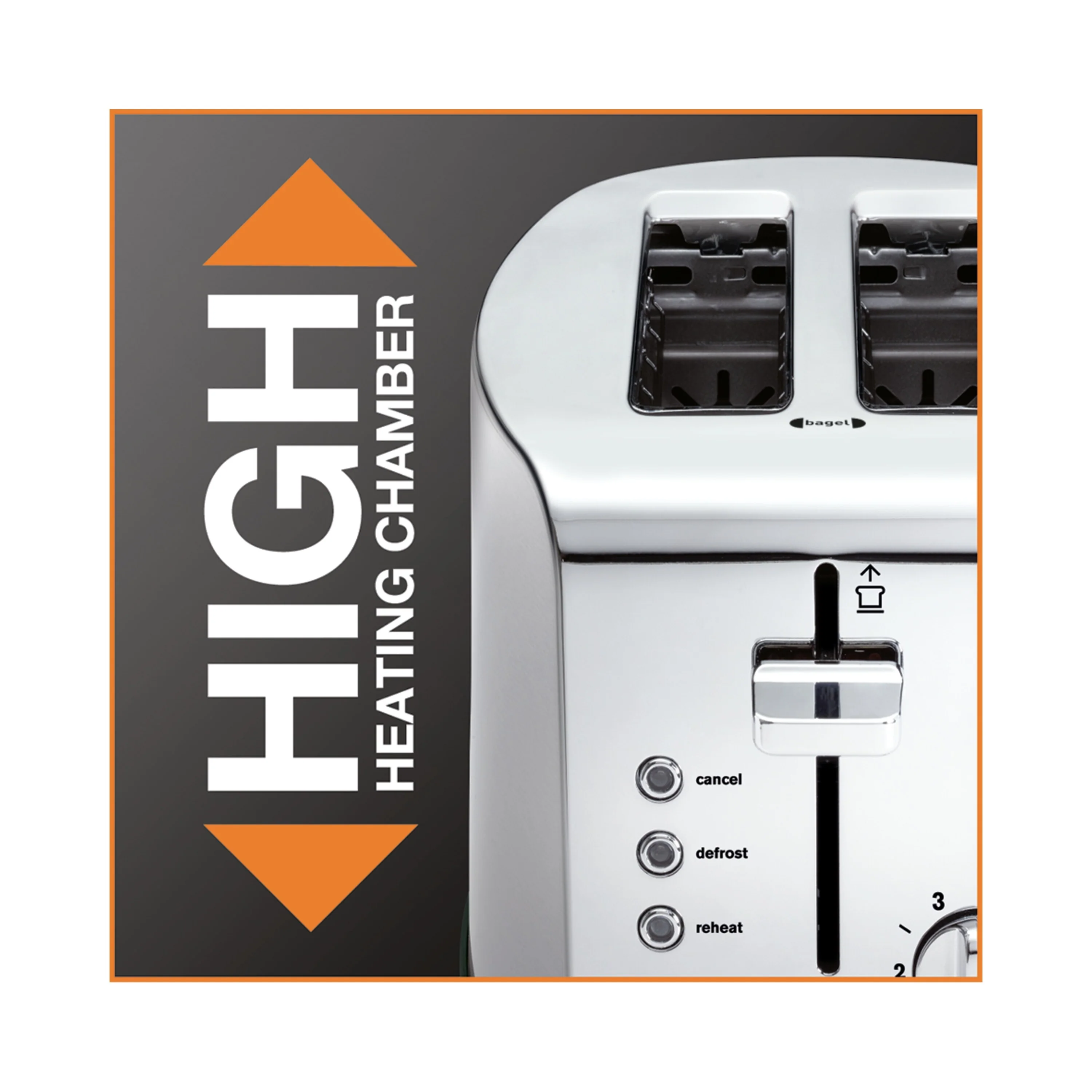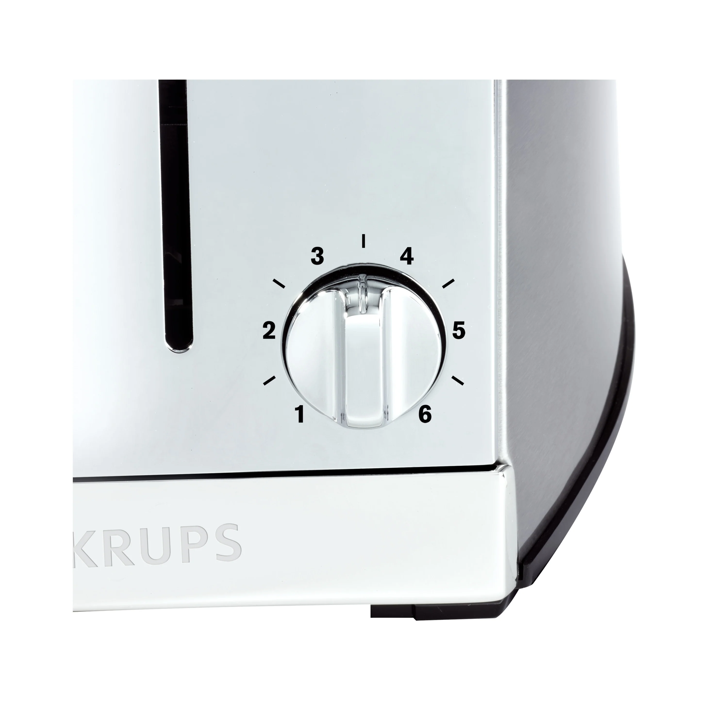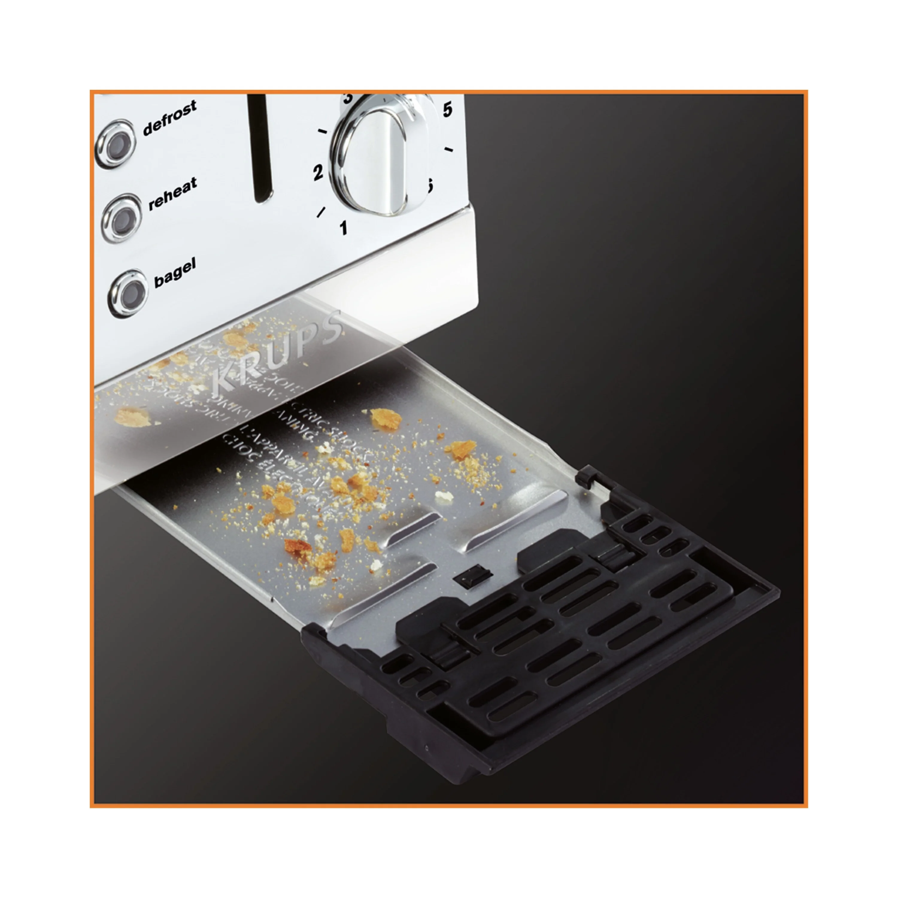 Equipped with enhanced features for outstanding customization, the new KRUPS 4-Slice Toaster gives your breakfast an upgrade, with enough for the whole family. A rotating knob with six browning levels comes together with extra-deep slots, for precise and perfectly even browning results that cover the entire slice. An integrated high-lift lever lets you easily remove your toast or bagel in total safety. Additional features include a 30-second reheat function, a defrost setting and a bagel setting for flawless toasting of bagels. Rounding it all off is a removable rear crumb tray for easy clean-up. This stainless steel toaster is the perfect way to start your day, with a hot, crunchy breakfast toasted to golden-brown perfection.