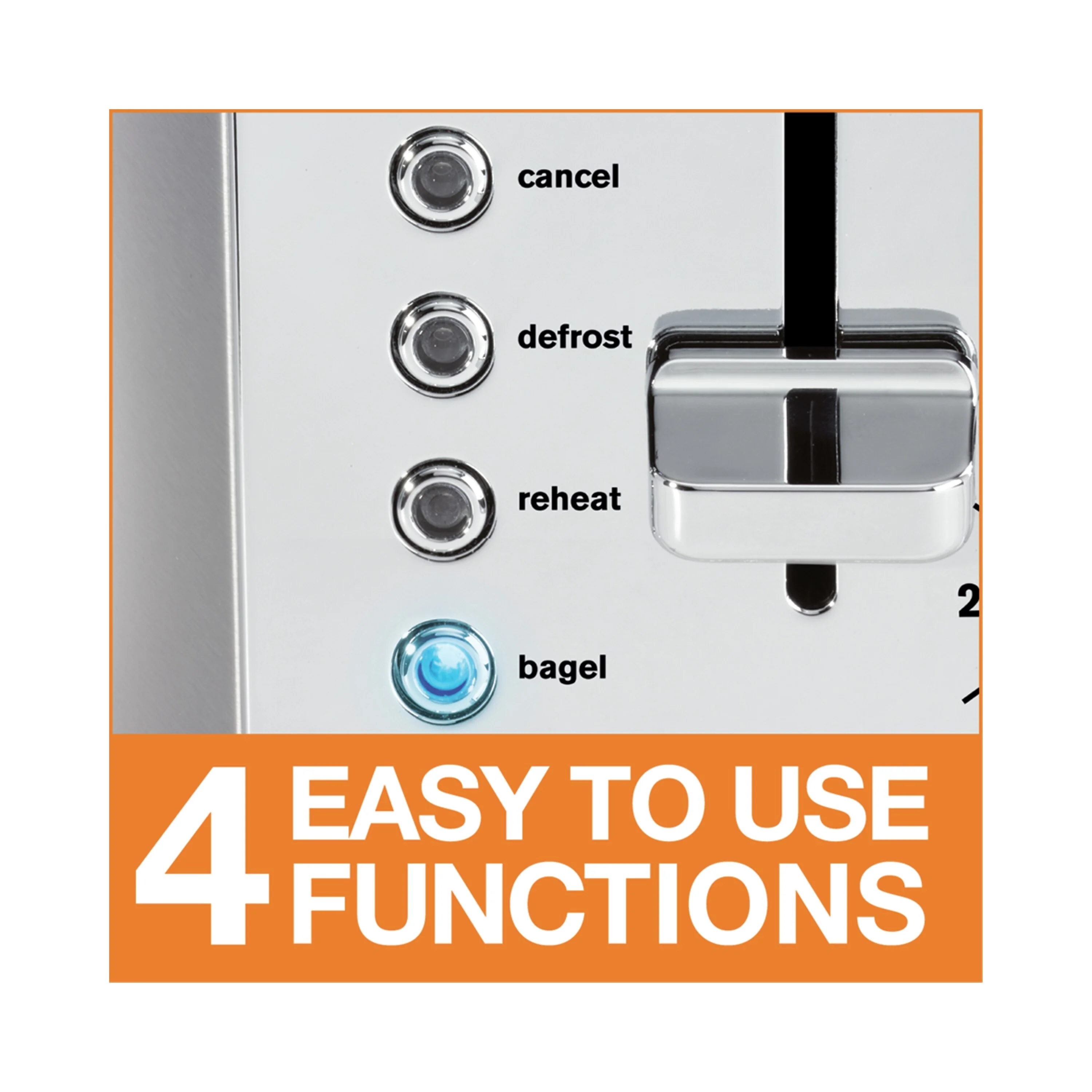 - Customized browning with enhanced features: CANCEL stops toasting any time. DEFROST enables toasting frozen bread. REHEAT provides 30 seconds of toasting, and BAGEL produces crisp results all the way through.
