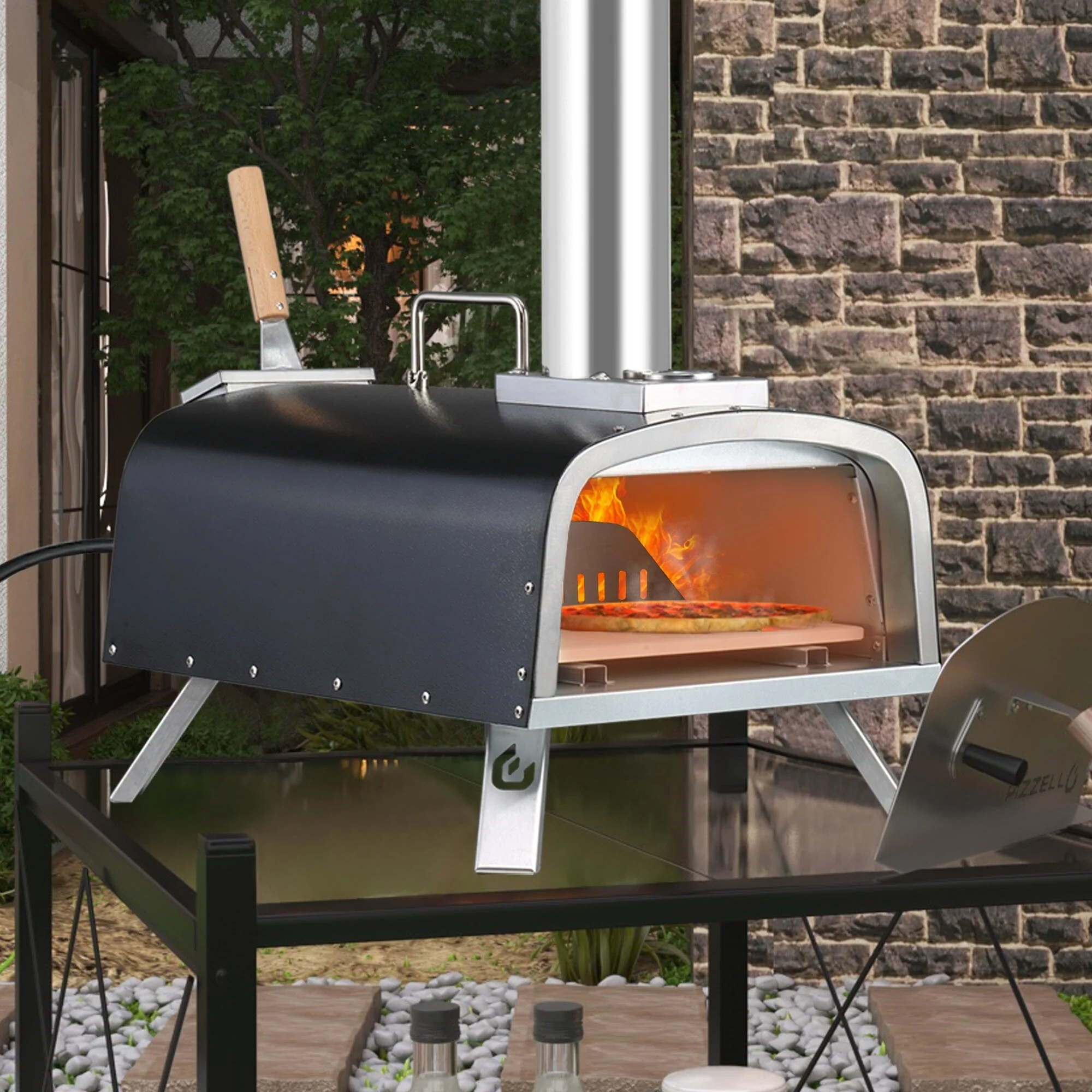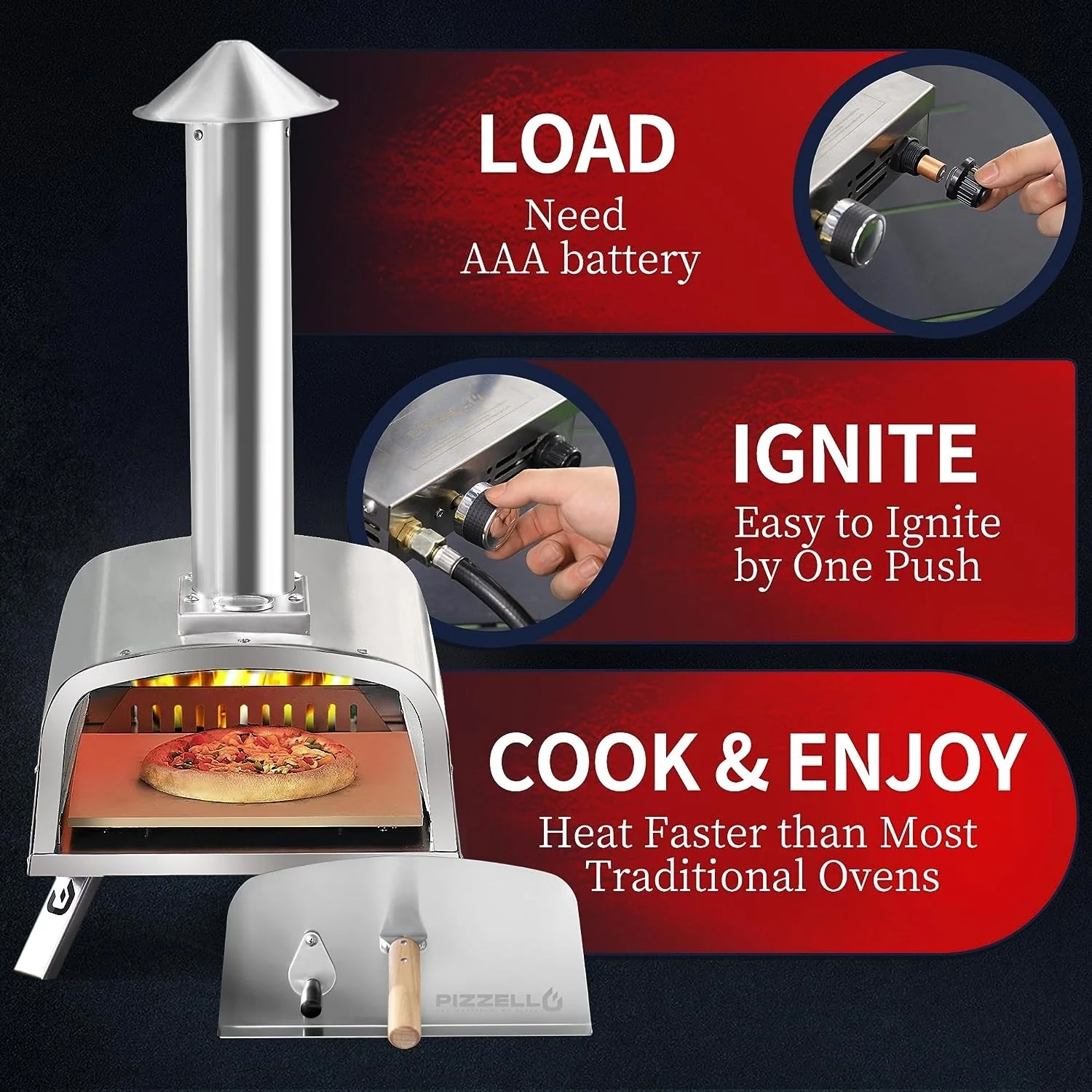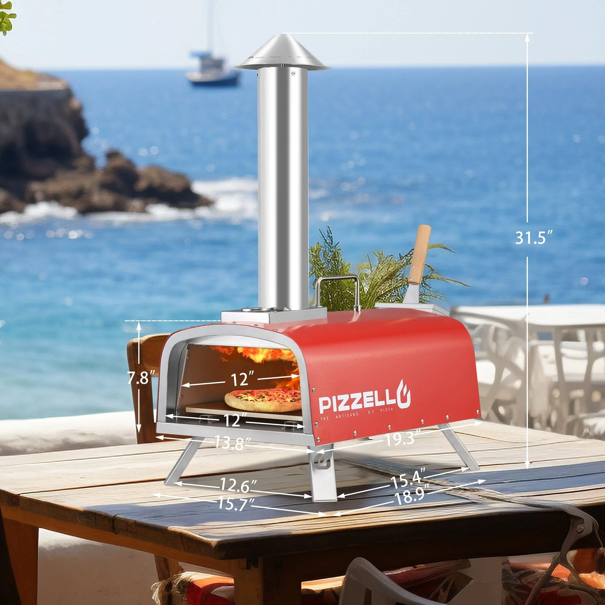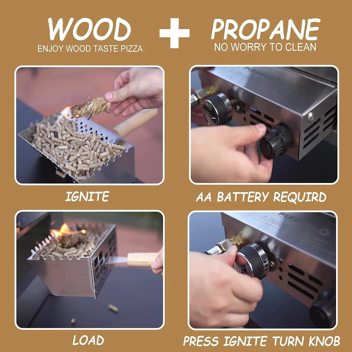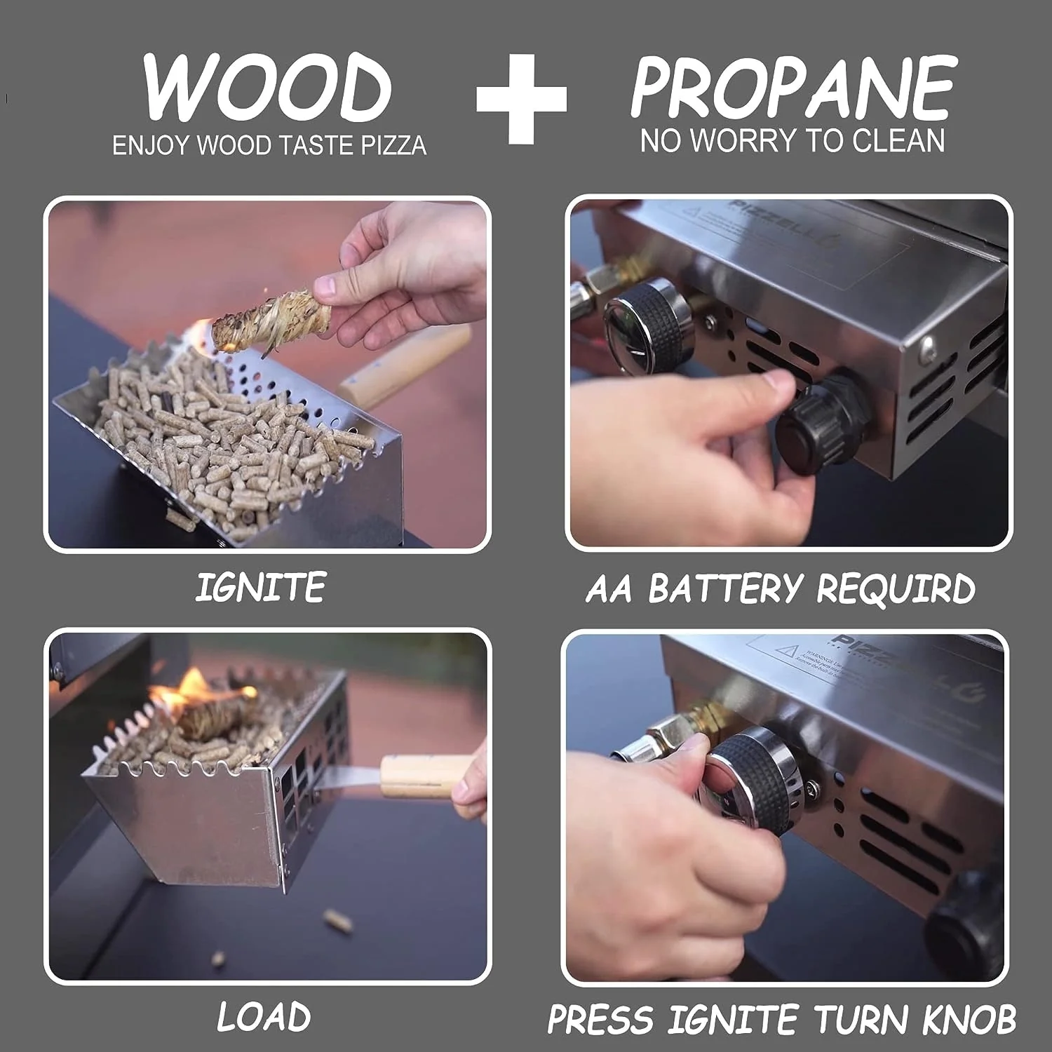 Our 12' ourdoor pizza oven features dual-fuel burners (propane and wood), can reach 752℉ in just 25-30 mins, cooking pizzas in 60 seconds. The portable pizza oven is ideal for parties and camping with fold-up legs and a detachable chimney. This dual-fuel pizza maker includes gas burner, pizza peel, stone, wood tray, and carry bag. This excellent gas pizza oven is a good gift choice for Christmas and other festivals.