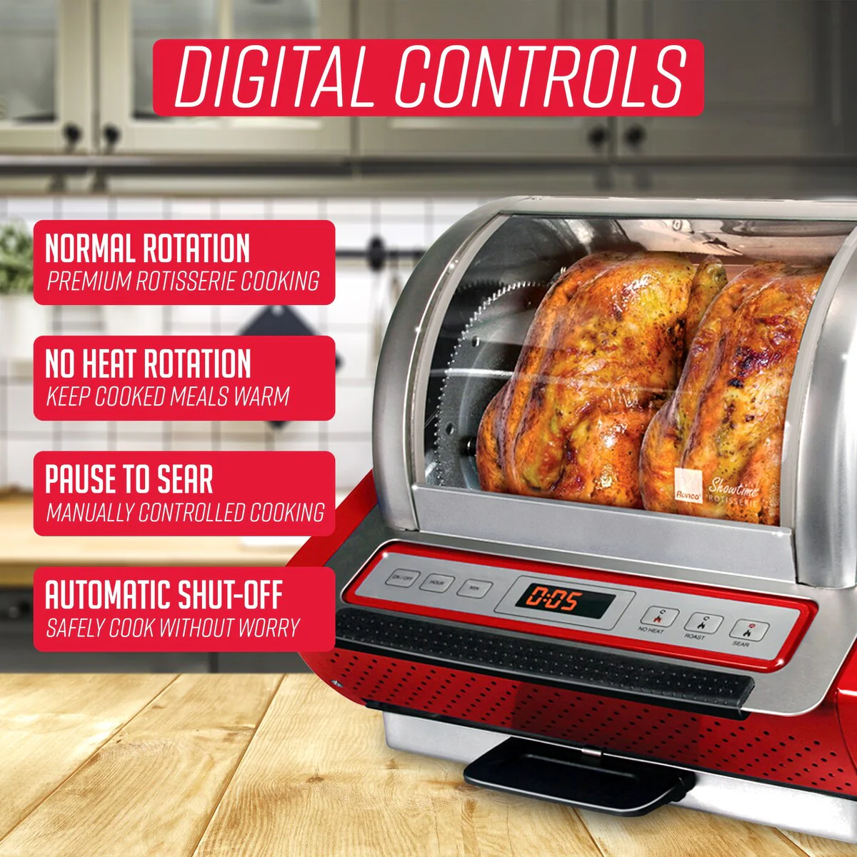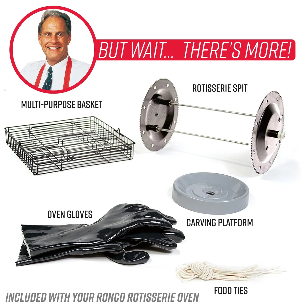 Cook like a gourmet with the Ronco Showtime E-Z Store Rotisserie Oven. Make perfectly roasted chickens, turkey, pork, roasts, and burgers that are delicious and healthy too. Its large capacity accommodates a 12-pound turkey or 2 whole chickens while still fitting on your countertop! The three cooking options allow you to Roast with normal rotisserie rotation, Sear to pause rotation and stop food in front of the heating element, and No Heat Rotation to keep juices evenly distributed before serving. An adjustable timer will automatically shut-off when cooking time is up which means no more worrying about overcooked food. The included multipurpose basket accommodates a variety of food including burgers, sausages, fish & vegetables so can roast a variety of foods with the ease of a rotisserie oven. Ronco rotisserie ovens feature dishwasher safe parts for easy clean up. For easy storage, the rotisserie's feet fold in and accessories nest directly inside the oven, so it is easily stored in standard cabinets or drawers when not in use. LARGE CAPACITY OVEN: The interior is large enough to cook up to a 12 lb turkey or 2 whole chickens at a time. The unit measures 15.75 in. D x 17.25 in. W x 12.75 in. H EZ-STORE ROTISSERIE: The rotisserie's feet fold in with the push of a button while the door and accessories store inside the oven, breaking down to only 8 inches tall so it can easily store in standard cabinets and drawers when not in use. SELF-BASTING ROTATION: The classic Ronco rotisserie design locks in flavor and seals in natural juices while the removable heat reflector helps brown meat to perfection giving you tender, mouthwatering rotisserie chicken at home, anytime DIGITAL COOKING CONTROLS: With three simple digital control settings, Roast, Sear, and No Heat Rotation, the unique Ronco Showtime EZ-Store Rotisserie has the perfect preset temperature and rotation speed to evenly brown foods. No guesswork needed! HEALTHY & DELICIOUS: Rotisserie cooking seals in flavors while unwanted fat and grease melts away so you are left with deliciously moist, flavorful, healthier poultry and roasts. Perfect for preparing Keto friendly, low carb meals AUTO SHUTOFF: An adjustable, 3 hour timer makes the Ronco Showtime EZ-Store Rotisserie Oven as easy as ever to use and will automatically shut off when time is up so you don't have to worry about overcooked foods MORE THAN CHICKEN: The included multi-purpose basket lets you enjoy deliciously roasted foods such as fish, vegetables, hamburgers, sausages and more while taking advantage of the hands-off simplicity of the rotisserie oven SIMPLE CLEAN UP: The oven's interior surface wipes clean with a damp cloth while the removable glass door and drip pan are dishwasher safe so clean up is as effortless as the cooking! EZ-STORE ROTISSERIE INCLUDES: Ronco EZ-Store Rotisserie Oven with digital controls, multi-purpose basket, rotisserie spit, carving platform, removable drip tray, oven gloves, food ties