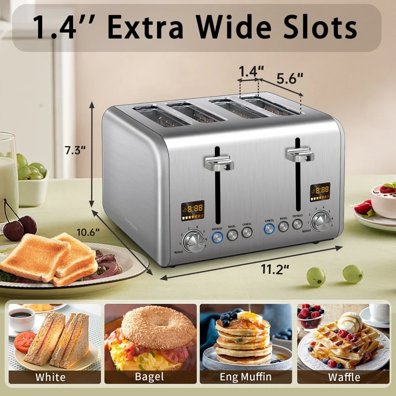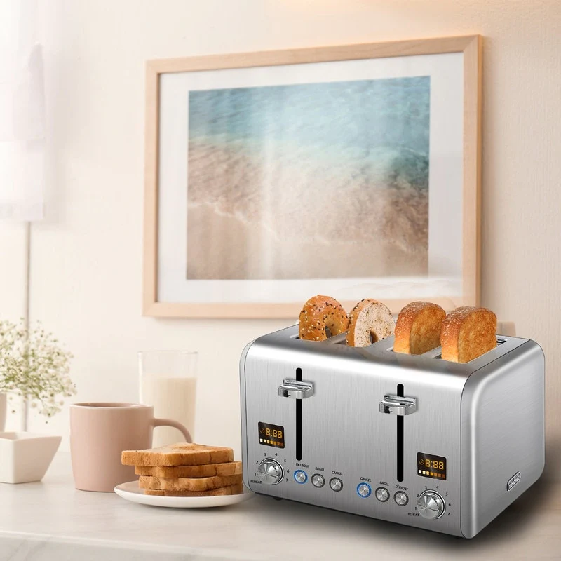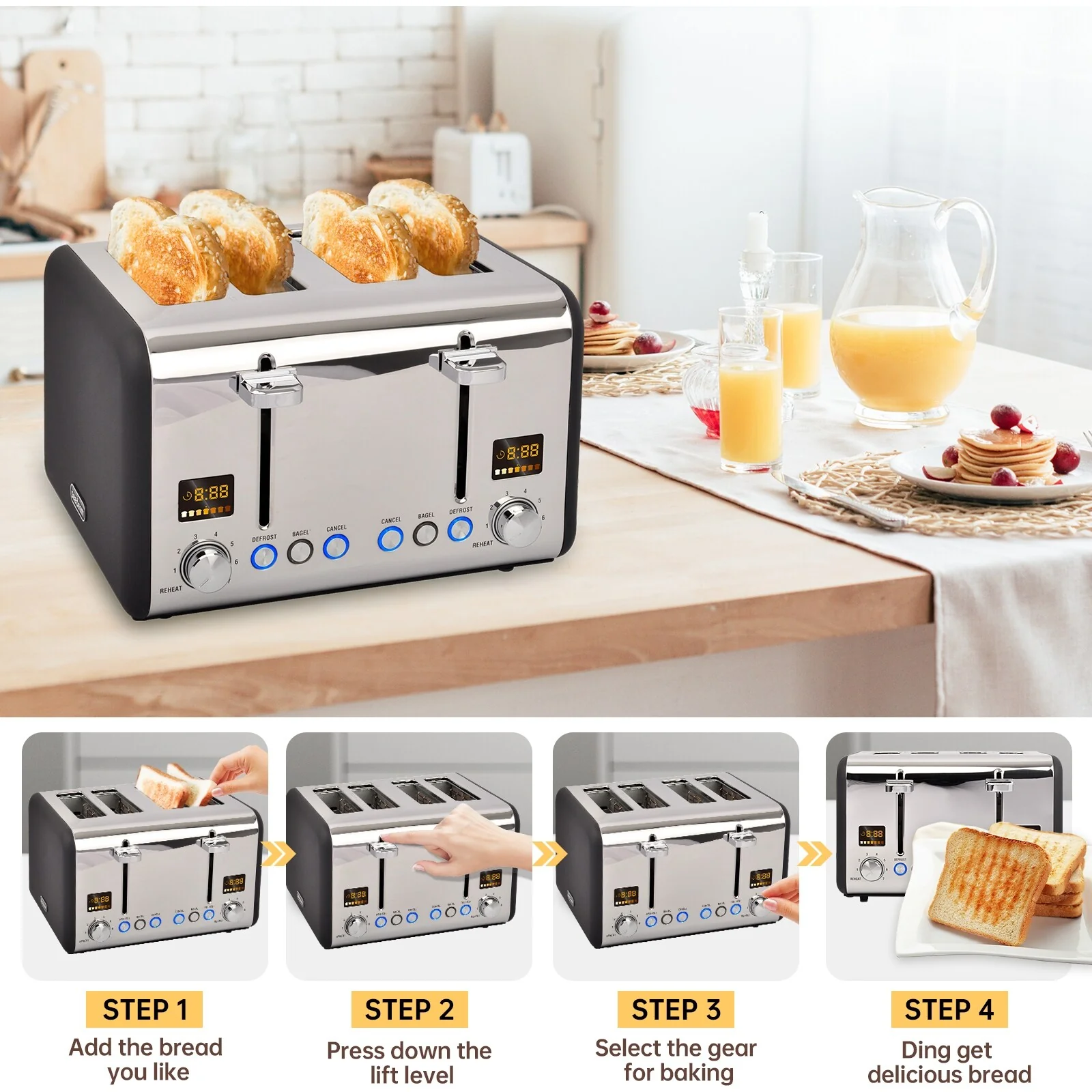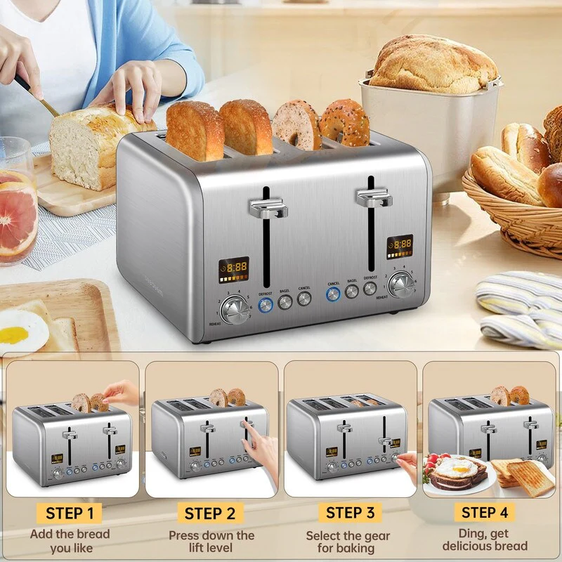 - 【4-in-1 Functions】: 4 basic functions, meet most of your needs.①Cancel--Stop the toaster at any time when it is working.②Bagel--Special baking mode for bagels.③Defrost--Soften your frozen hard bread.④Reheat--Heat bread again when it's not dark or hot enough.