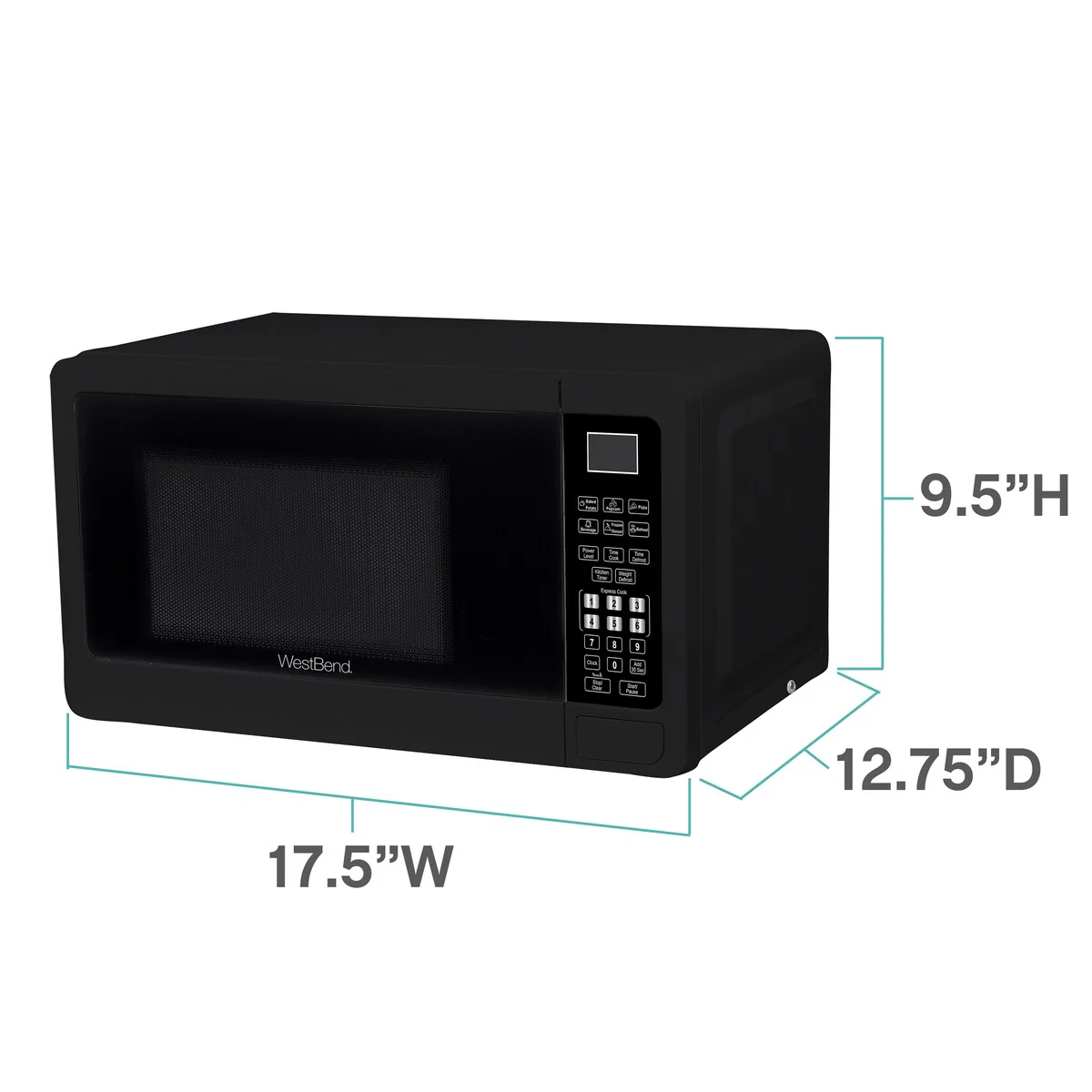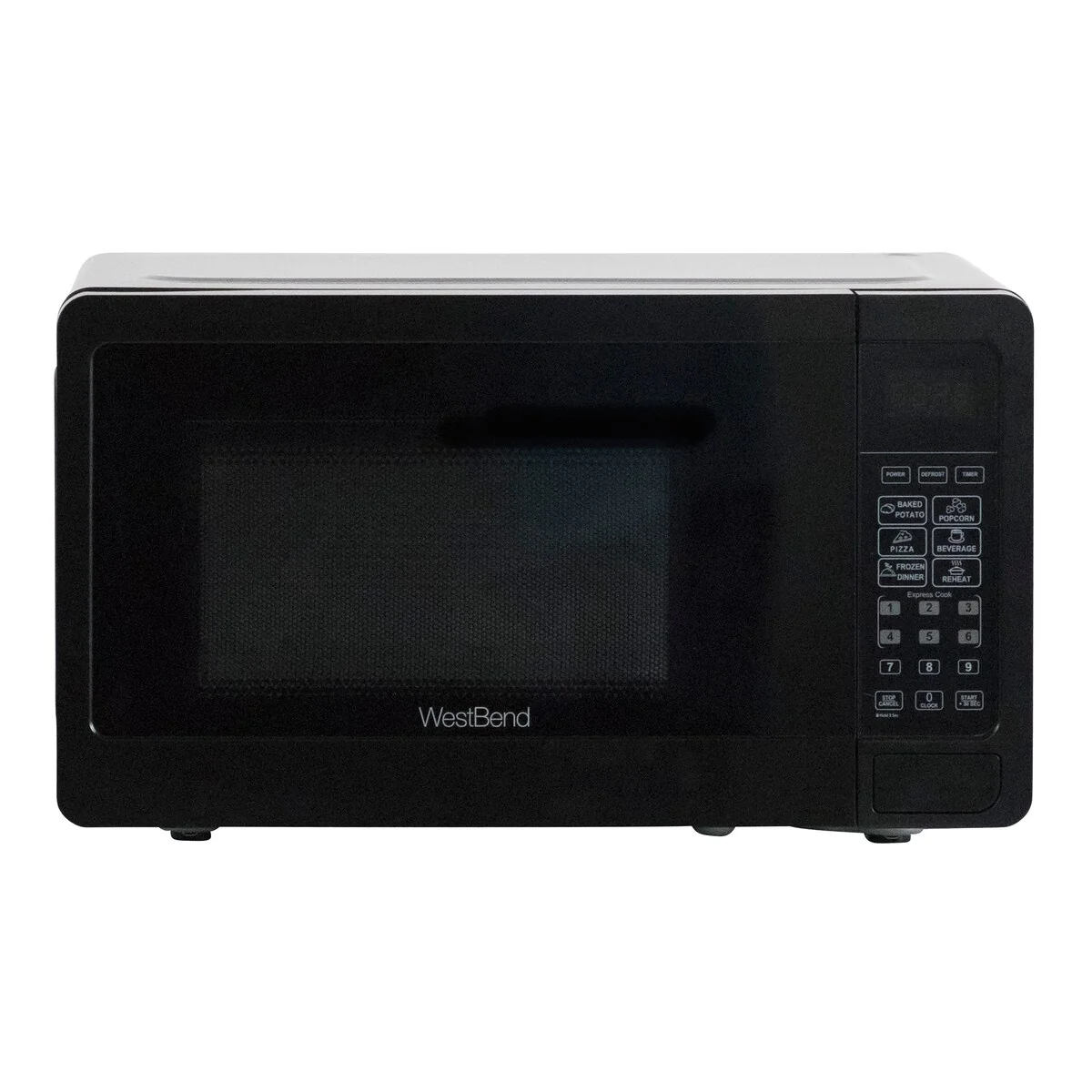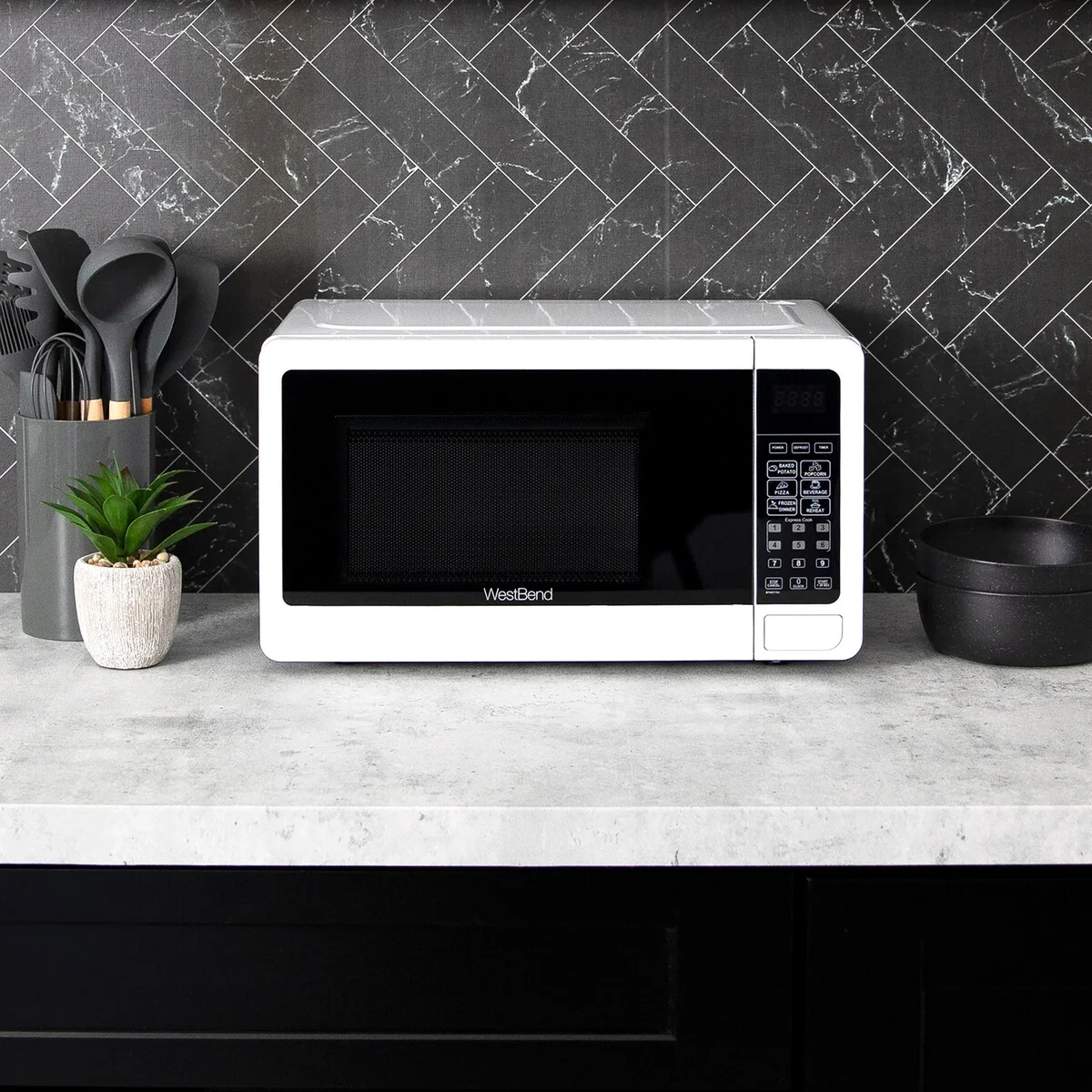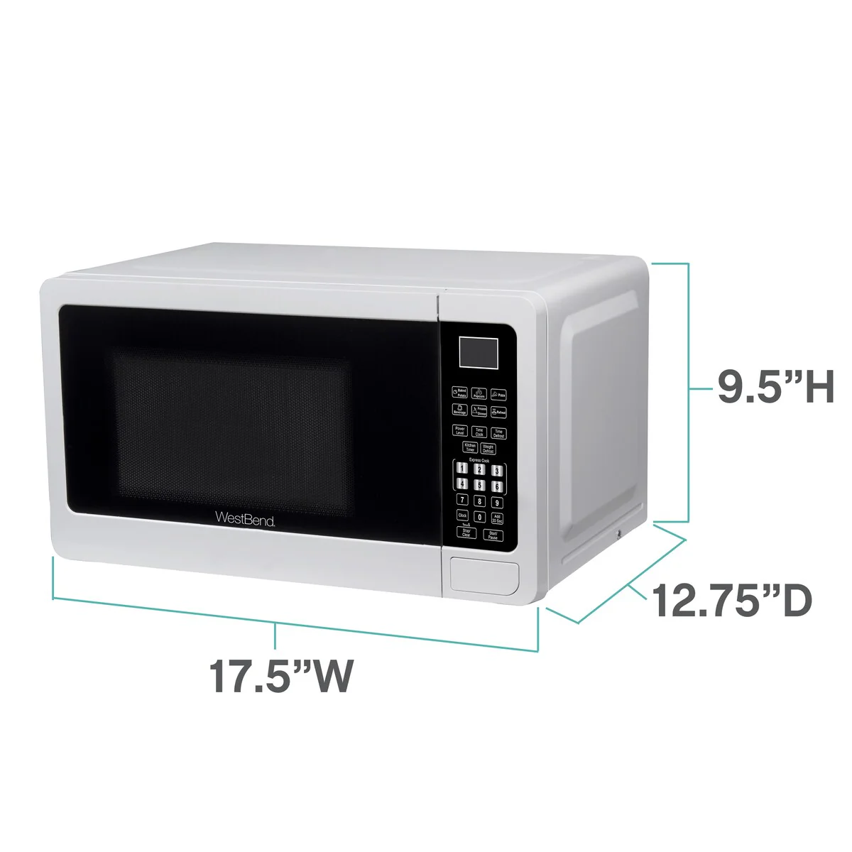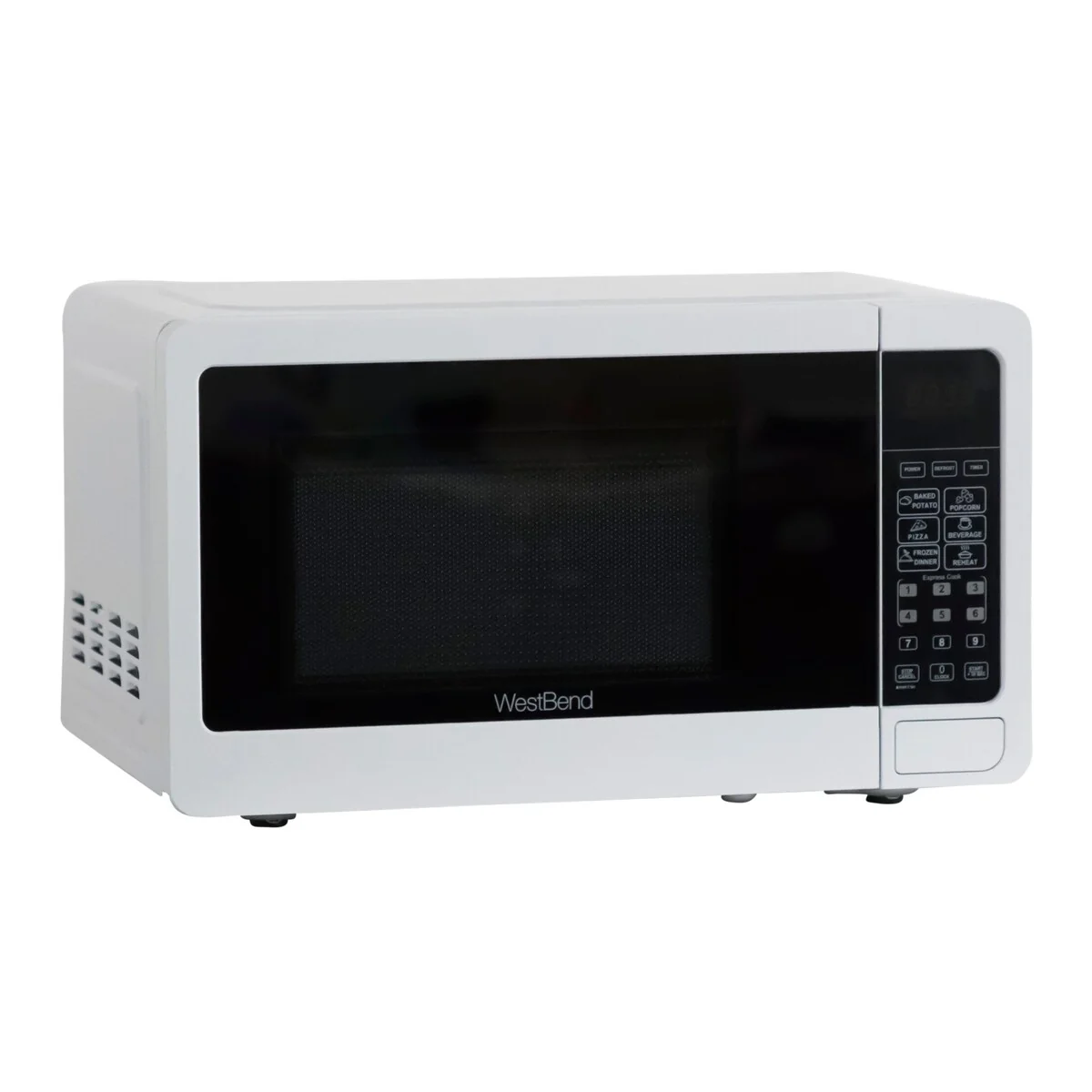 Save counter space with this 0.7 cubic foot microwave oven from West Bend. With its compact footprint, this countertop microwave oven is ideal for the dorm, man cave, office, studio apartment, RV, tiny home, rental room, condo, vacation home or anywhere you need to cook food fast. This small microwave features 700 watts of cooking power, 10 power levels, defrost options and a timer. This white microwave has an electronic control panel and one-touch cooking programs with pre-programmed times for favorites like pizza and popcorn. A turntable with a glass tray ensures even heating. You can even easily add 30 seconds of cook time with the press of a button. Defrost meat for a meal, prepare a snack or reheat last night's leftovers quickly and easily in small spaces with this compact microwave oven from West Bend.-0.7 cu ft capacity offers ample space for heating up a variety of foods-700 watts provide plenty of power to heat your food-Electronic control panel is easy to read-Easily cook your favorites with six pre-programmed cooking options including baked potato, popcorn, pizza, beverage, frozen dinner and reheat-Defrost food quickly and easily with the speed defrost setting-Cook and defrost foods by weight-Integrated kitchen timer helps you stay on schedule while preparing meals-Rotating glass turntable helps cook food evenly-Easily add 30 seconds of cooking with the press of a button-This white microwave complements any decor-Covered by West Bend's 1-Year Manufacturer Limited Warranty