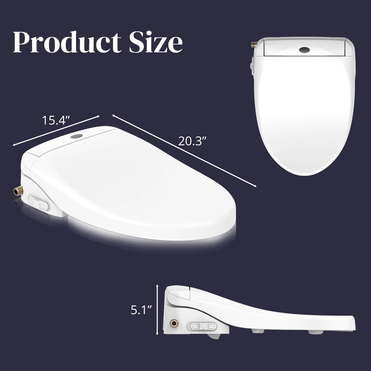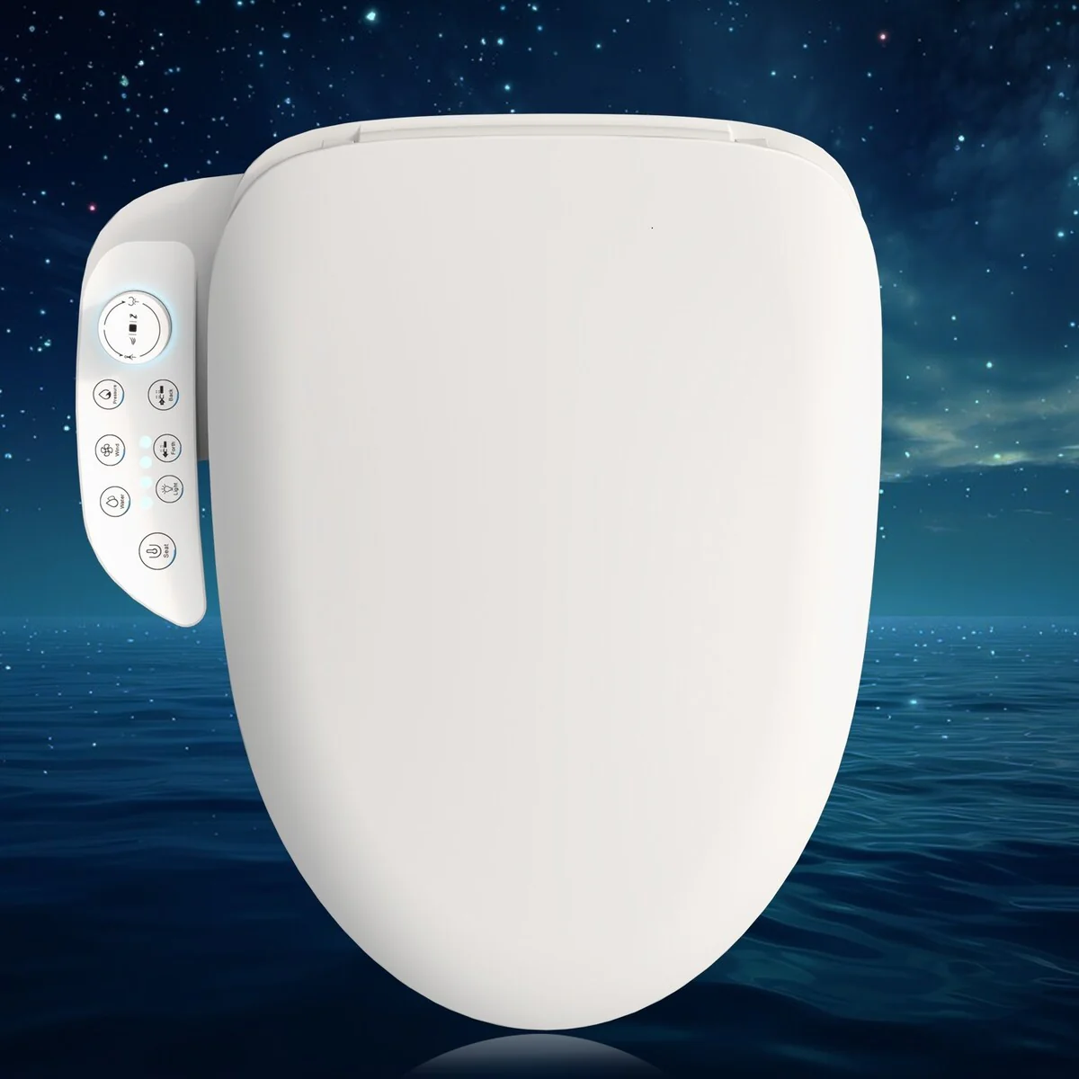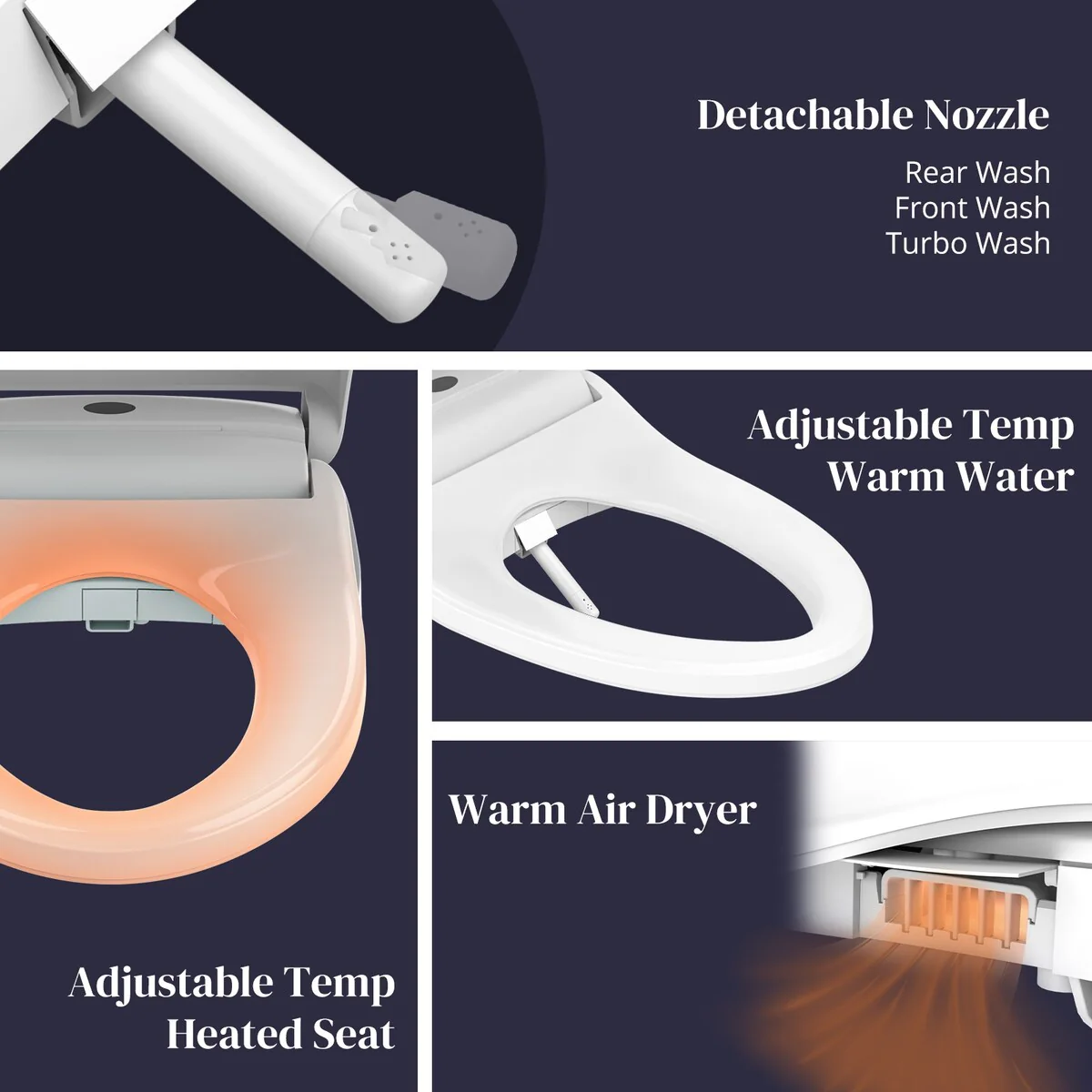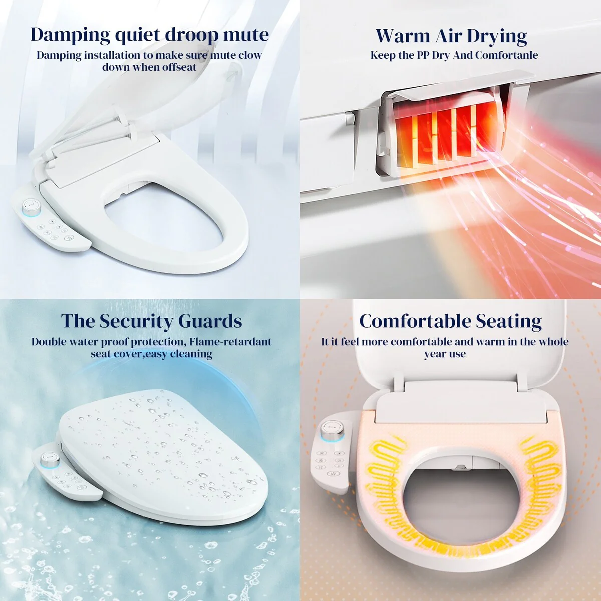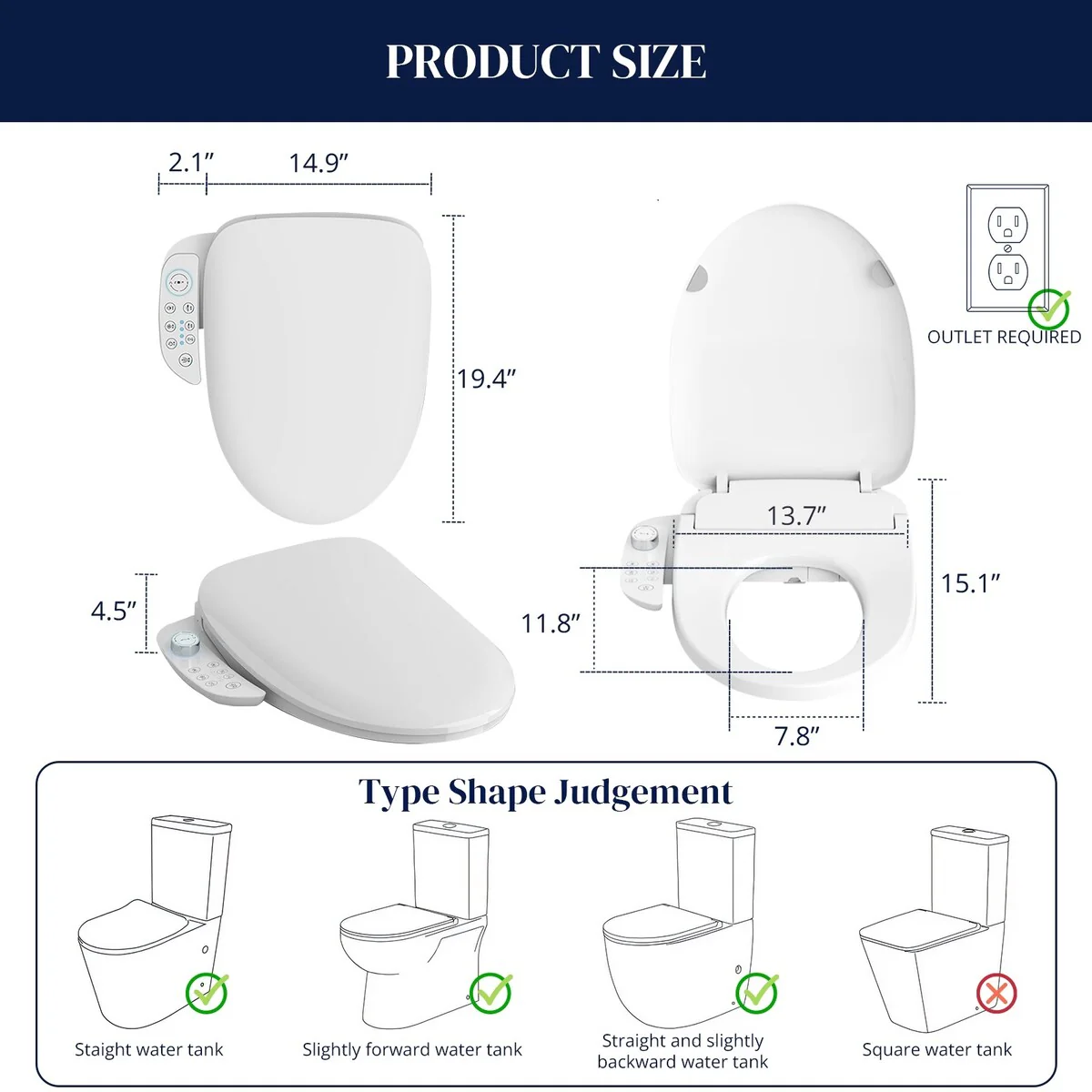 - Indulge in the ultimate bathroom luxury with our heated bidet seat featuring a built-in dryer, suitable for both round and elongated toilets. Navigate easily in the dark with a soothing blue night light. Experience a cozy heated seat with adjustable temperature controls, complemented by a gentle close lid and a potent deodorizer for added serenity. Personalize your wash with adjustable water temperature, pressure, and nozzle position using the wireless remote. Say goodbye to harsh toilet paper - this electronic bidet leaves you feeling cleaner and more comfortable after each use. Installation is hassle-free, requiring no plumber, and all features operate with electricity. Upgrade your bathroom effortlessly and enjoy the benefits of a lavish standard of living. Order now for a refreshing and comfortable experience every time!