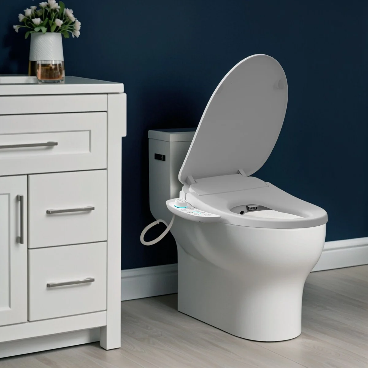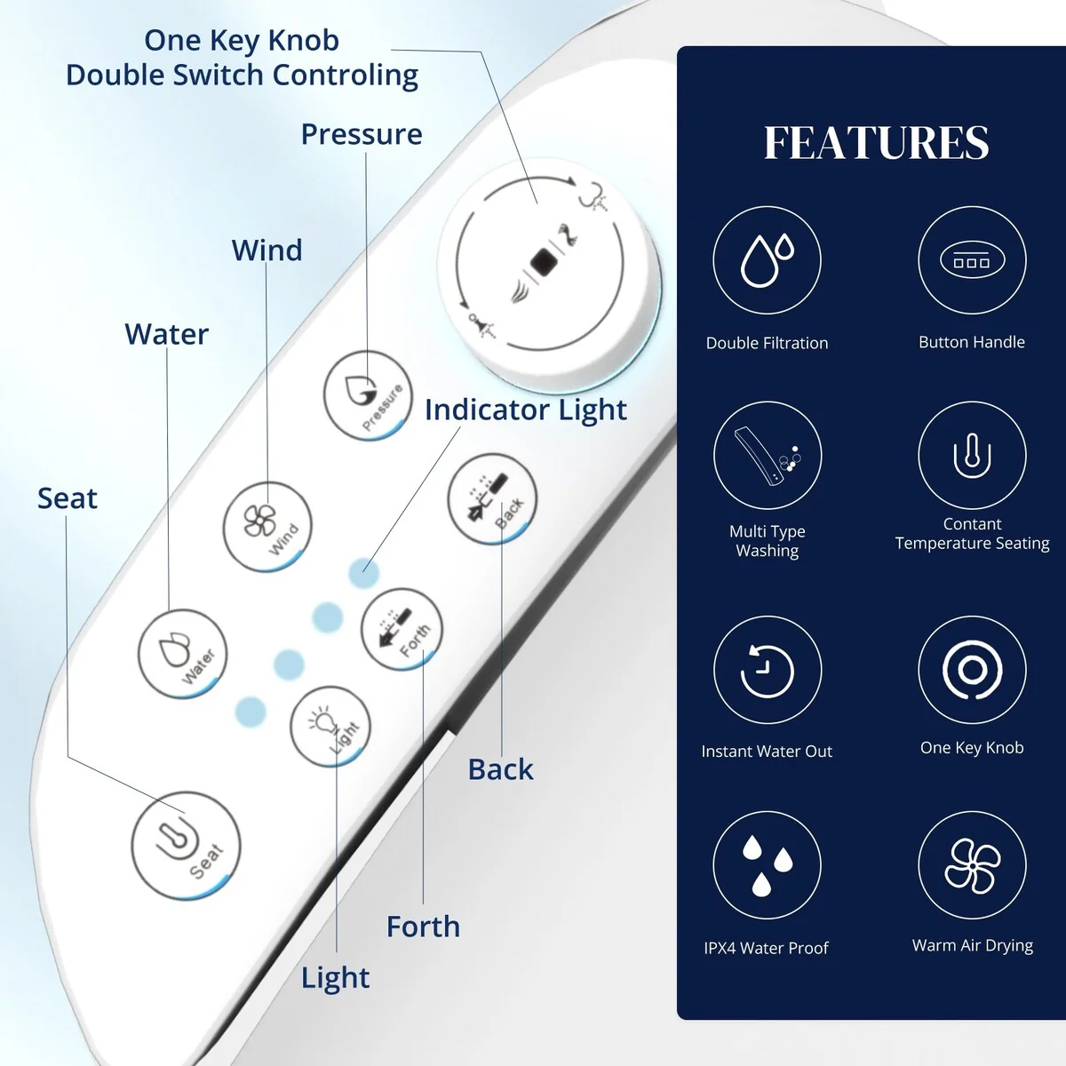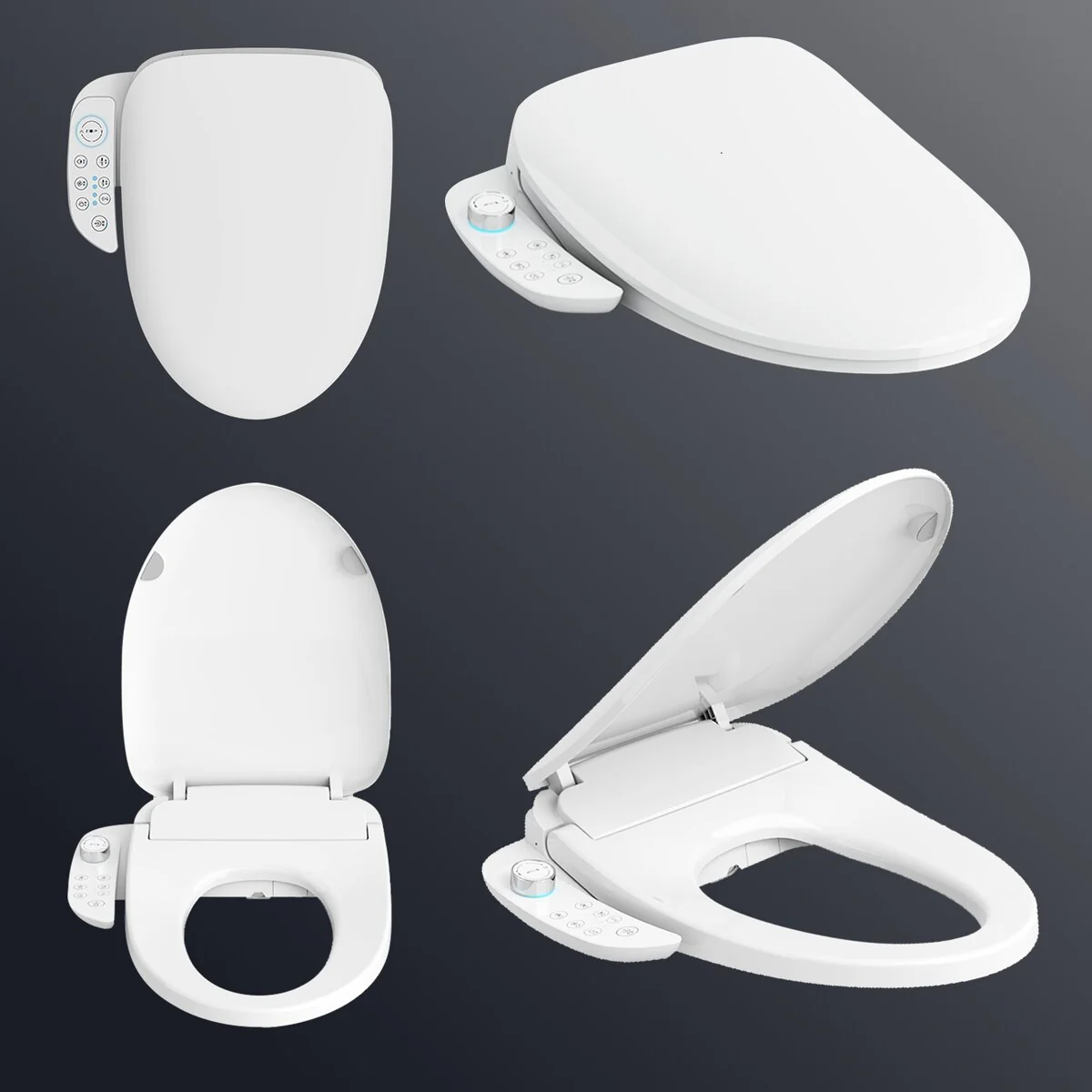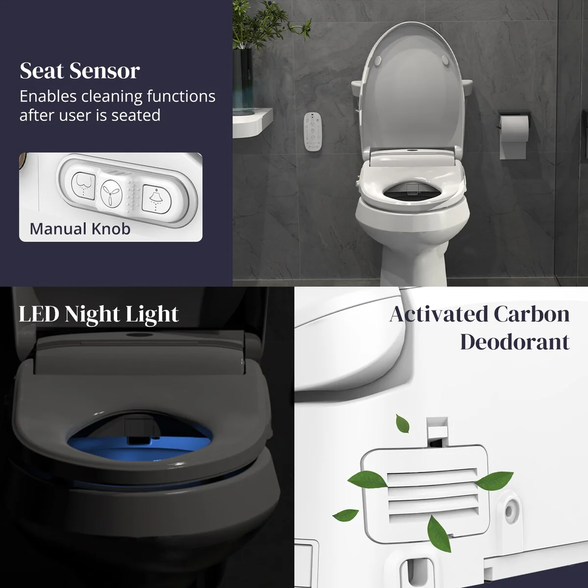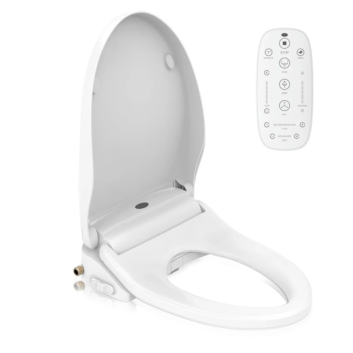 - Indulge in the ultimate bathroom luxury with our heated bidet seat featuring a built-in dryer, suitable for both round and elongated toilets. Navigate easily in the dark with a soothing blue night light. Experience a cozy heated seat with adjustable temperature controls, complemented by a gentle close lid and a potent deodorizer for added serenity. Personalize your wash with adjustable water temperature, pressure, and nozzle position using the wireless remote. Say goodbye to harsh toilet paper - this electronic bidet leaves you feeling cleaner and more comfortable after each use. Installation is hassle-free, requiring no plumber, and all features operate with electricity. Upgrade your bathroom effortlessly and enjoy the benefits of a lavish standard of living. Order now for a refreshing and comfortable experience every time!
