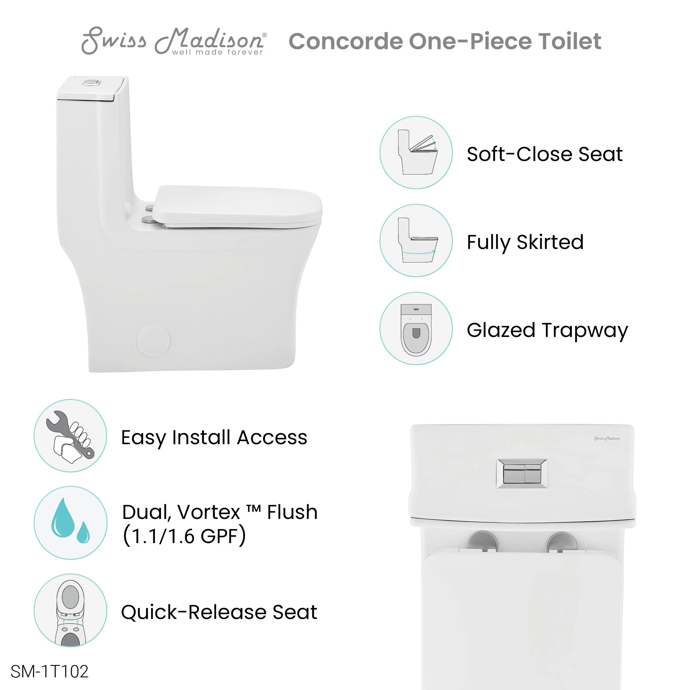 The Concorde One-Piece Toilet was designed for comfort and high performance. Its dual-flush function conserves water without compromising on power, while its sleek skirted design and modern square toilet seat complement any contemporary bathroom.