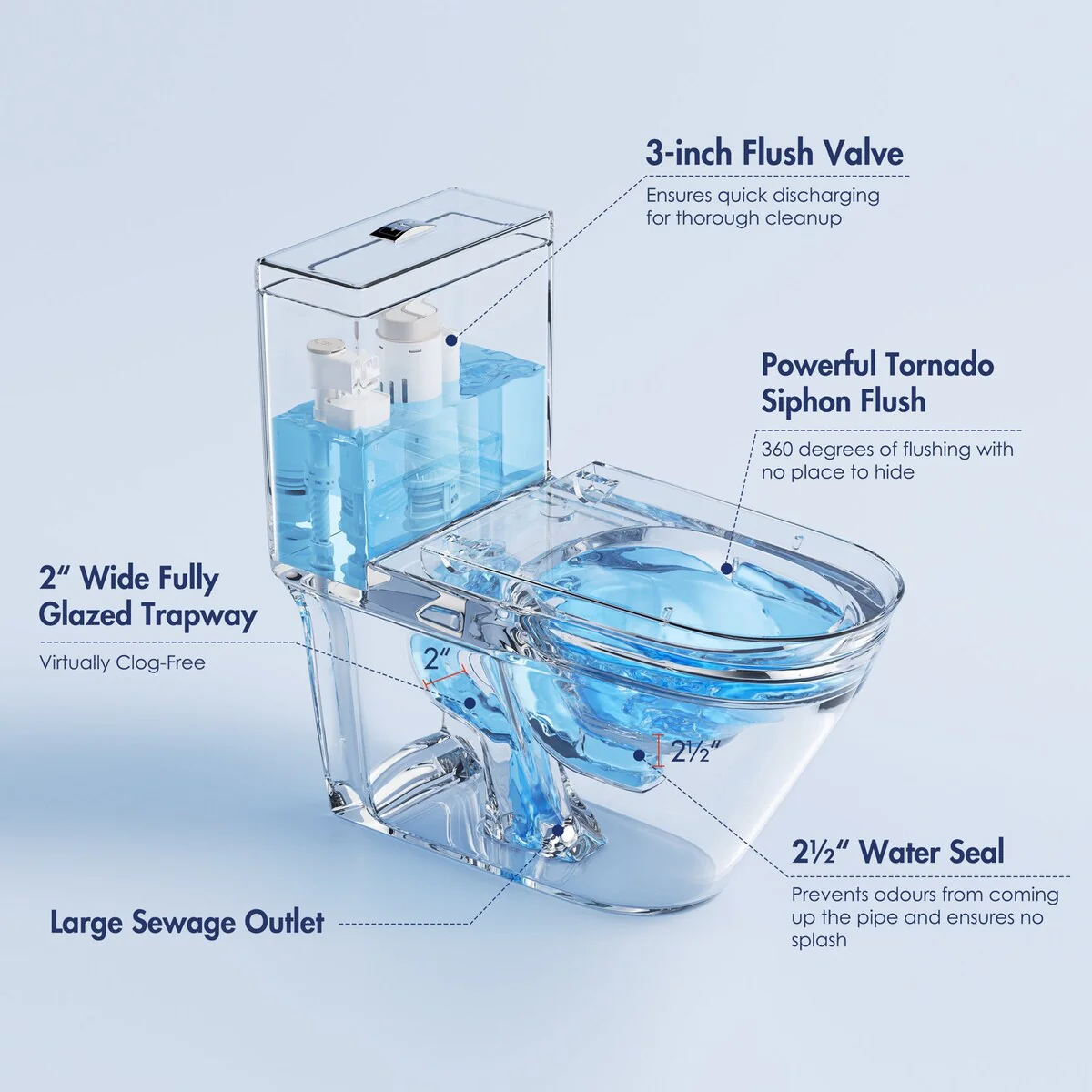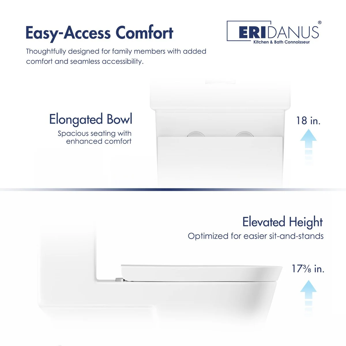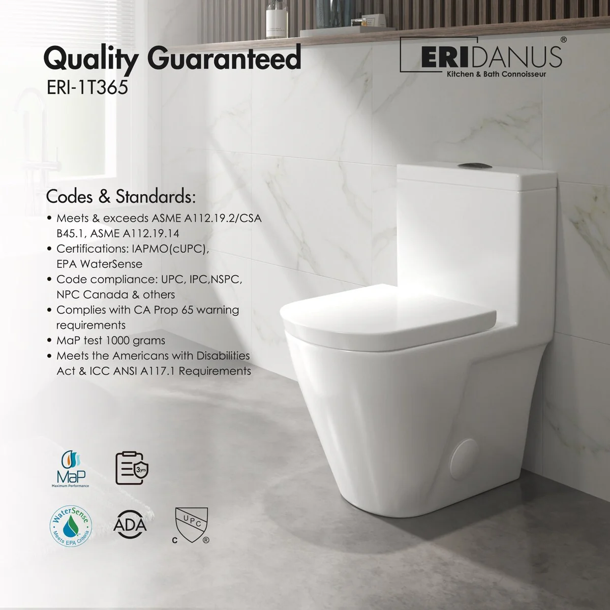 Crafted with superior materials and designed for optimal performance, these one-piece siphon dual flush floor-mounted toilets redefine the concept of luxury. With their sleek vitreous china construction, non-porous and seamless design, and fully skirted trapway, Toilets not only elevate the aesthetics of your space but also offer unparalleled ease of maintenance. WaterSense certified and equipped with a powerful siphon flushing system, these toilets save water without compromising on performance. Experience quiet and efficient flushing with 2 precision-engineered nozzles and the confidence of Map certification, ensuring the disposal of up to 1000g of solid waste with a single flush. Upgrade to Eridanus Toilets and transform your bathroom into a sanctuary of style and sustainability.