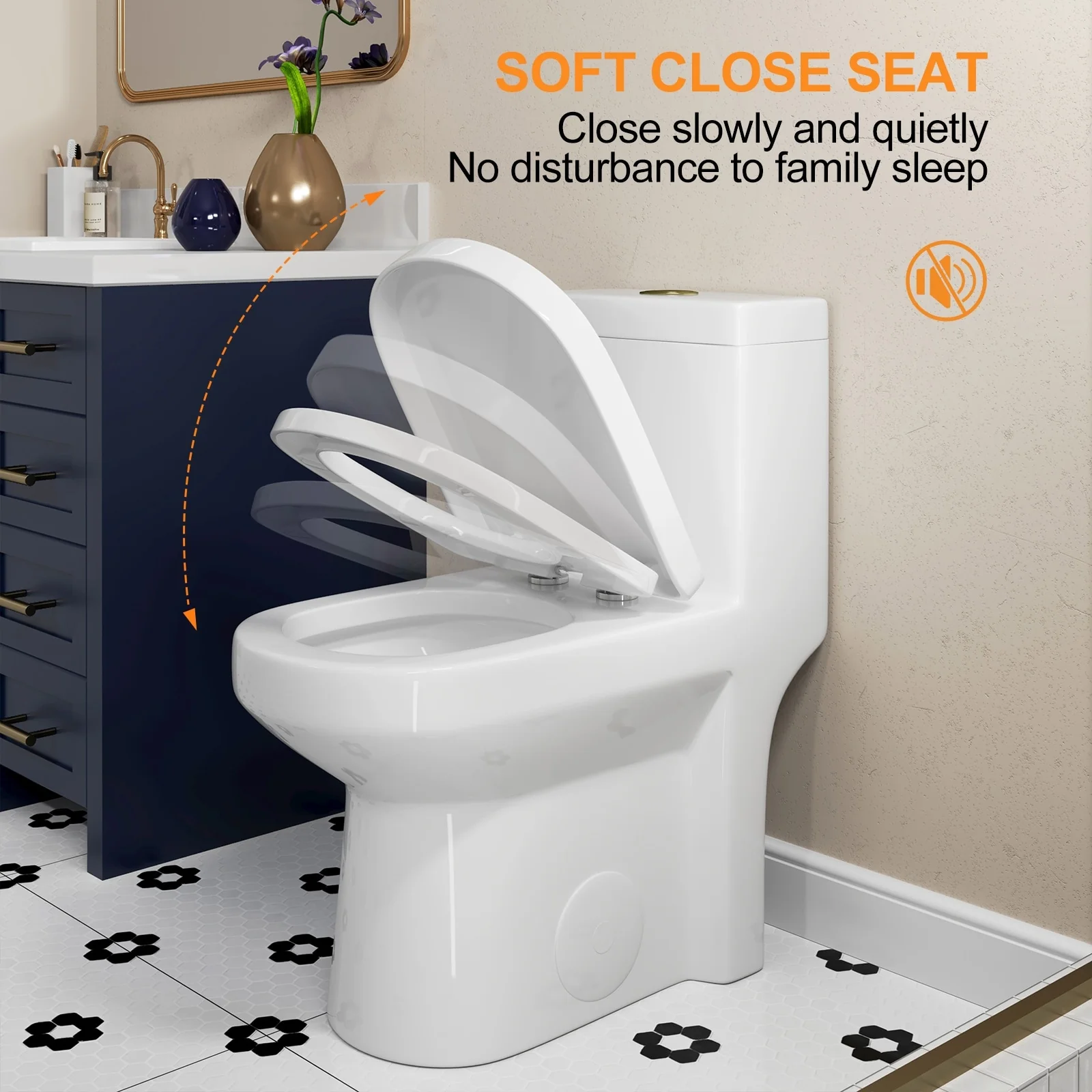 - Quiet and Powerful Flushing: siphon flushing 1-piece toilet, fully glazed flush system, bringing a super quiet and powerful flushing no clogs, no leaks, and no problem
