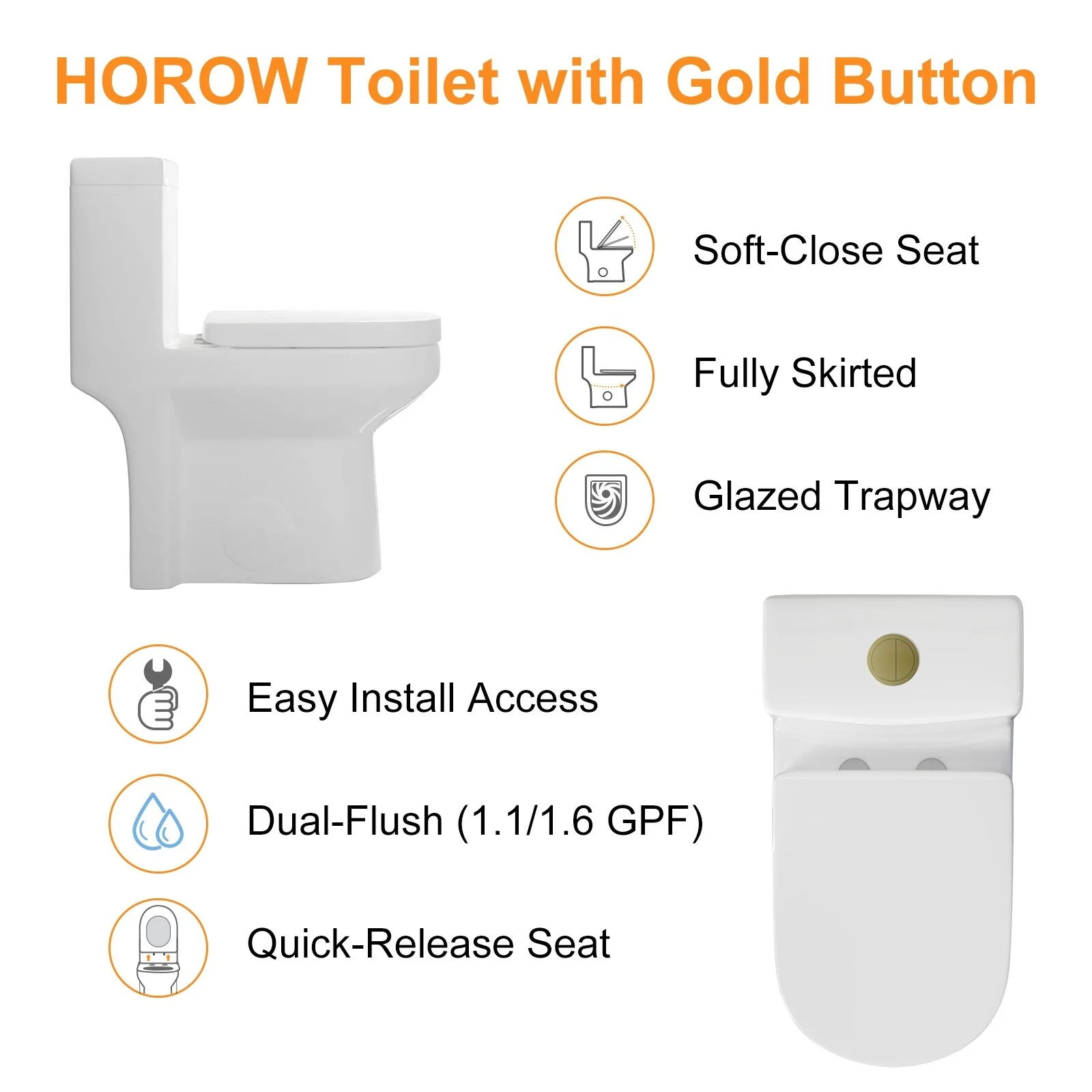HOROW one piece toilet with gold button features a contemporary and compact design. A timeless, sophisticated, and flattering gold-plated top button is included, perfect pair with your home's existing classic or contemporary metallic elements.This small toilet is designed with the highest quality material. The sharply modern form of it is sure to provide the most comfort in any small bathroom. The miniature toilet is install in a powder room or in an additional bathroom where space is limited.