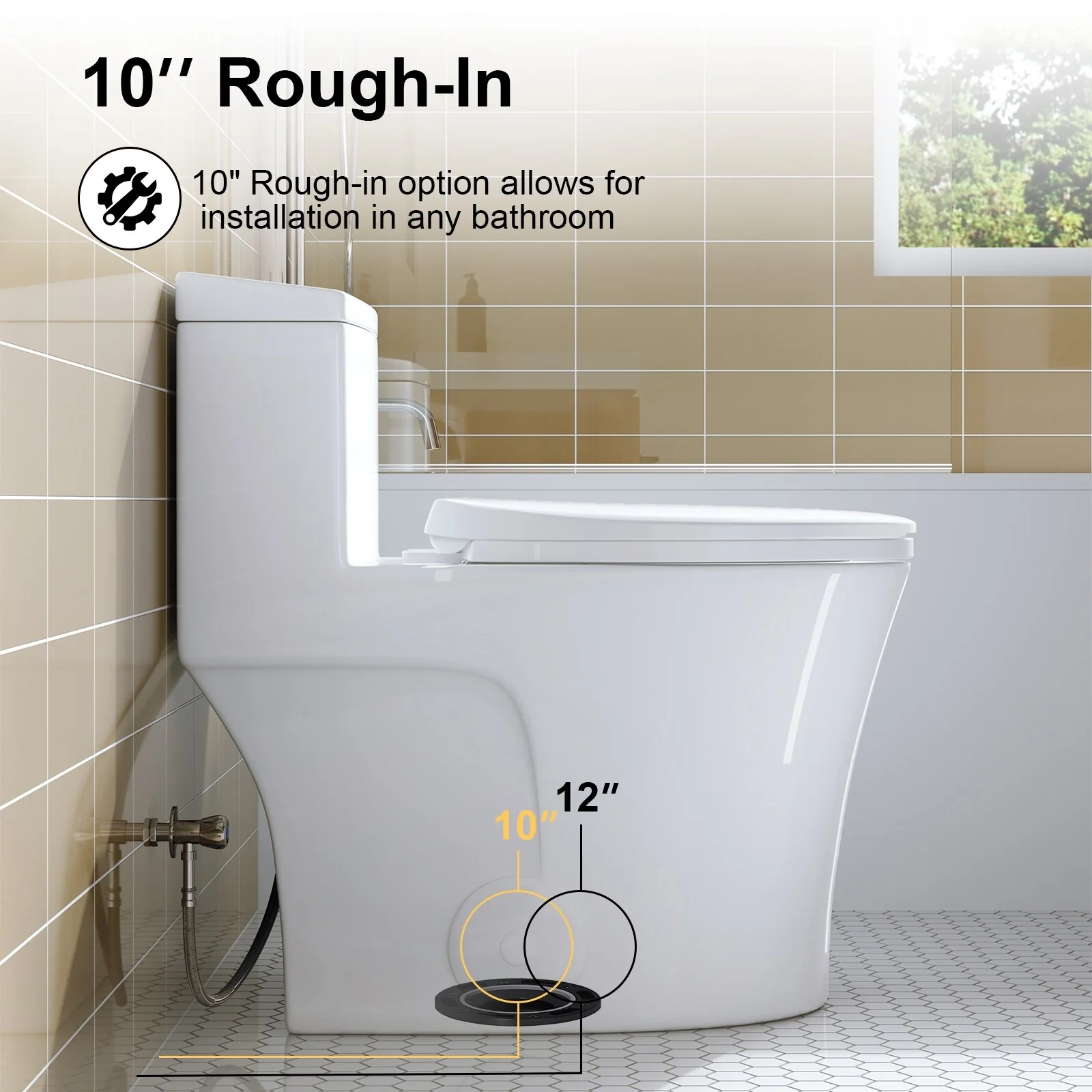- 10' Rough in Toilets for Bathrooms: 10' Rough-in option allows for installation in any bathroom. Standard one piece toilet, with sleek look and top dual flush chrome button. This compact elongated toilet measures just 26.6 inches deep by 15 inches wide and 26 inches high, ensuring plenty of room for comfort in a bathroom space.
