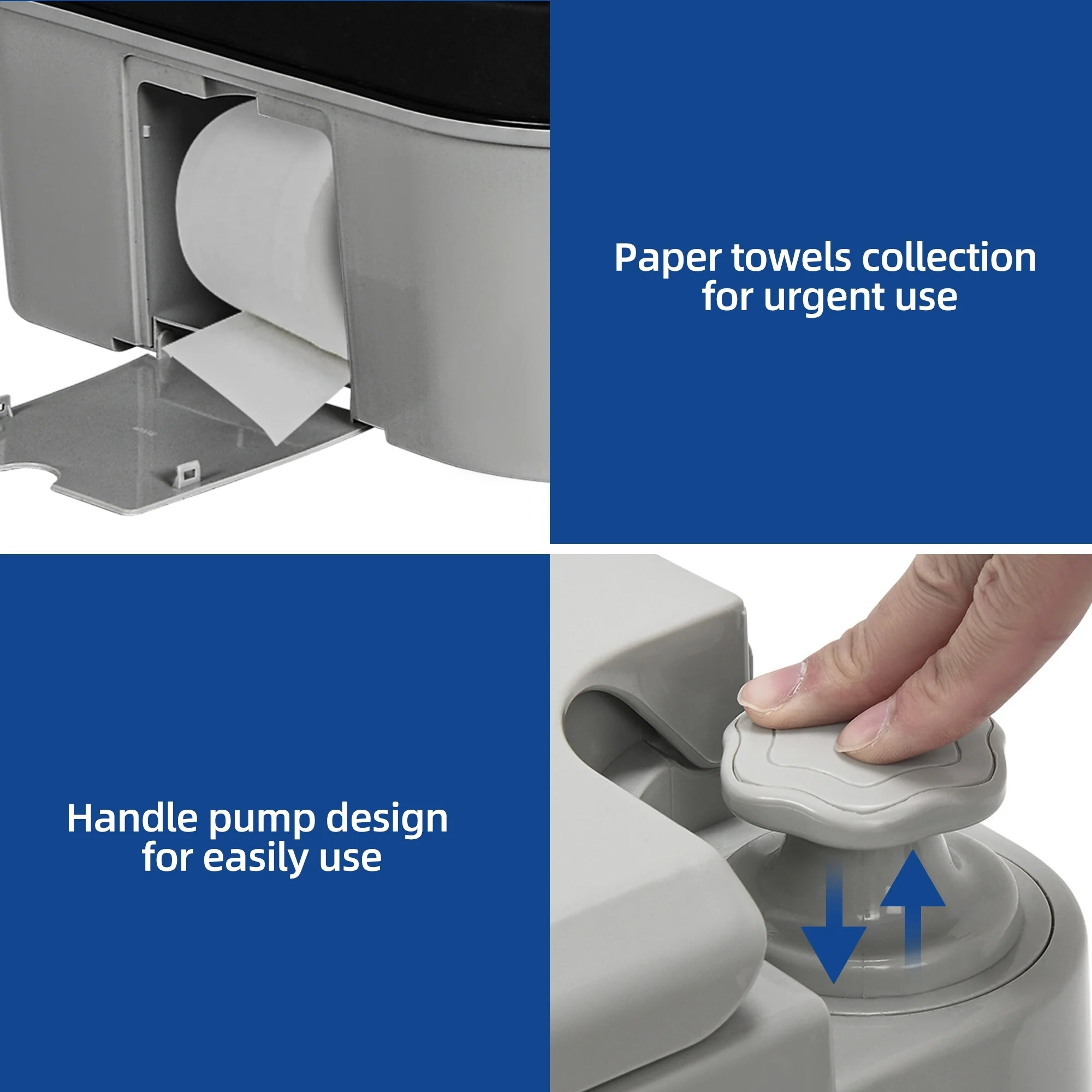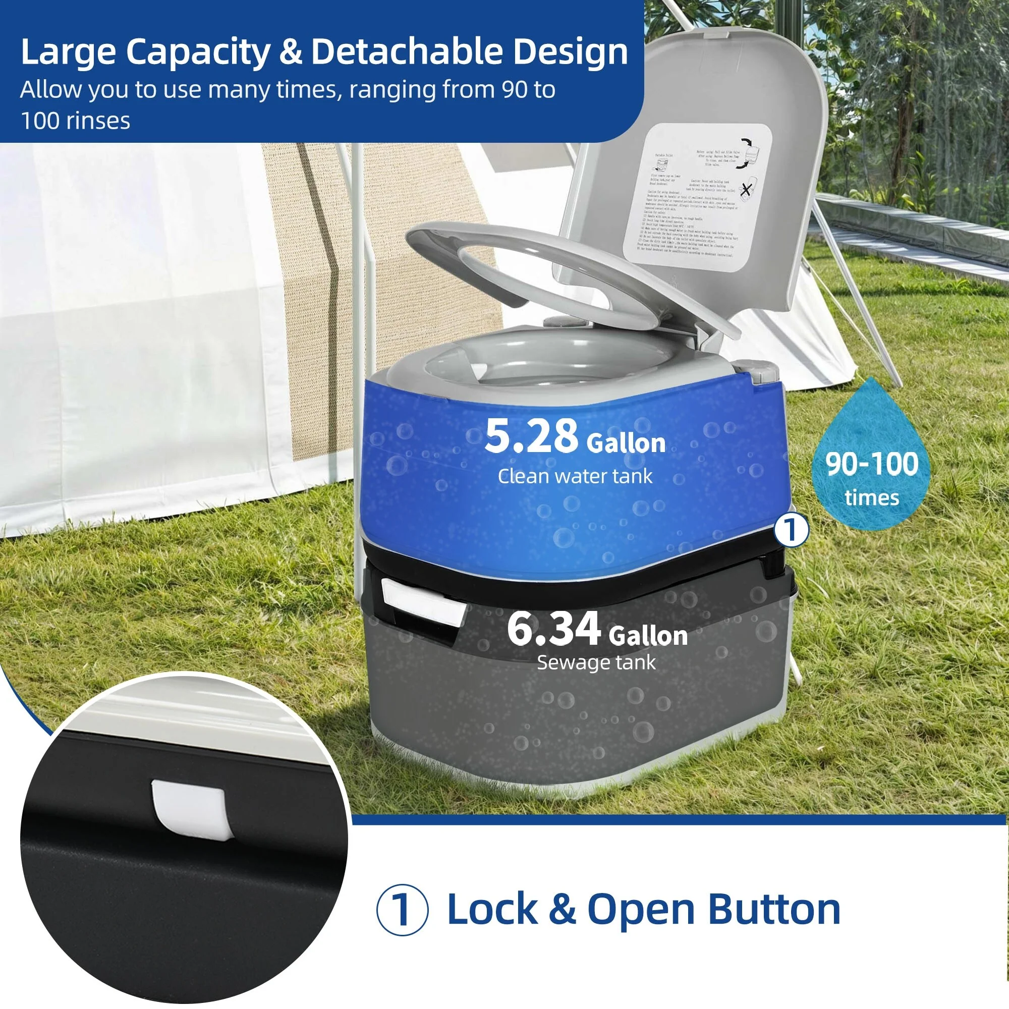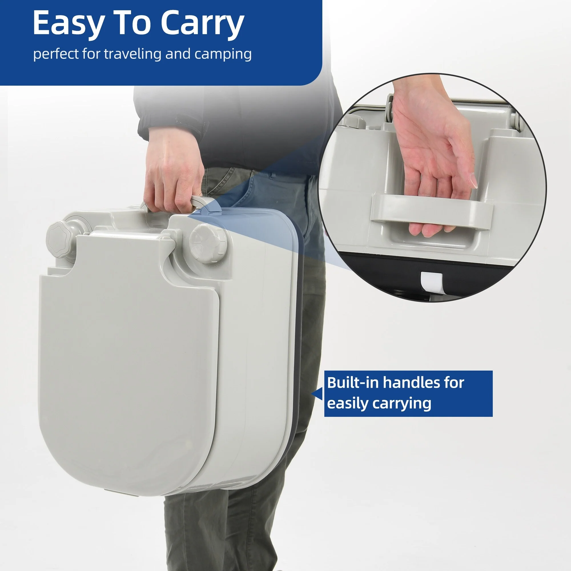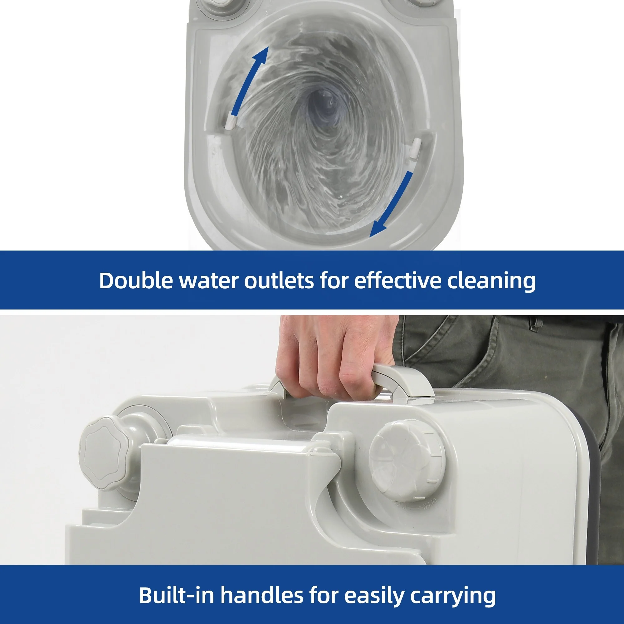 Introducing the ultimate camping toilet, designed for convenience and durability. With a robust 5.28-gallon freshwater tank and a 6.34-gallon waste-water tank, it's built for multiple uses without the hassle of constant emptying. Capable of supporting up to 331 lbs, it's suitable for all users, from children to the elderly. Its efficient cleaning system with dual water outlets ensures thorough sanitation, while the handle pump makes flushing effortless. The integrated paper and detergent storage keeps essentials handy and avoids the need for additional holders. Odorless and convenient, it features a rotating spout for easy emptying and a slide valve to seal in waste. Disassembly is a breeze with a simple button press, and the handle design makes it portable. Ideal for camping, travel, and various vehicles, it's the perfect solution for outdoor enthusiasts and those in need of portable sanitation.
