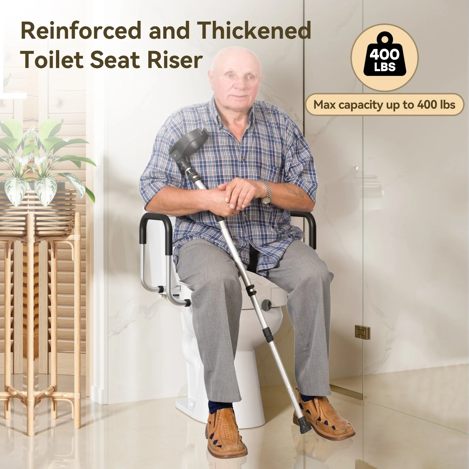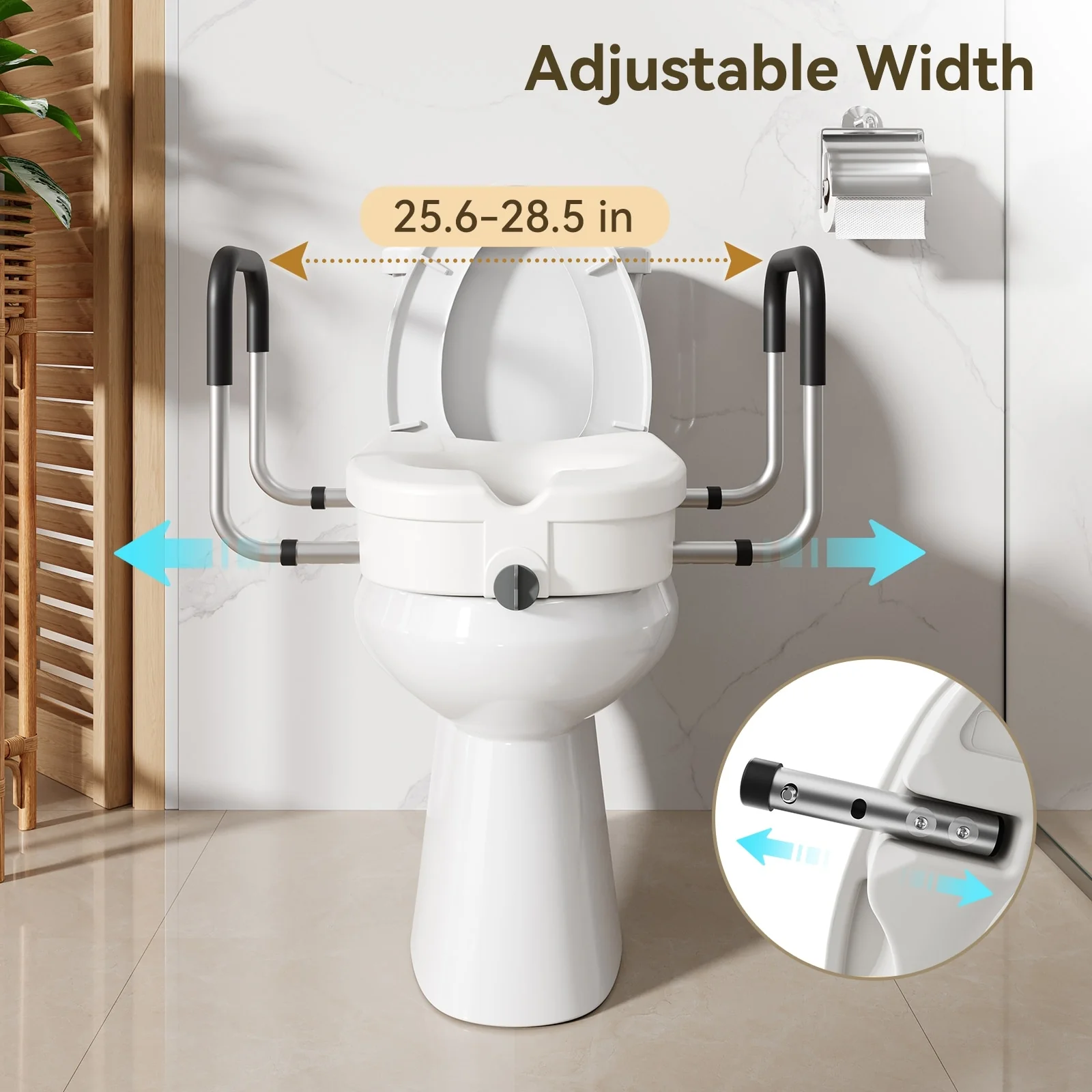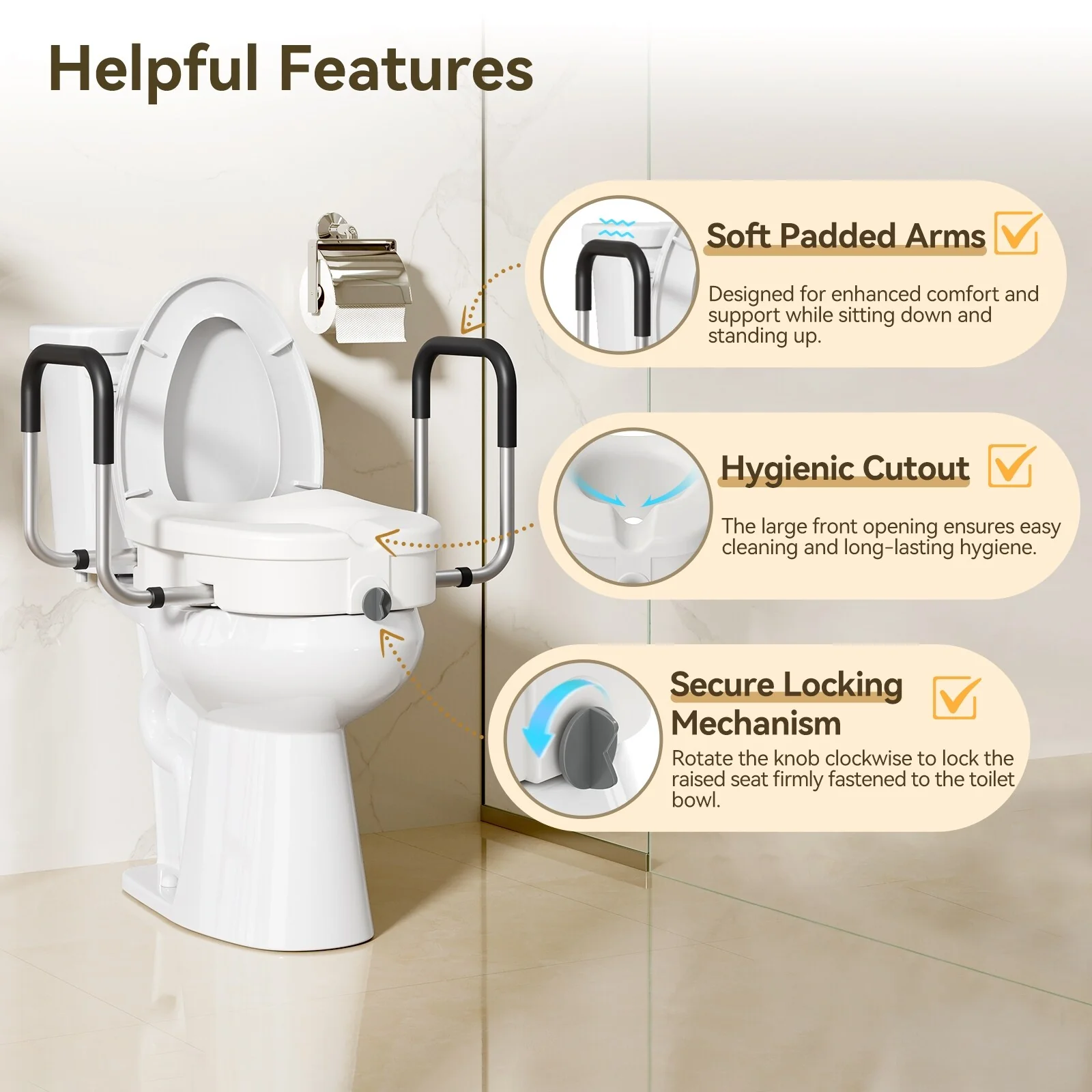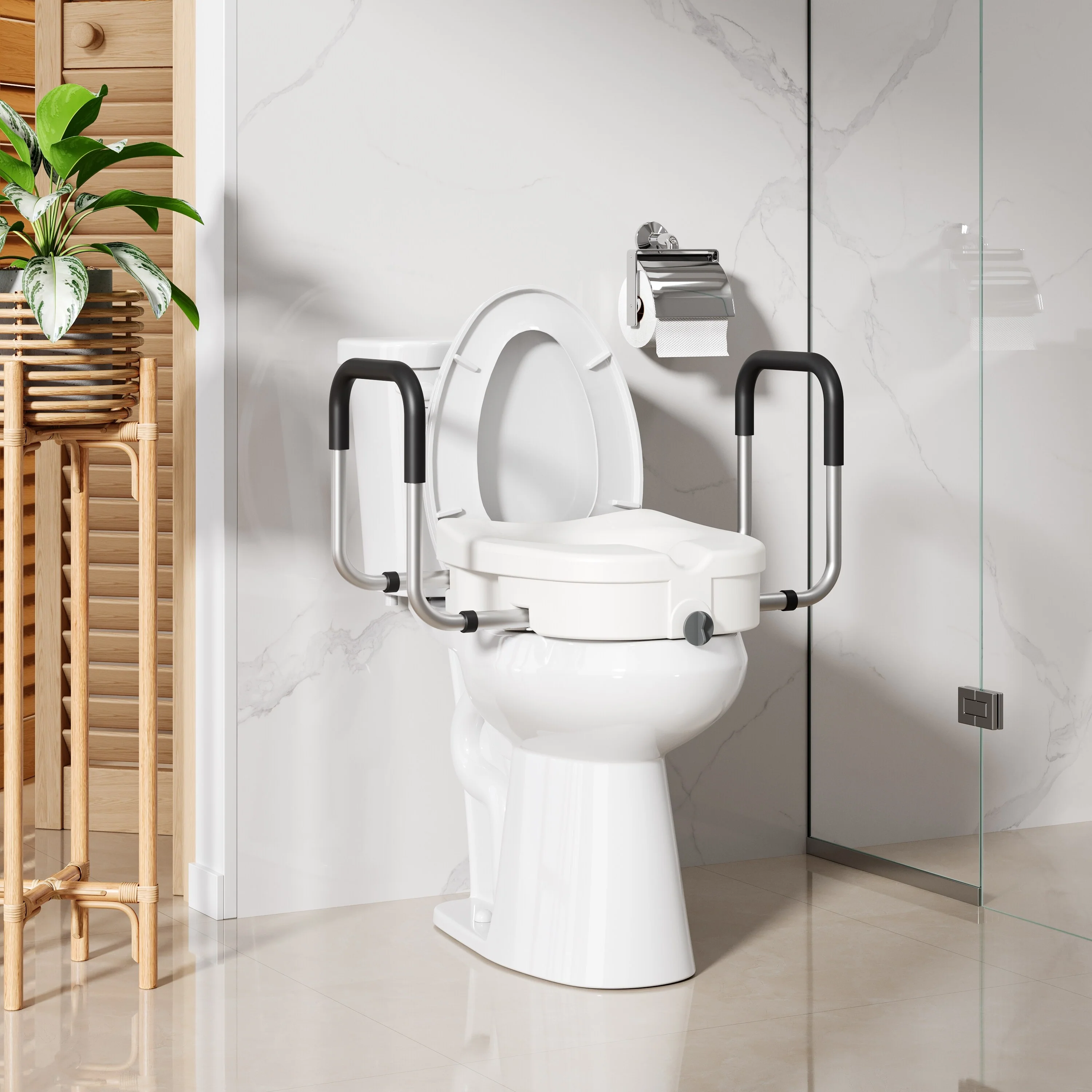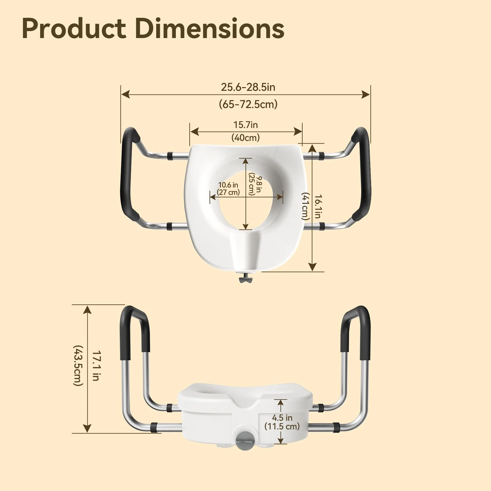- Enhanced Comfort & Safety for Easier Transfers: Our Raised Toilet Seat adds 4.5 inches of secure height to your existing toilet, making sitting down and standing up significantly easier for seniors, pregnant individuals, and those with mobility challenges. The adjustable soft-padded arms provide extra stability and support, reducing strain on joints and muscles. Designed to fit most elongated toilets, this riser ensures a snug and secure fit without wobbling, offering peace of mind with every use.