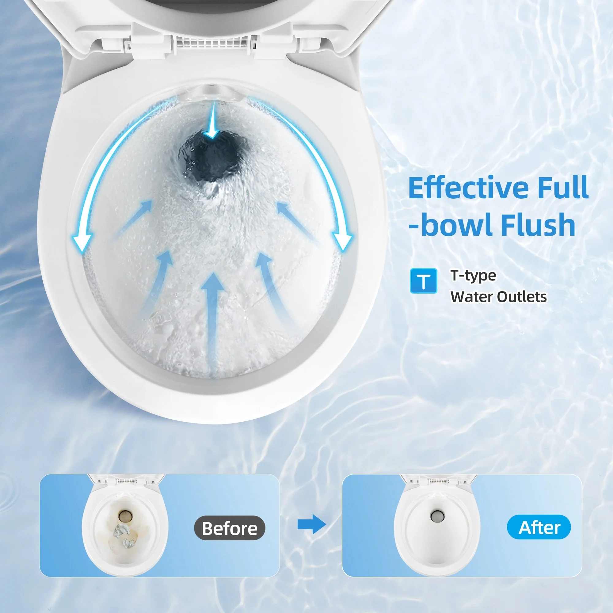 - 2. EFFECTIVE T-TYPE WATER OUTLET: The T-type design can provide dispersed flushing coverage to clean the bowl more thoroughly and comprehensively; Only 0.05 L fresh water needed can clean the whole bowl; The water-saving design can reduce water consumption a lot
