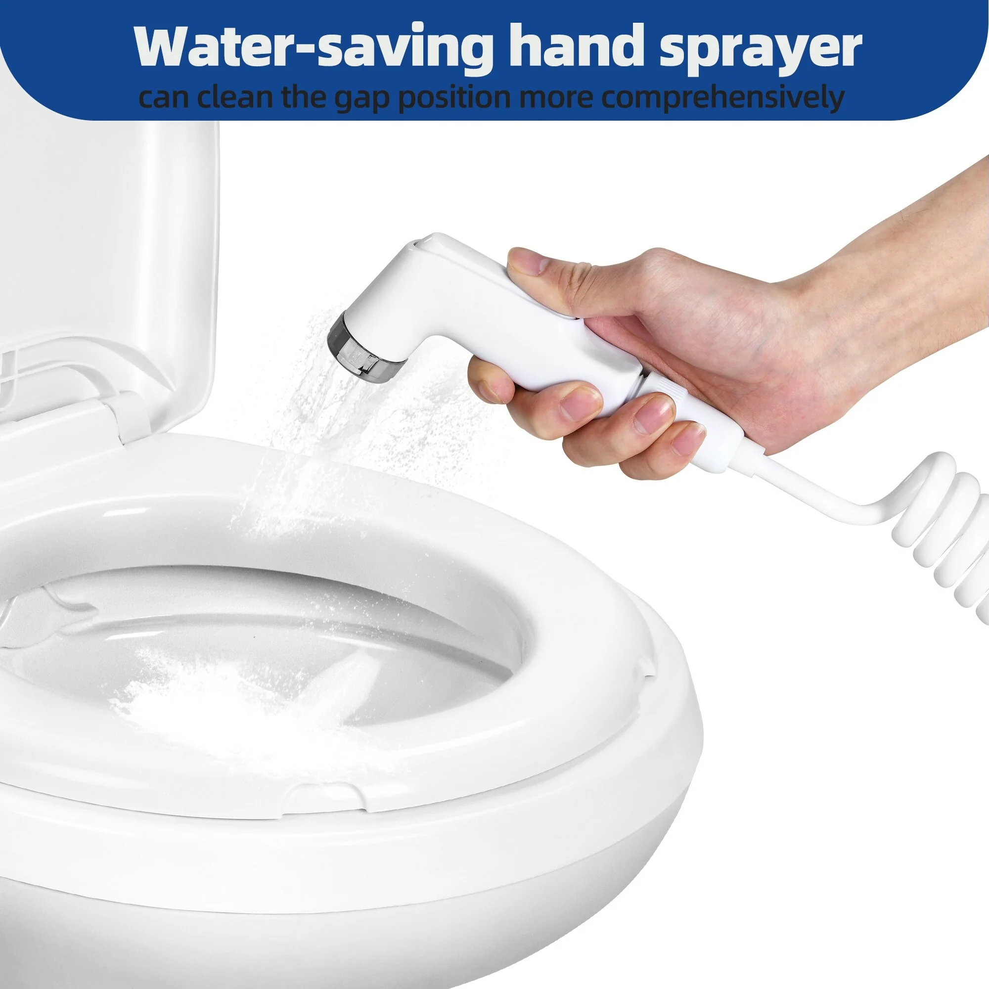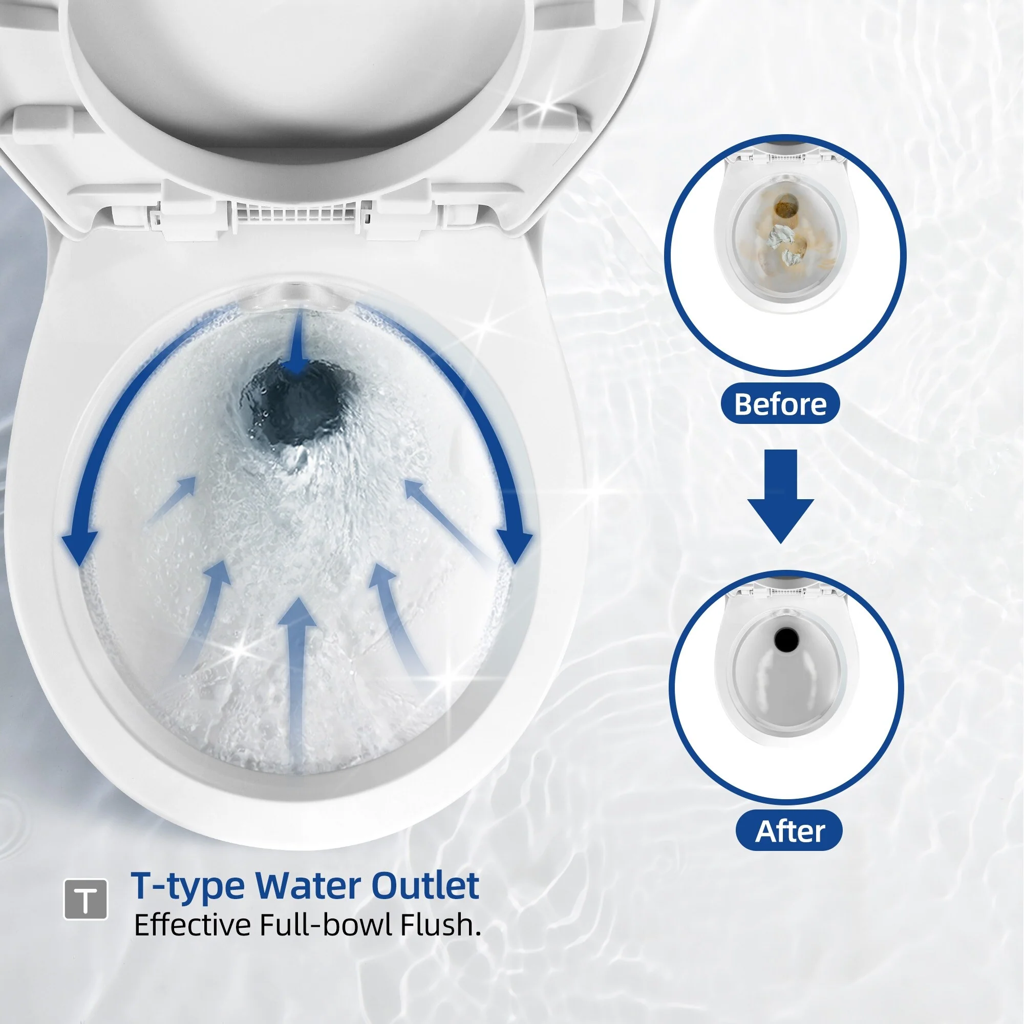 - 2. Powerful complete flush: The T-type water outlet disperses the water to thoroughly clean the whole bowl with only 0.05L fresh water. The hand sprayer helps clean unpleasant nooks and saves water