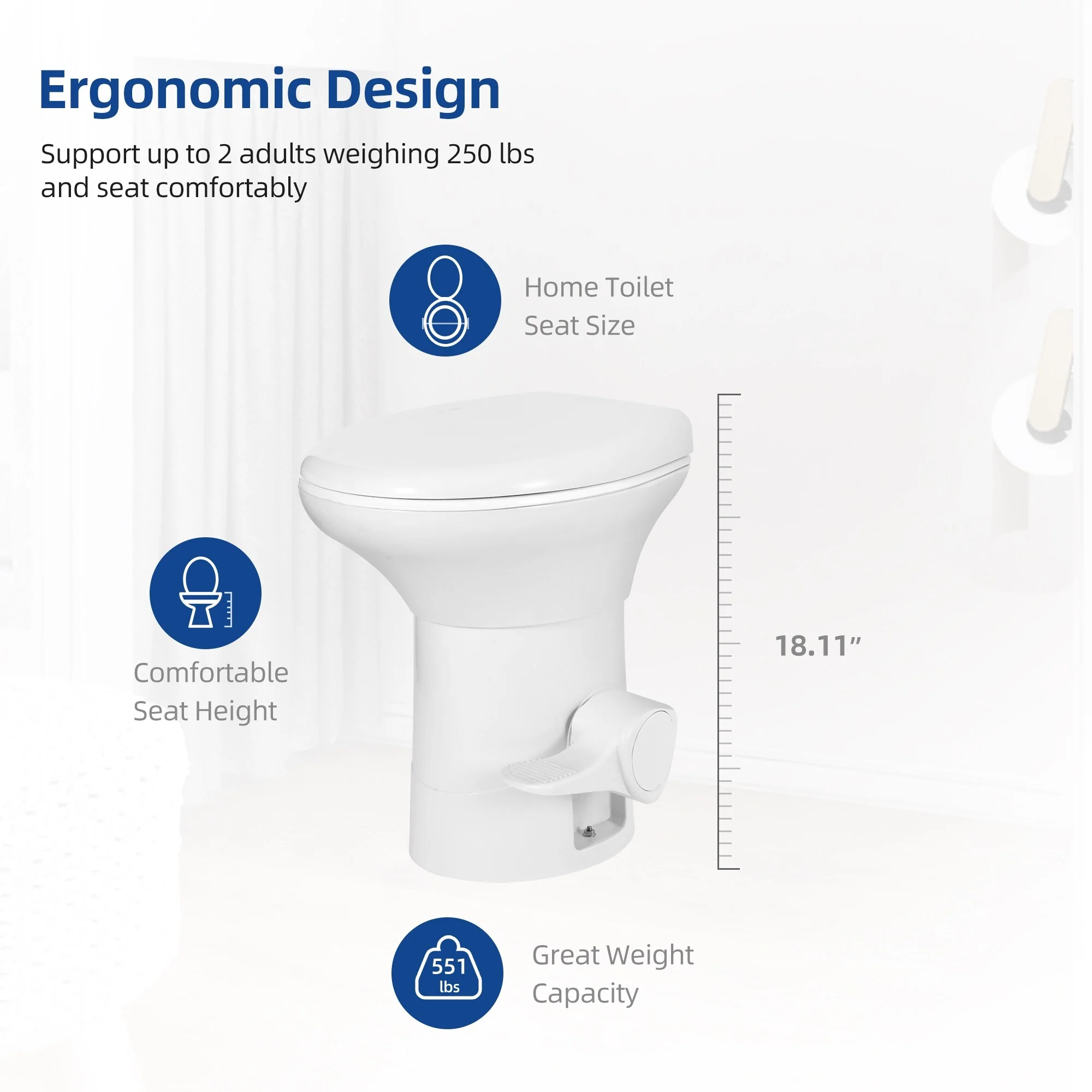 - 4. Enjoy home-like comfort: The flush cassette toilet features an elongated residential-style seat for home-like comfort and chair-like height for ease of sitting and standing. Its lid is smooth to open/close