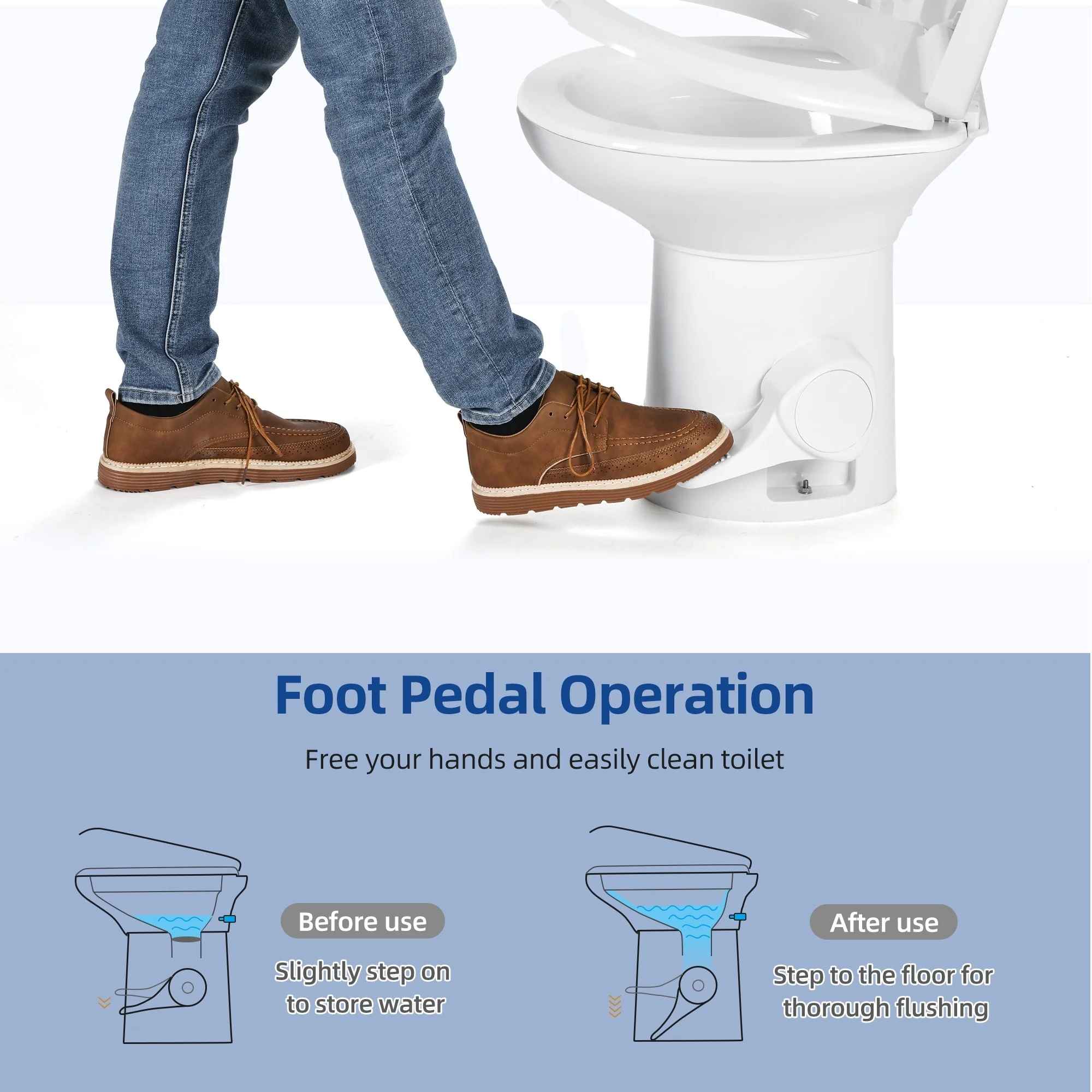 - 3. Energy-saving foot pedal: Just slightly step on the pedal to add water, then step on it to the ground for a complete flush. No electricity is needed. After use, the slide valve locks in the nasty odor