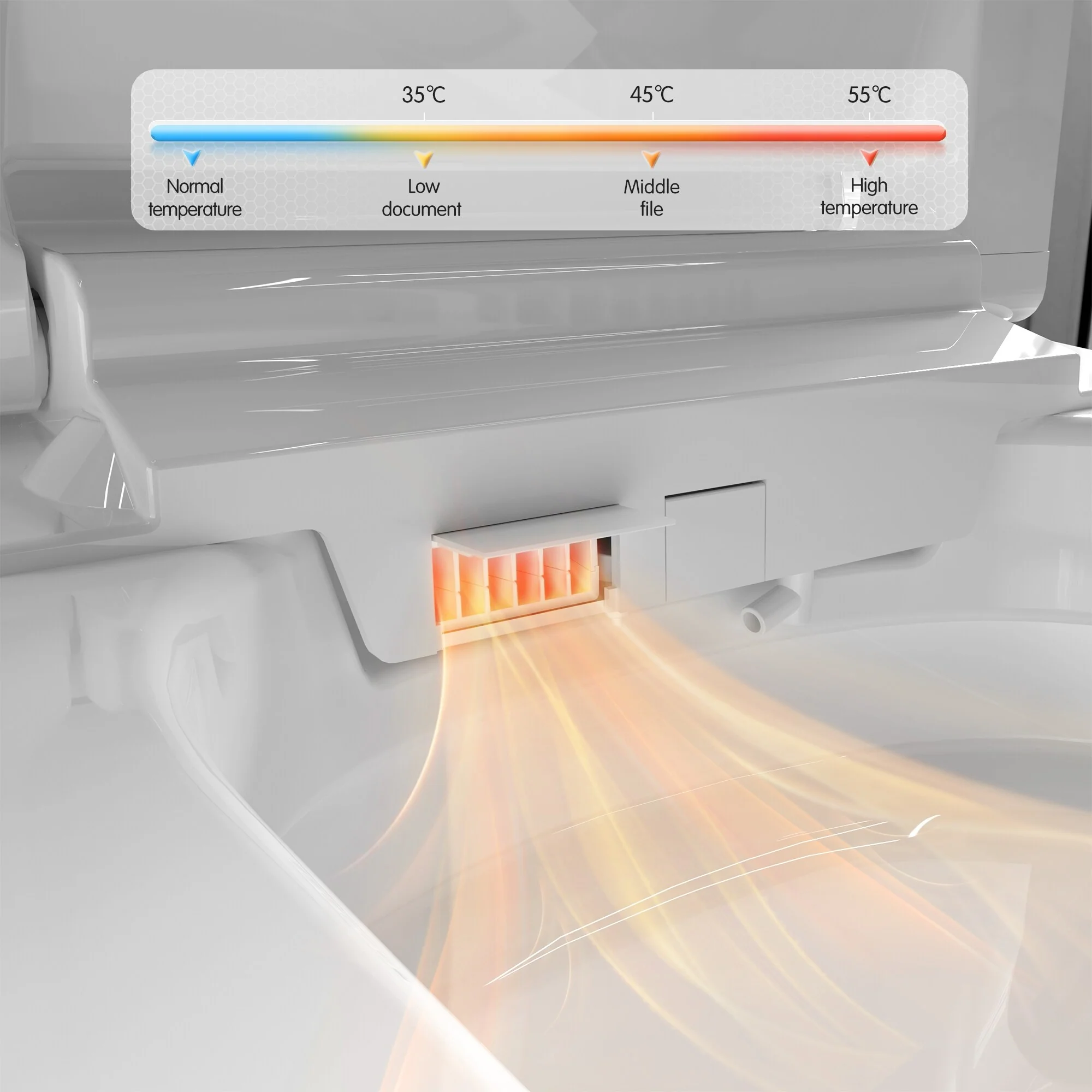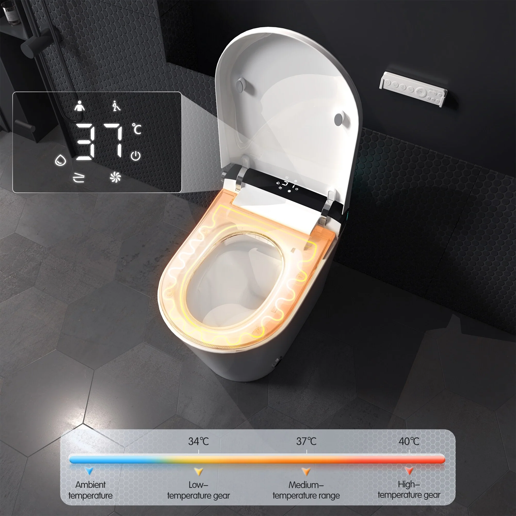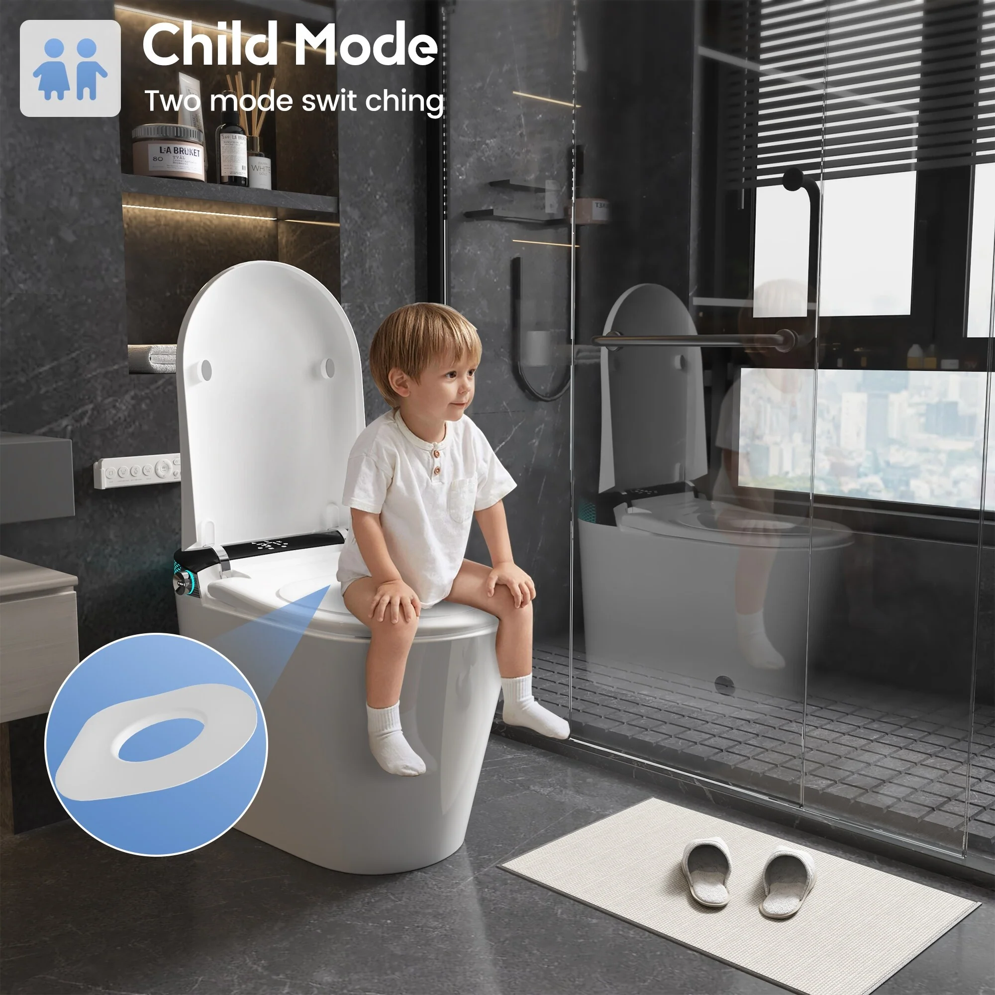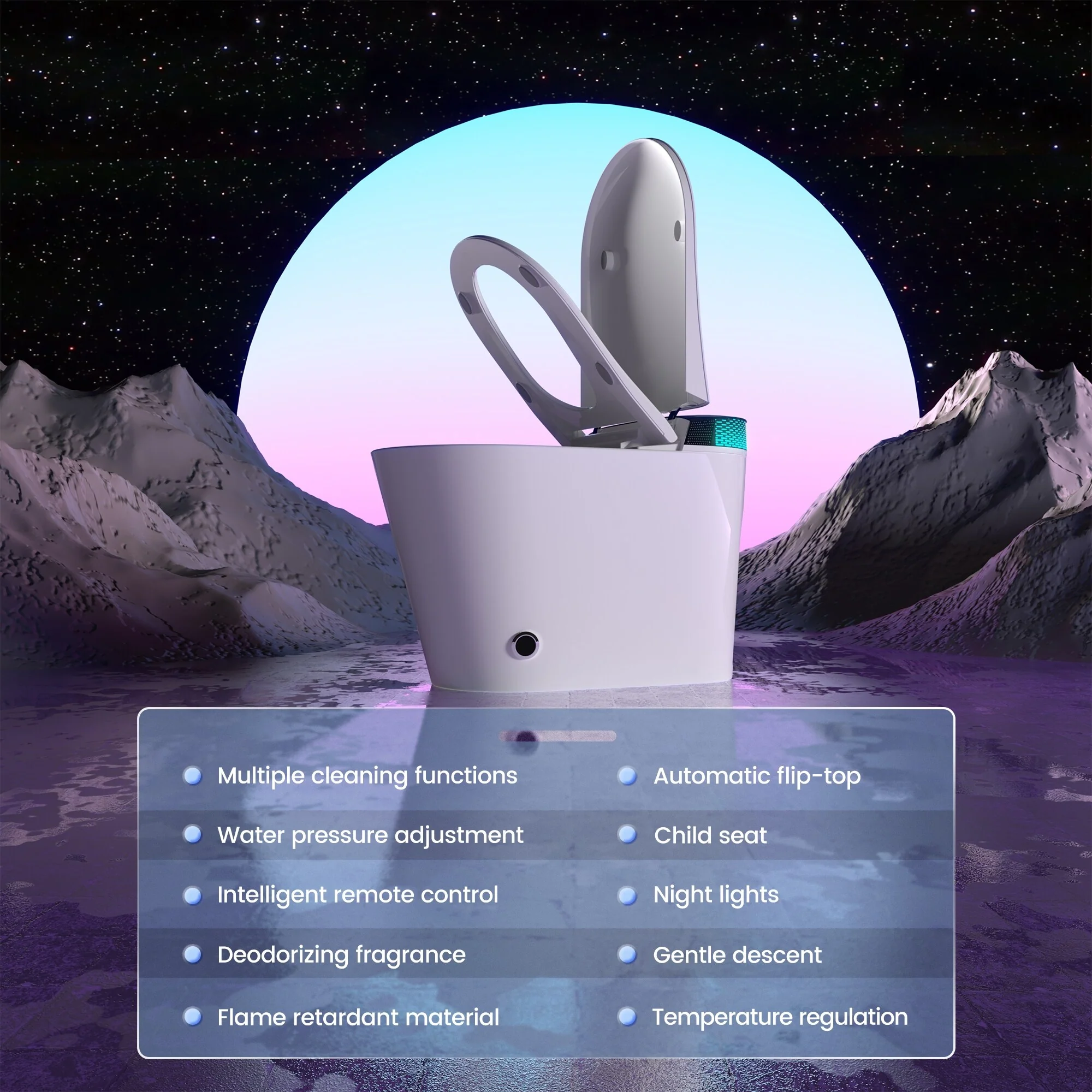 Upgrade your bathroom with the Smart Toilet, a tankless intelligent toilet featuring advanced auto-sensing technology for hands-free lid operation. Certified by ETL, CUPC, and CEC, it ensures safety, superior quality, and energy efficiency. Adjustable heated seating, warm-air drying, and built-in child seat provide ultimate comfort for the entire family. Enjoy automatic flushing options—remote control, foot sensor, or button—for added convenience. An integrated air purifier with aromatherapy keeps your bathroom fresh, while soothing LED ambient lights guide your nighttime visits.