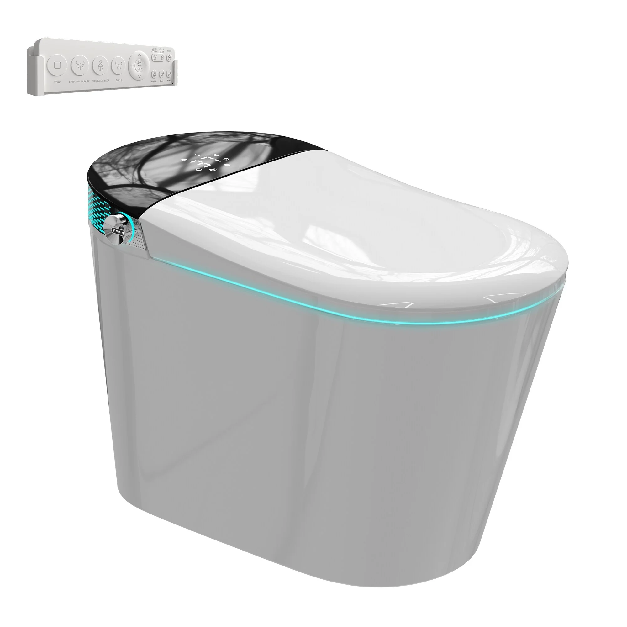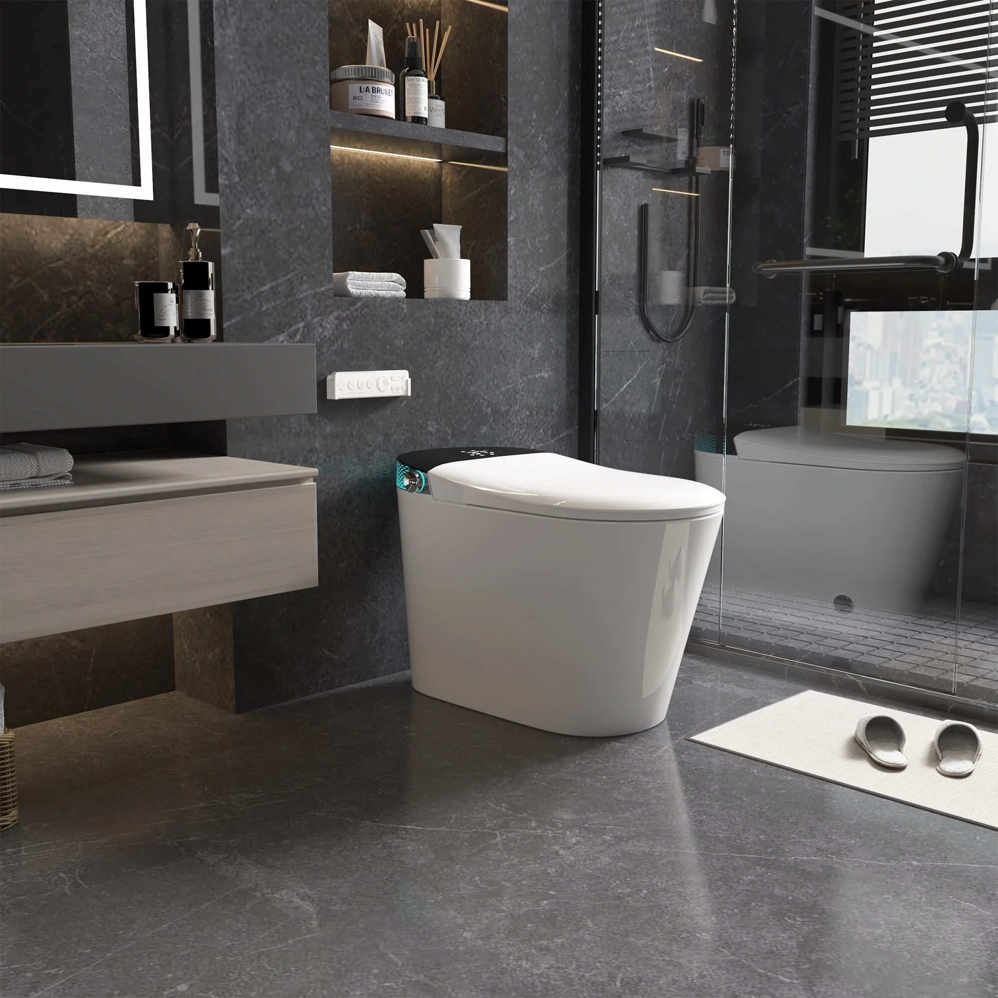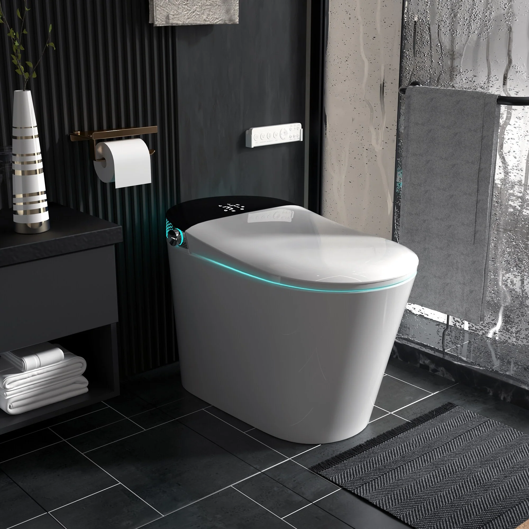 Upgrade your bathroom with the Smart Toilet, a tankless intelligent toilet featuring advanced auto-sensing technology for hands-free lid operation. Certified by ETL, CUPC, and CEC, it ensures safety, superior quality, and energy efficiency. Adjustable heated seating, warm-air drying, and built-in child seat provide ultimate comfort for the entire family. Enjoy automatic flushing options—remote control, foot sensor, or button—for added convenience. An integrated air purifier with aromatherapy keeps your bathroom fresh, while soothing LED ambient lights guide your nighttime visits.