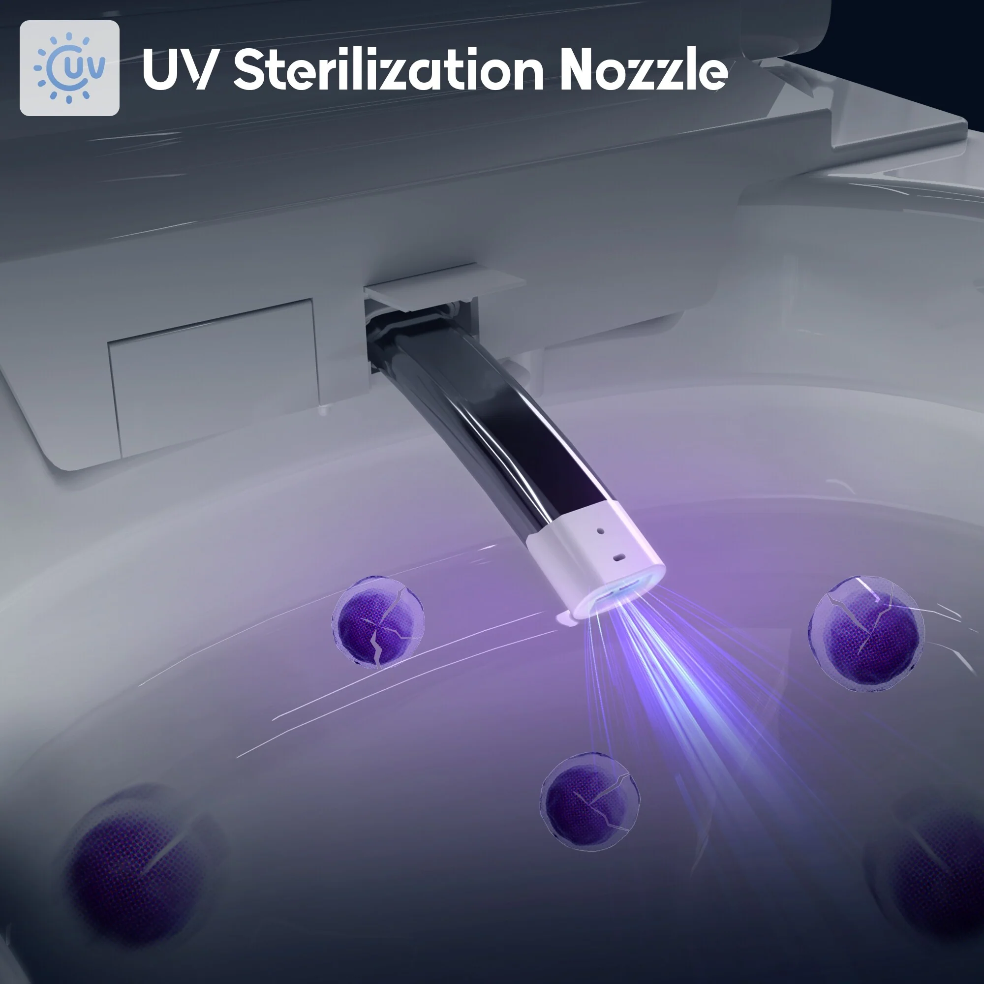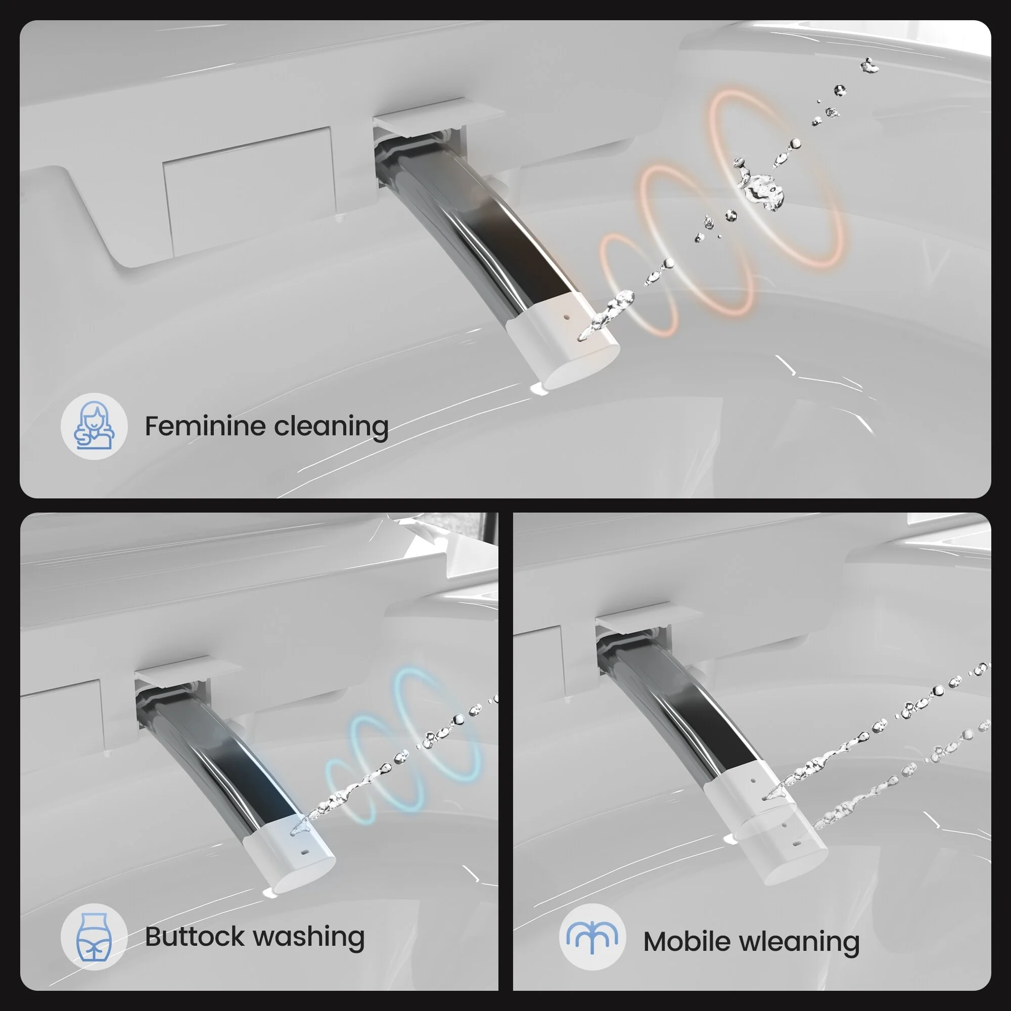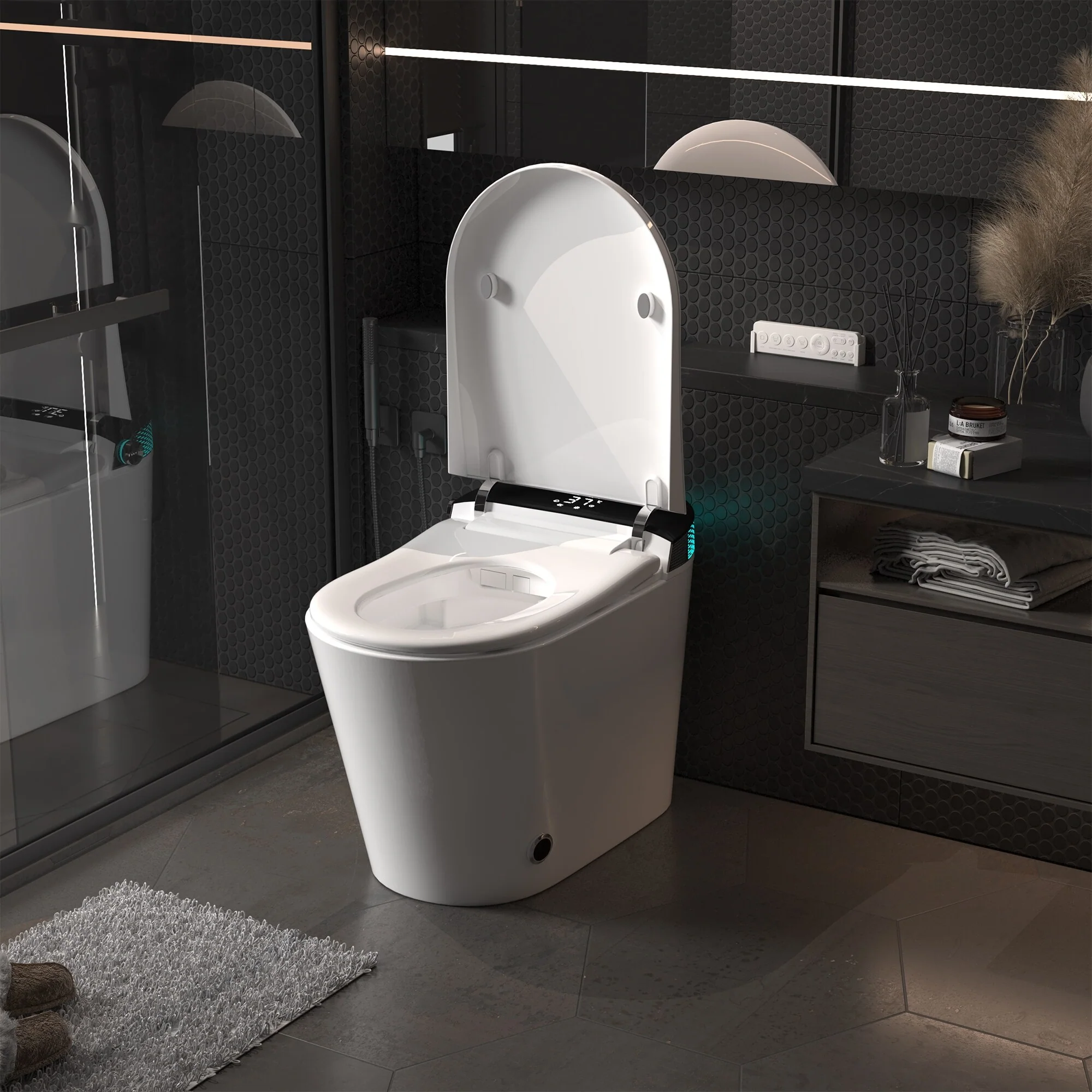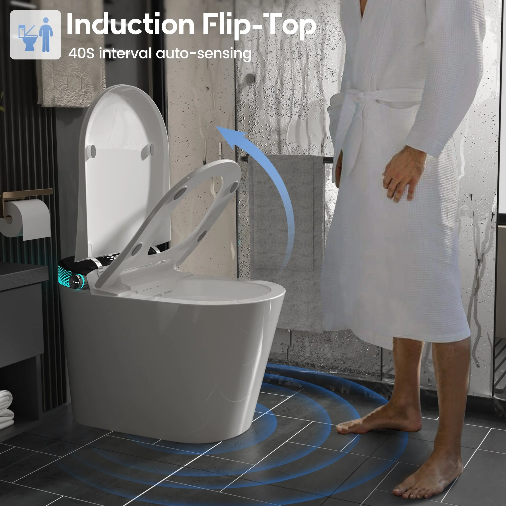 Upgrade your bathroom with the Smart Toilet, a tankless intelligent toilet featuring advanced auto-sensing technology for hands-free lid operation. Certified by ETL, CUPC, and CEC, it ensures safety, superior quality, and energy efficiency. Adjustable heated seating, warm-air drying, and built-in child seat provide ultimate comfort for the entire family. Enjoy automatic flushing options—remote control, foot sensor, or button—for added convenience. An integrated air purifier with aromatherapy keeps your bathroom fresh, while soothing LED ambient lights guide your nighttime visits.