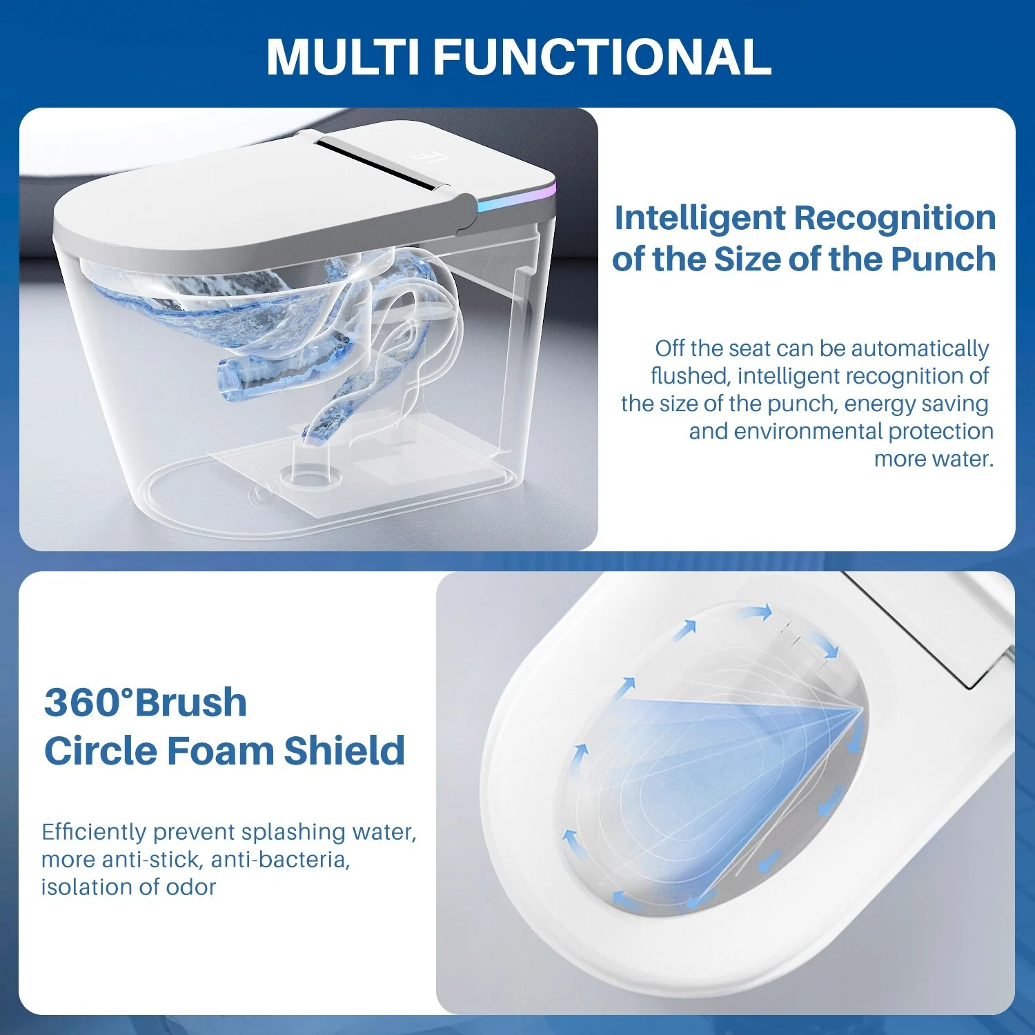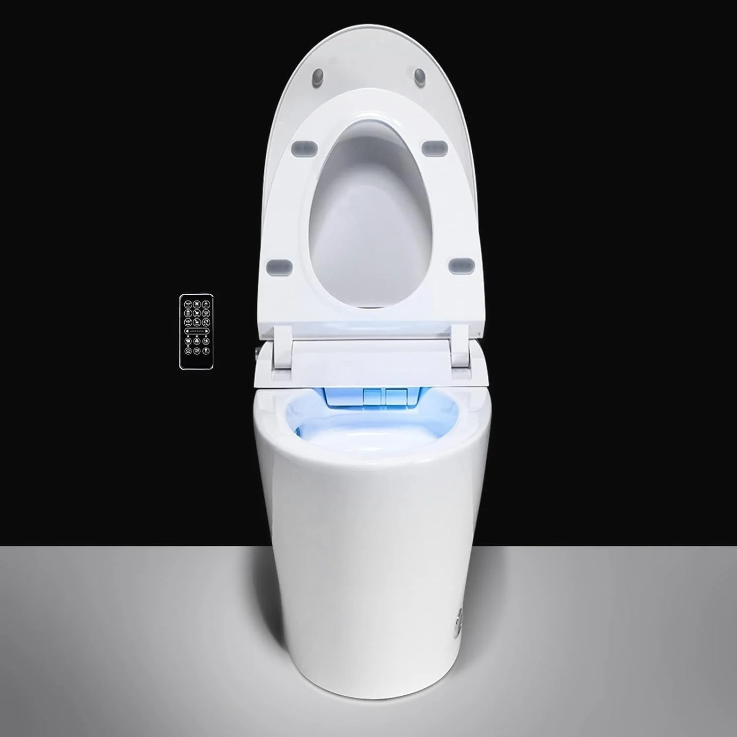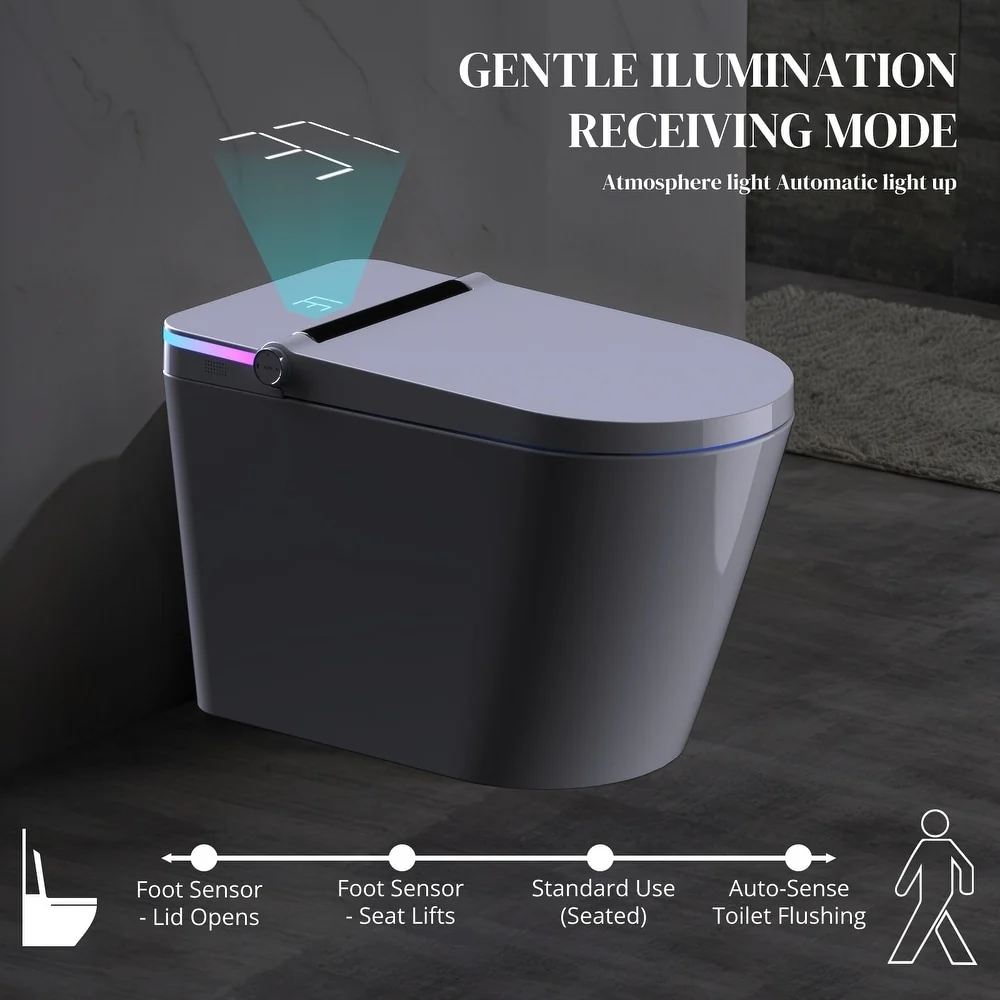 - 🚽 Hands-Free Toilet with Advanced Dual Flushing: Our sensor-equipped toilet offers a touch-free experience—the lid opens and closes automatically. Enjoy eco-friendly waste disposal with automatic flushing options like off-seat, push-button, foot sensor, and remote-controlled flushing. One initiation activates siphon and jet flushing mechanisms for a thorough double-cleanse cycle, complemented by a backup flush function during power outages.