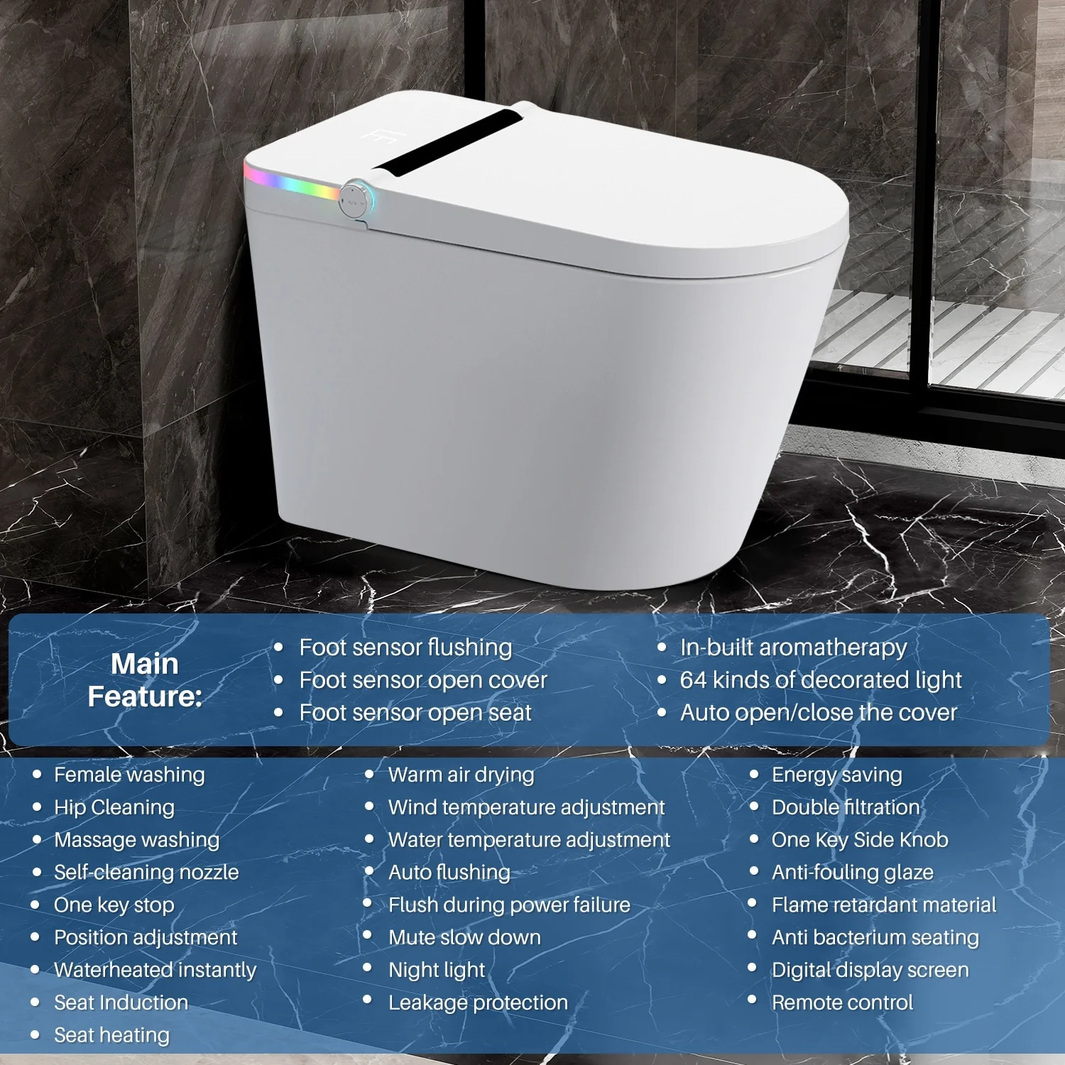- Morden Smart Toilet: Features auto lid opening & closing, foot sensor-activated seat opening, heated toilet seat, automatic flushing, power-off flushing, adjustable temperature settings, self-cleaning stainless steel nozzle, soft nightlight, air cleansing system, instant heated water and a warm air dryer. Enjoy enhanced convenience with an intuitive LED screen and remote control.