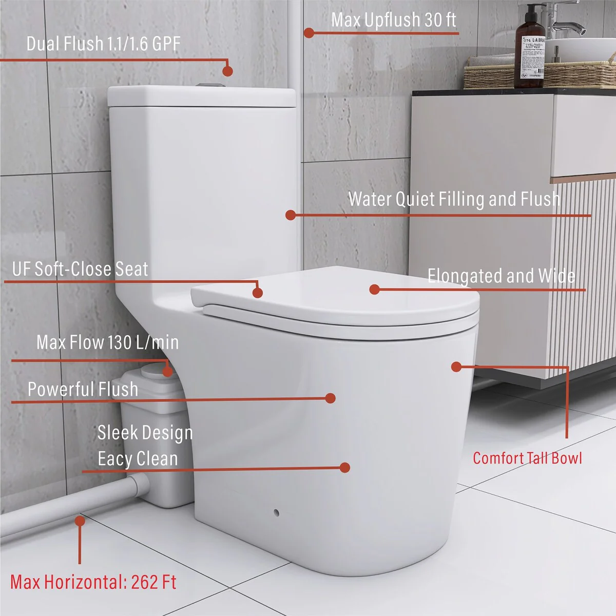 - Powerful Pump: 600W Macerator Pump, 262' Horizontal & 30' Vertical Pumping
