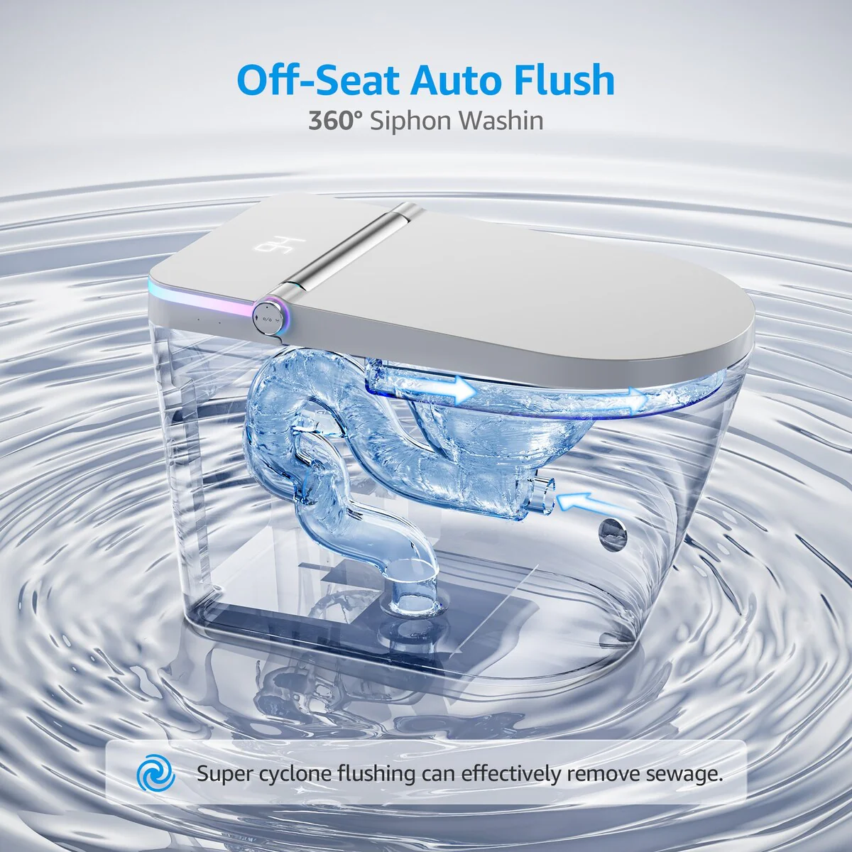 - Environmentally friendly and energy-saving: This smart toilet uses innovative no-water-pressure-limiting technology. Featuring a powerful cyclonic siphon flushing system, this technology is highly effective at wastewater treatment and thorough bowl cleaning, making it ideal for homes with low water pressure. In addition, the toilet is converted into a low-energy mode in an energy-saving state, reducing power consumption.