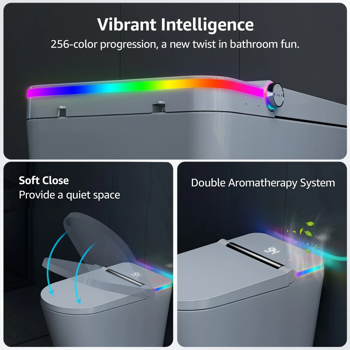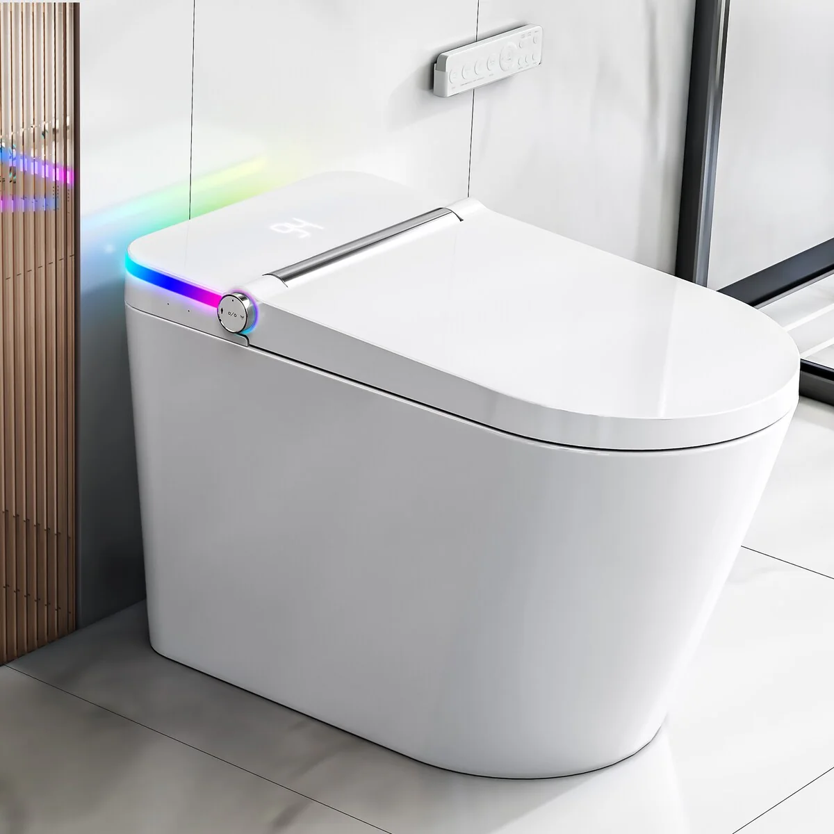 In today's busy and fast-paced life, infusing every daily detail with joy and comfort becomes paramount. To create a bathroom environment that uplifts your mood, we proudly introduce our brand-new line of smart toilets, seamlessly blending unique style with modern technology. Leading the way in smart technology, our smart toilets not only boast basic features like Automatic Flushing Hip Cleaning, Warm Air Drying, and Warm Seat Adjustment but also incorporate the design of colorful LED strips. Whether it's the fresh blue light, the warm yellow glow, or the romantic purple hue, it provides you with a unique sensory experience. The changing colors not only personalize your bathroom space but also enhance your bathing experience, adding a touch of vibrancy to the start and end of each day. Featured advanced motion-sensing technology. With just a gentle movement, the toilet lid automatically opens, offering you a seamless user experience. Our smart toilets are environmentally friendly, equipped with water-saving features.