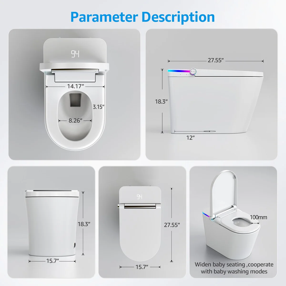 - LED lighting: The toilet has a real-time dynamic display on the LCD screen, showing the usage of its functions in a practical and gorgeous way. In addition, it is equipped with an LED night light, providing convenient and soft lighting at night.