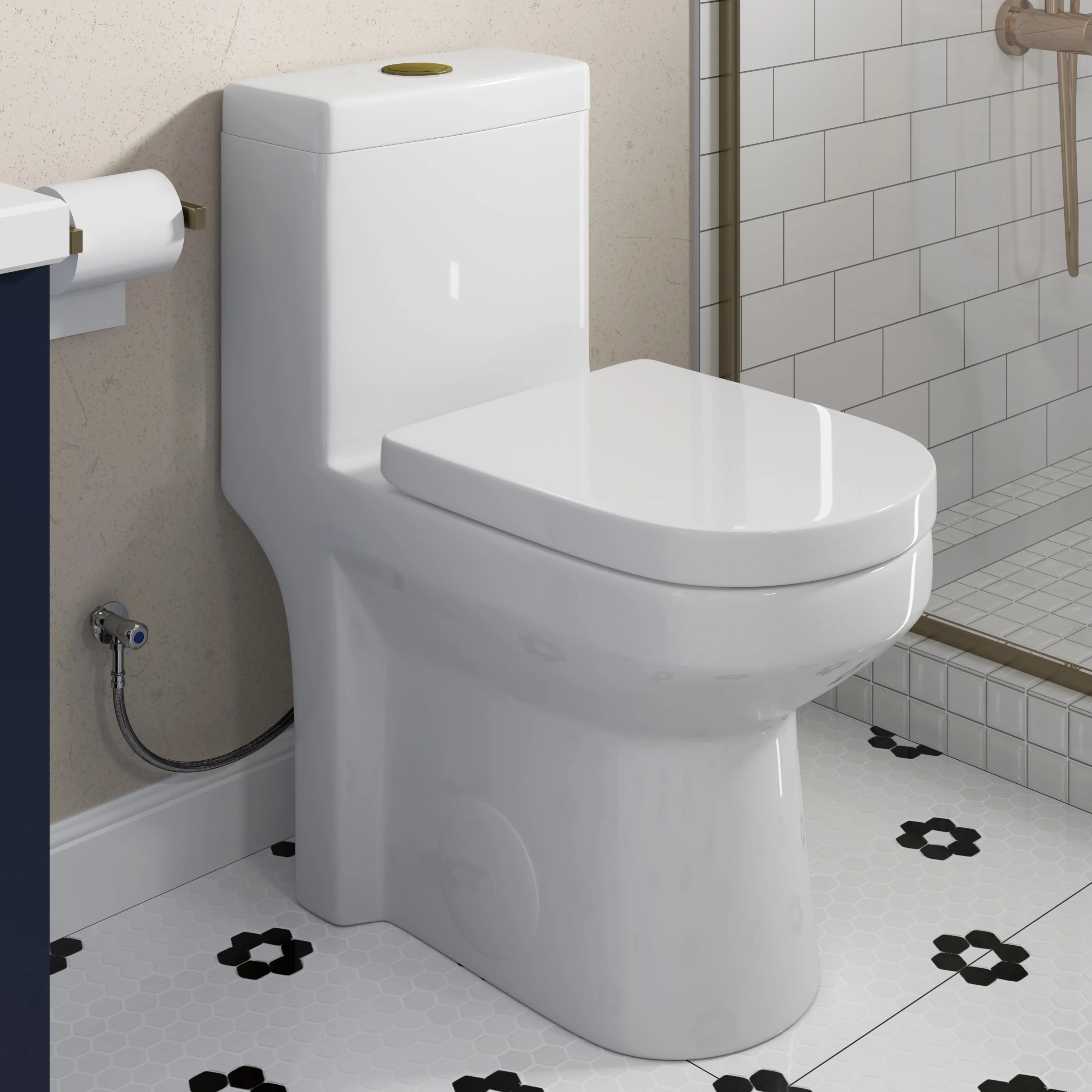 HOROW One-piece 0.8/1.28 GPF High Efficiency Dual Flush Round Toilet in White with Seat Included and Brushed Gold Button