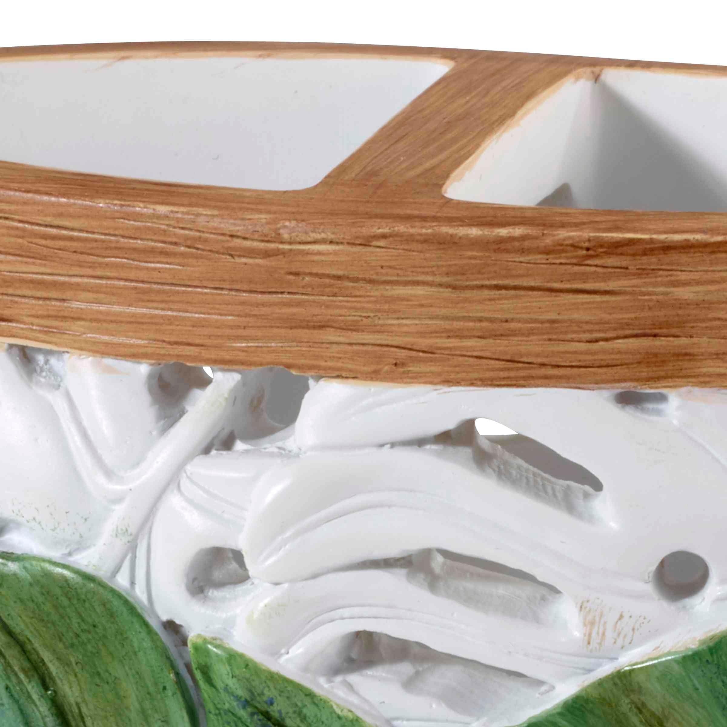 The Avanti Viva Palm Toothbrush Holder features a textural white leaf cut-out background with 2 large three-dimensional philodendron leaves in multiple shades of green. The base is decorated with a faux-wood finish. Made of durable, hand-painted resin for long-lasting use.