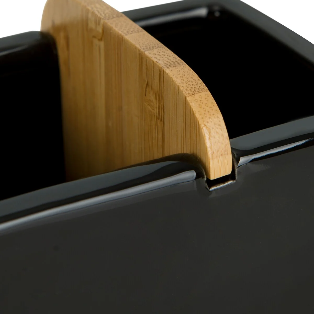 Add an updated contemporary touch to your bathroom with the Haven Toothbrush Holder by Allure Home Creation. The oblong shape of this minimalist design is featured in a rich shiny black finish accented with a light bamboo divider on top. This holder is made of ceramic with two varied sized openings. Conveniently store and organize your toothbrushes, toothpaste, or other bathroom essentials that you want to keep nearby. This classic accessory will dress your bathroom with sophisticated style. Use alone or coordinate with other matching pieces in the Haven Bath Accessory Collection. Hand Wash, Spot or Wipe Clean.