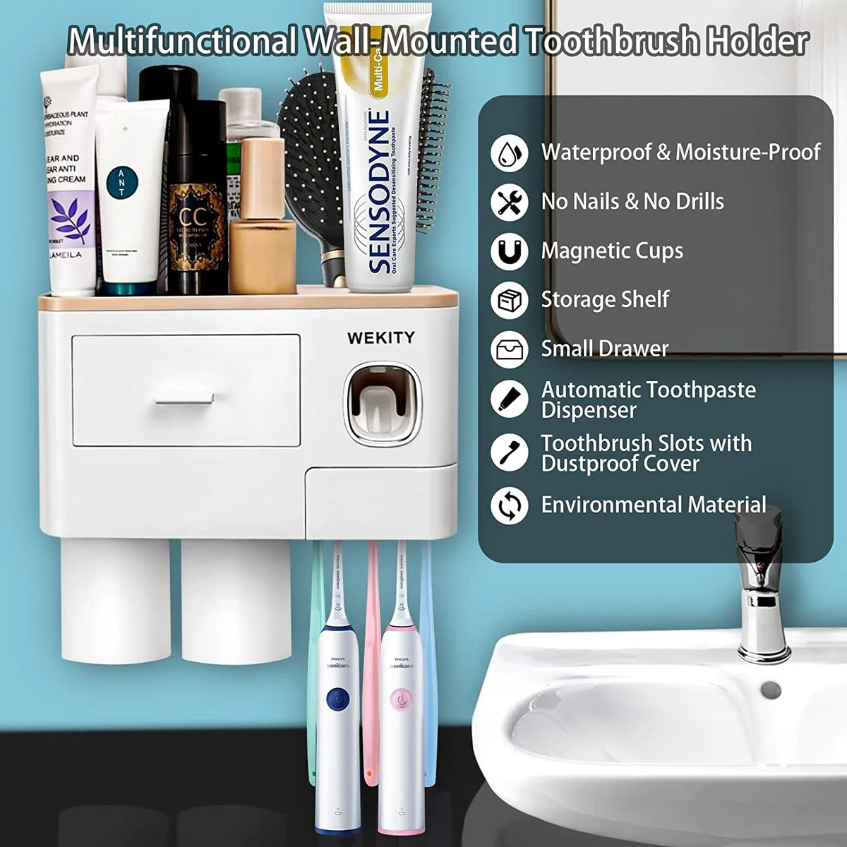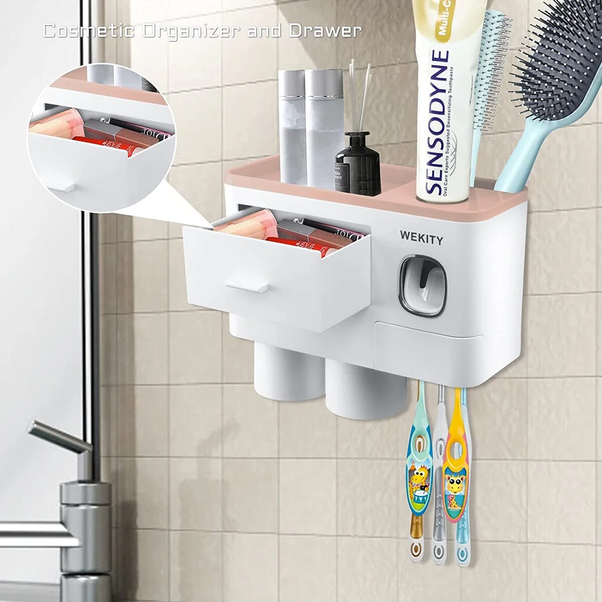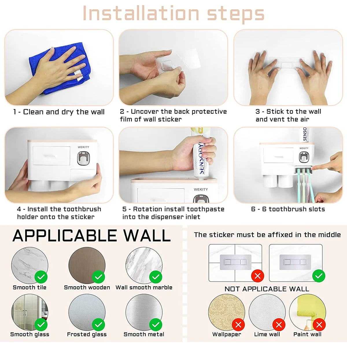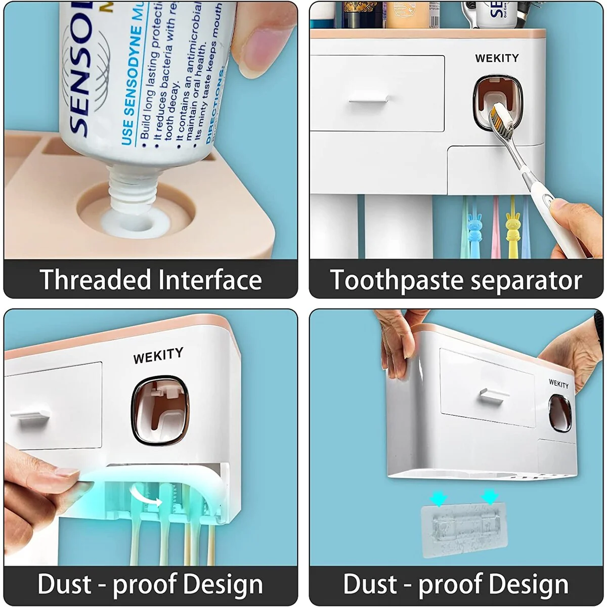 [AUTOMATIC TOOTHPASTE DISPENSER]This toothbrush holder come with 1 toothpaste squeezer. The dispenser squeezes the perfect amount each time, no waste of toothpaste and automatically assigning toothpaste to you.