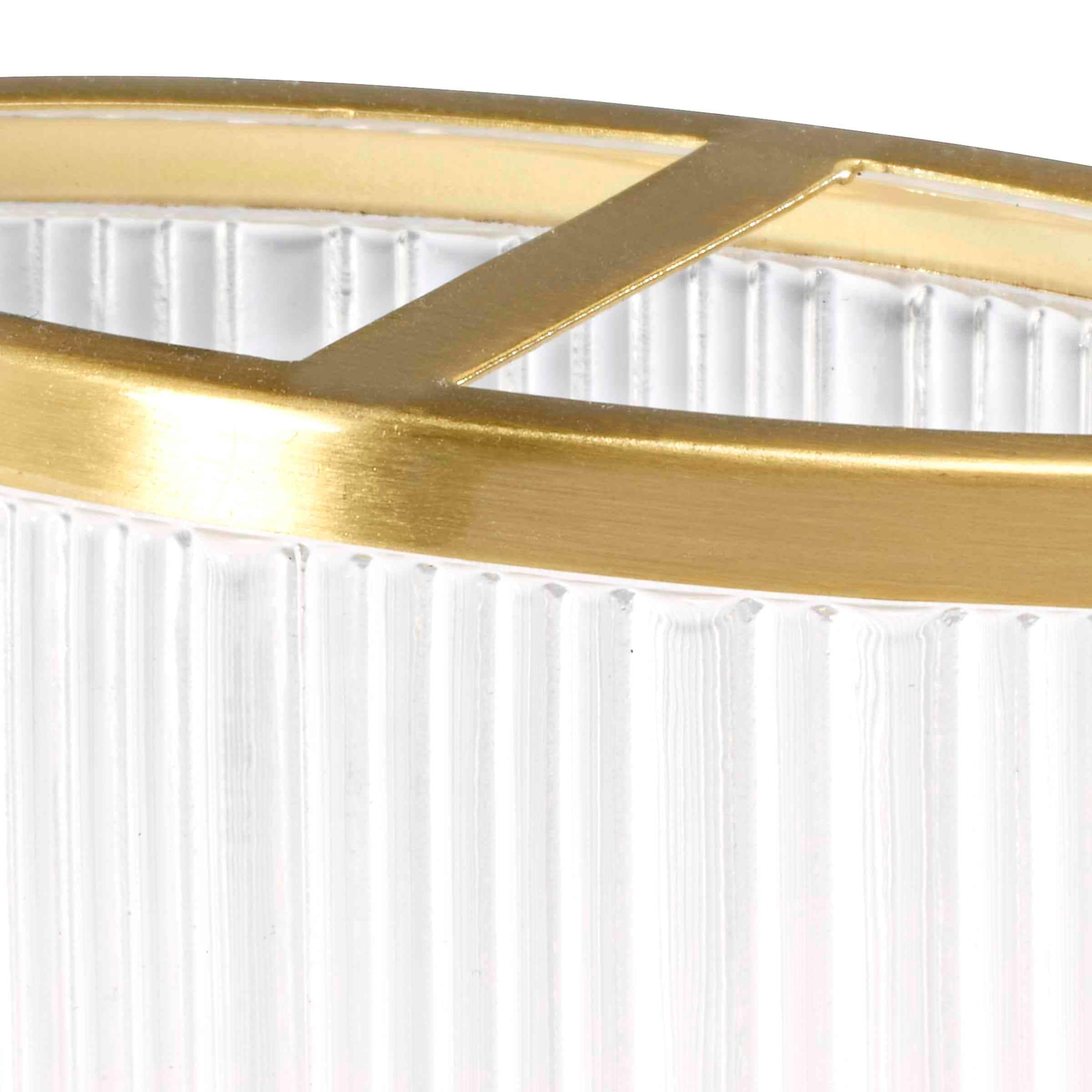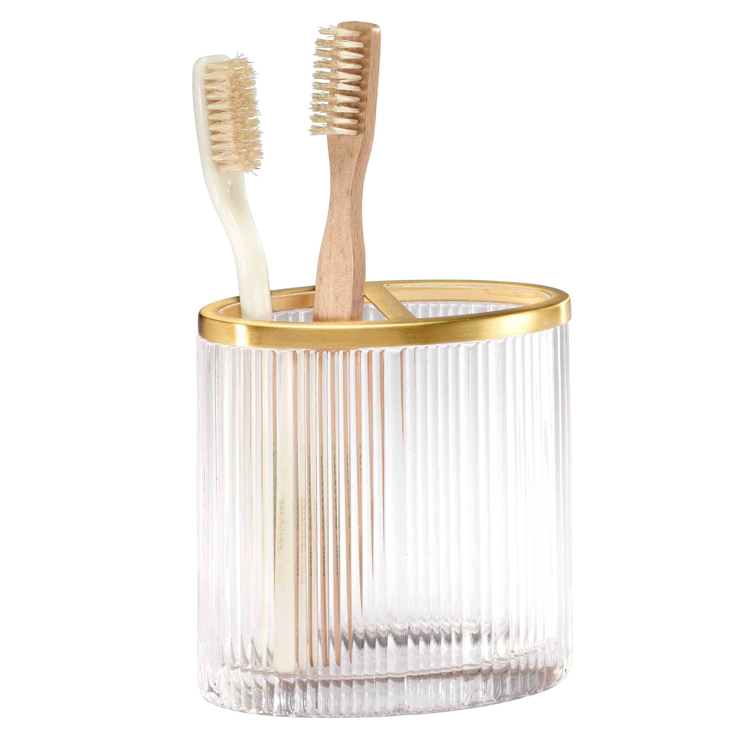 The Nicole Miller Louise Toothbrush Holder features a clear fluted design with a brushed gold rim decorating the top and creating the two compartments. Made of glass, easy-care. A great addition to any bathroom, bedroom or office for storage-works with almost any décor.