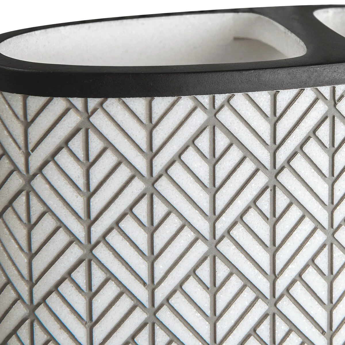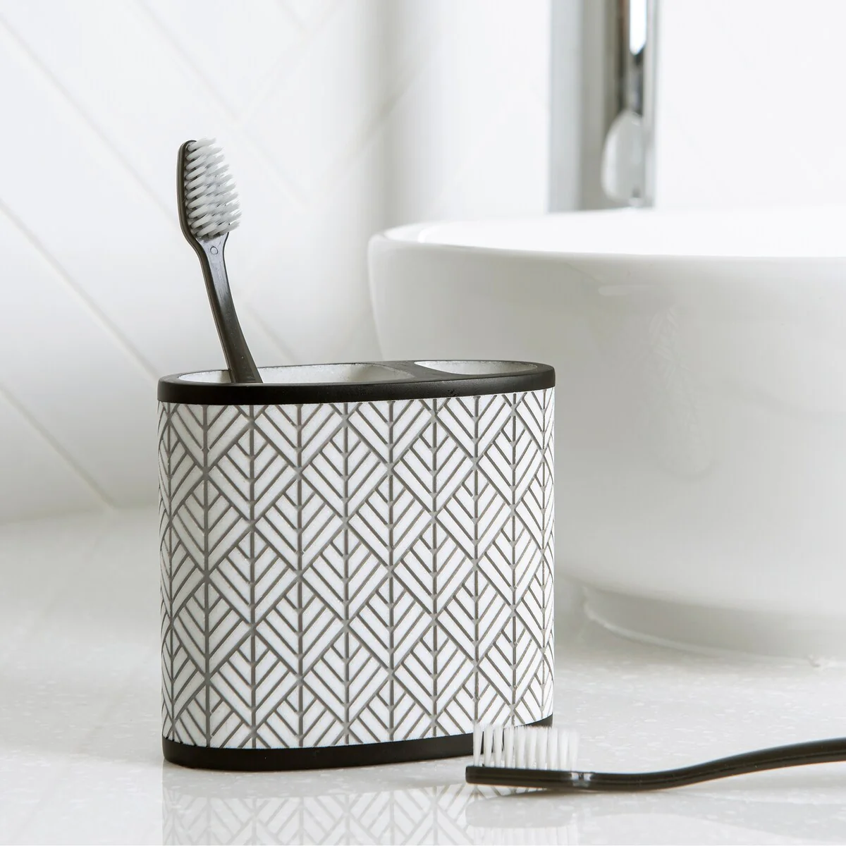 Give your bathroom a stylish update with the Shelby Toothbrush Holder by Allure Home Creation. This oval debossed holder, crafted from resin in charcoal and white highlighted with black trim, features a sleek linear geometric pattern. It has two varied-sized openings that will hold toothbrushes, toothpaste, or other bathroom essentials that you want to store upright and keep nearby. This art deco inspired piece will dress your countertop with sophisticated industrialized style. Use alone or coordinate with other matching pieces in the Shelby Bath Collection. Hand Wash, Spot or Wipe Clean.