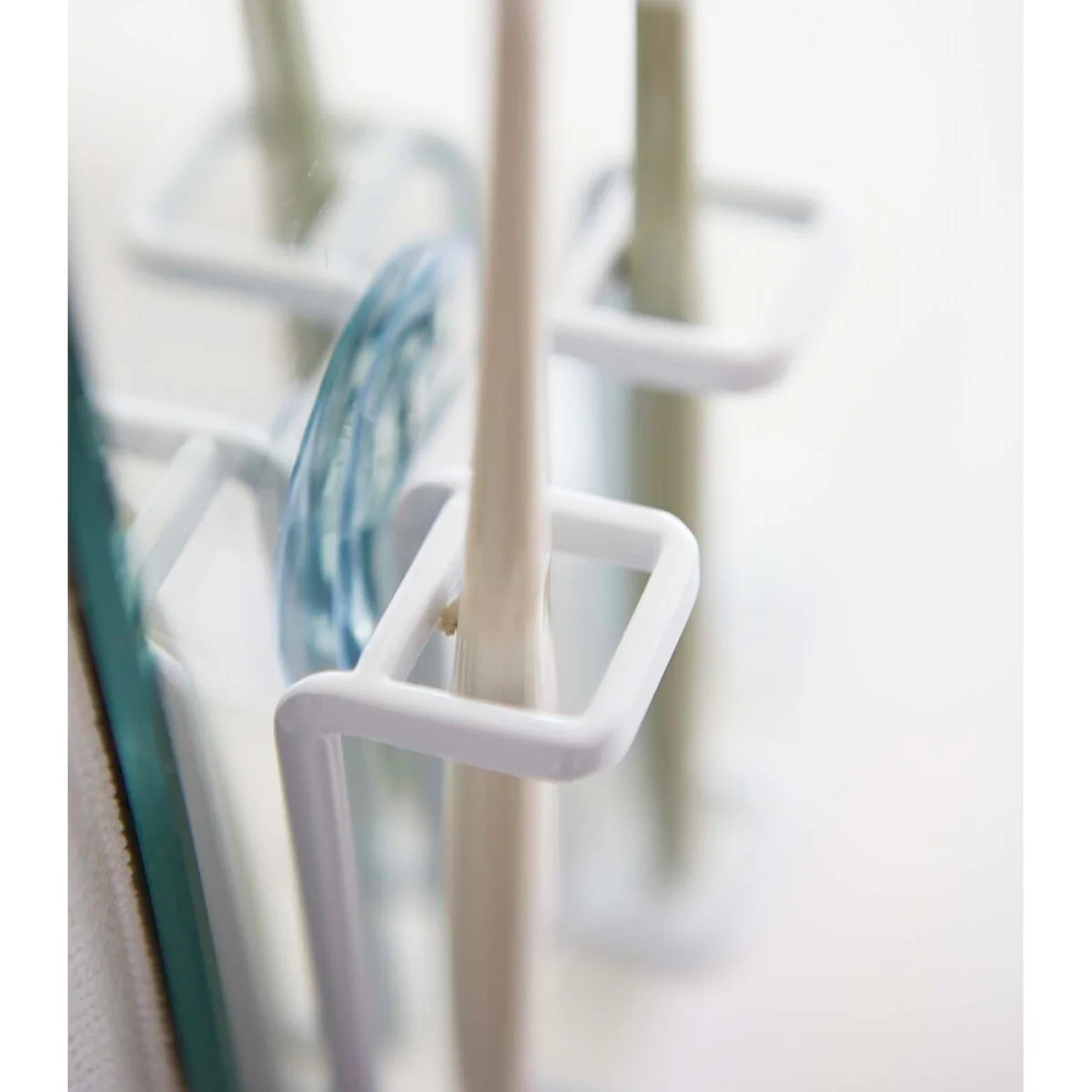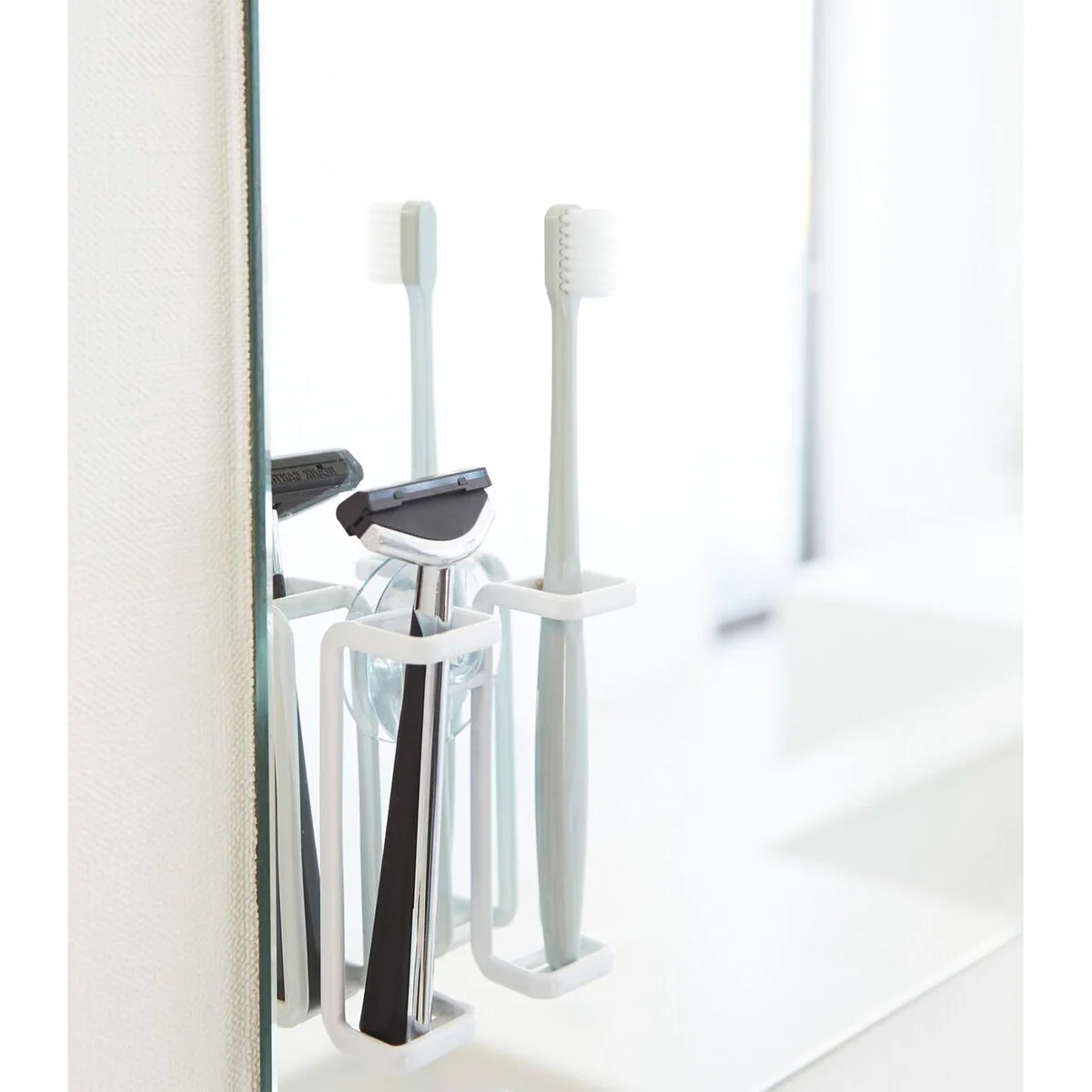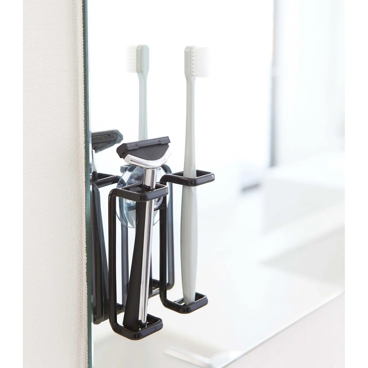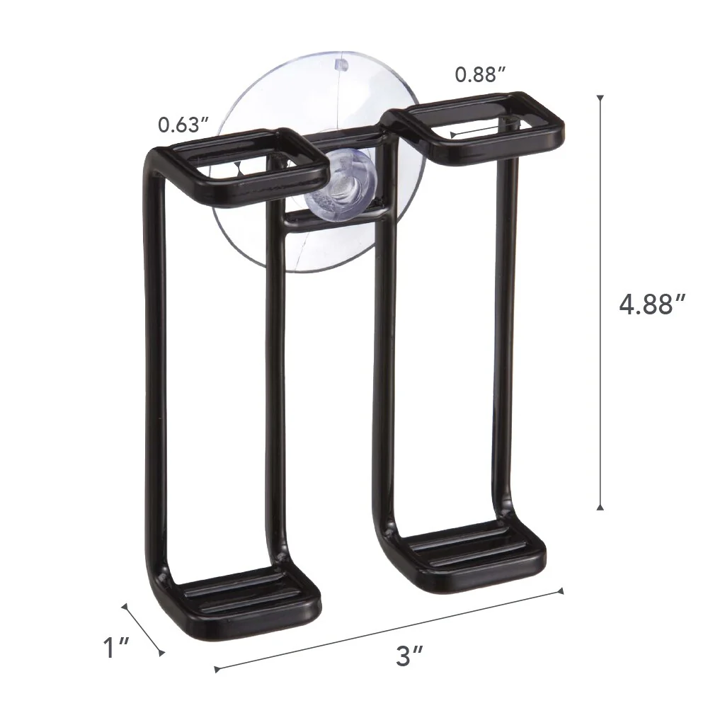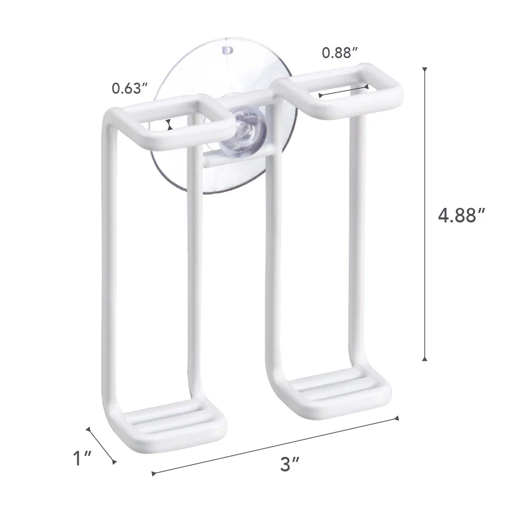 TOOTHBRUSH HOLDER: Open up space on your bathroom countertop with this suction cup toothbrush holder. The open-frame bottom won’t collect water, unlike a cup., THOUGHTFUL DESIGN: While most toothbrush storage options let the toothbrushes bump together, this one keeps them apart for a more sanitary option., VERSATILITY: This toothbrush stand can be placed on the counter or easily attach it to a shower wall or mirror for extra space with the suction cup feature. It can also be used to hold razors or makeup accessories., QUALITY MATERIALS: The steel holder is powder coated to be rust resistant and can hold .55 lbs of weight.