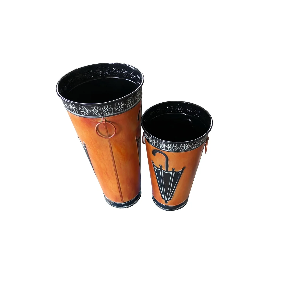 Artisanally crafted for a bold, fun look, this two piece set of umbrella stands makes an amazing fit for your mudroom, foyer, or entryway. Handcrafted from lightweight yet sturdy metal frames, each stand depicts a gorgeous molded umbrella design with subtle engraved details around it. The antique brown, black, and white tone finish bring a tasteful splash of color to your interior decor. Featuring wide round openings to easily accommodate multiple umbrellas at once, the cut out handles offer portability during cleaning or redecorating.