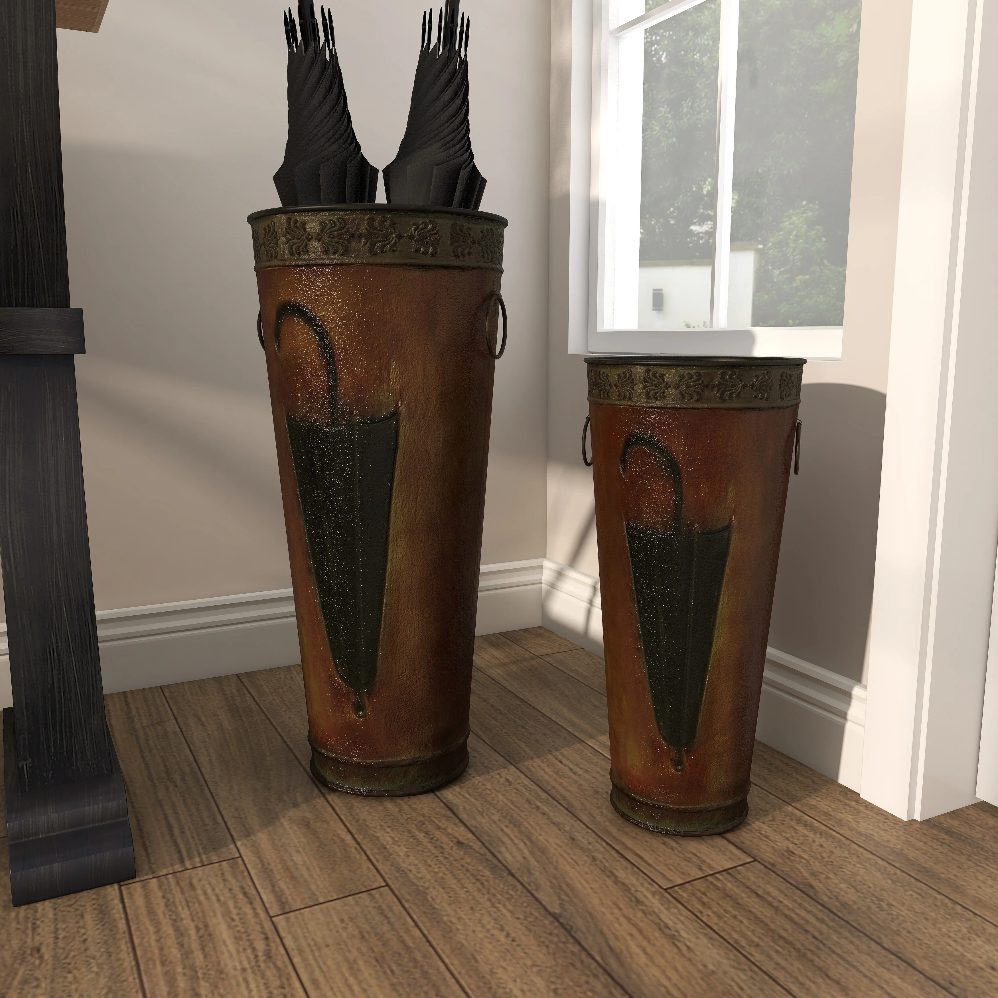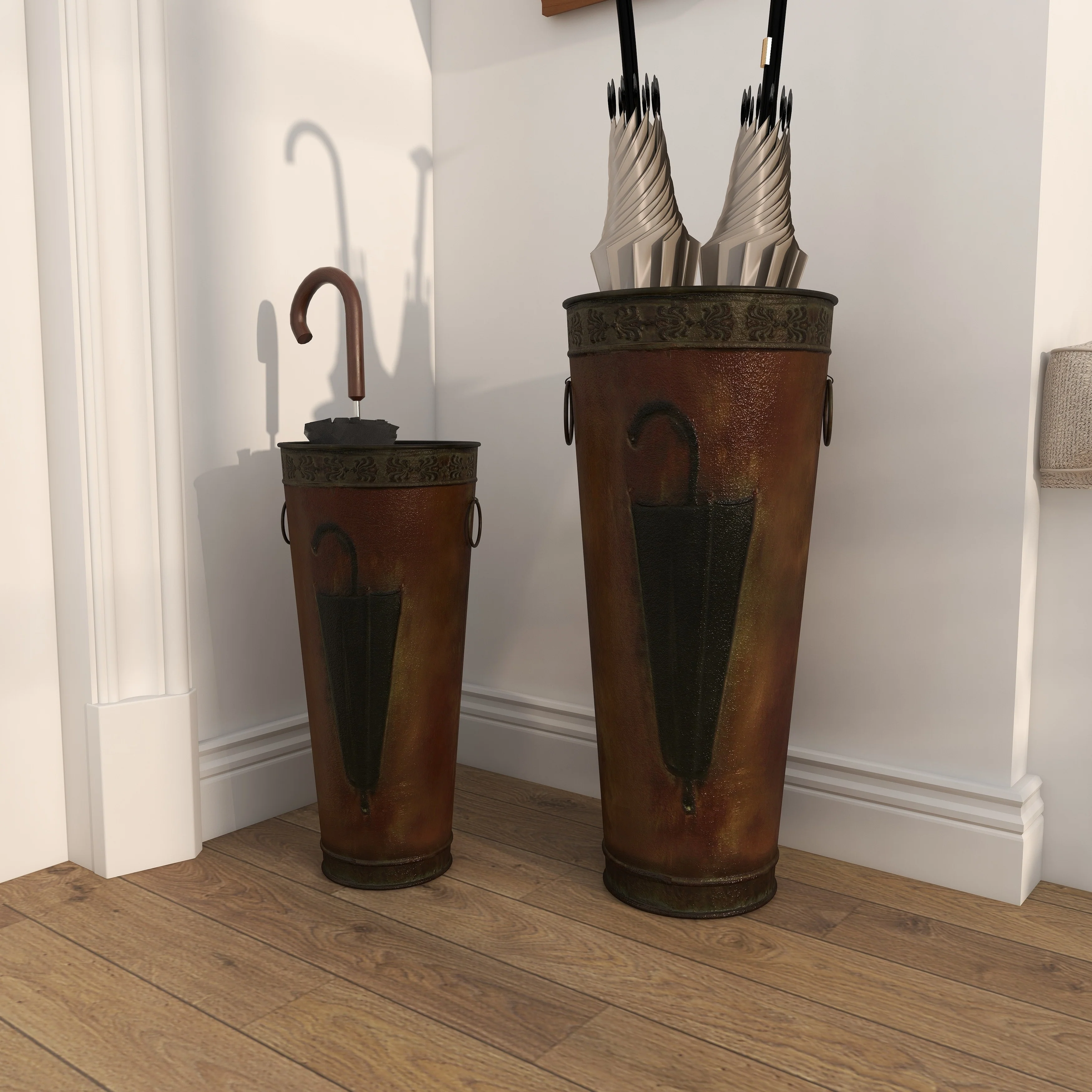 Artisanally crafted for a bold, fun look, this two piece set of umbrella stands makes an amazing fit for your mudroom, foyer, or entryway. Handcrafted from lightweight yet sturdy metal frames, each stand depicts a gorgeous molded umbrella design with subtle engraved details around it. The antique brown, black, and white tone finish bring a tasteful splash of color to your interior decor. Featuring wide round openings to easily accommodate multiple umbrellas at once, the cut out handles offer portability during cleaning or redecorating.