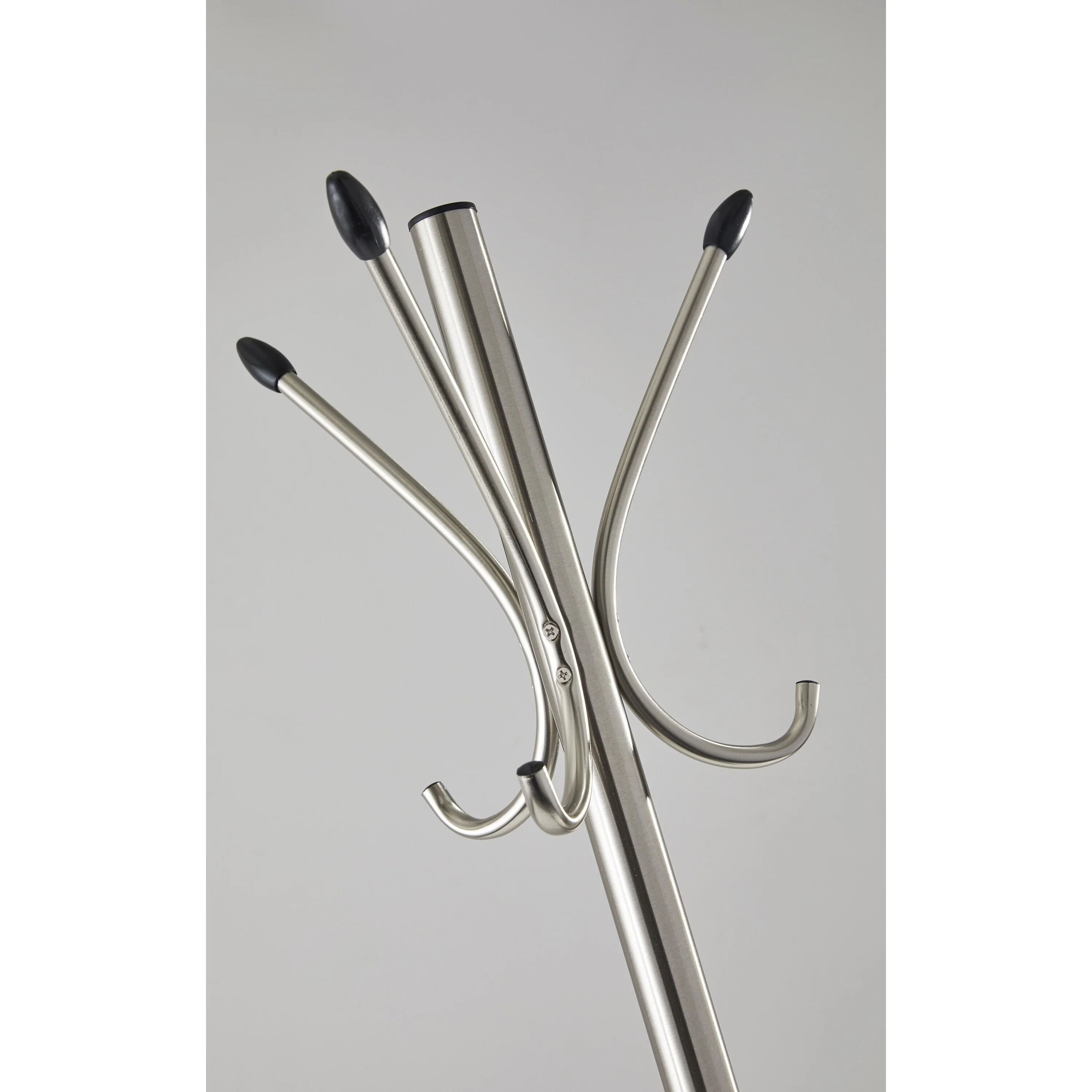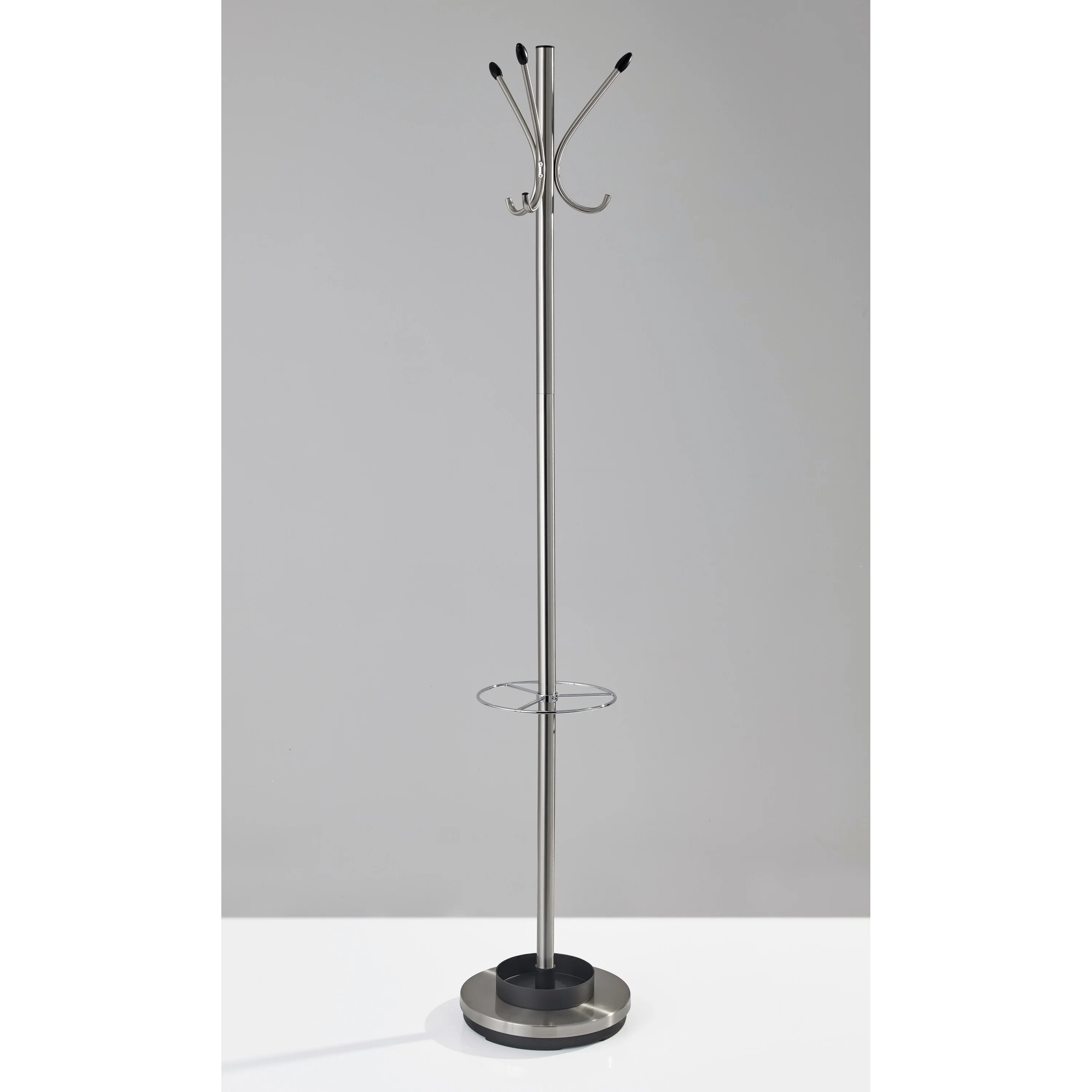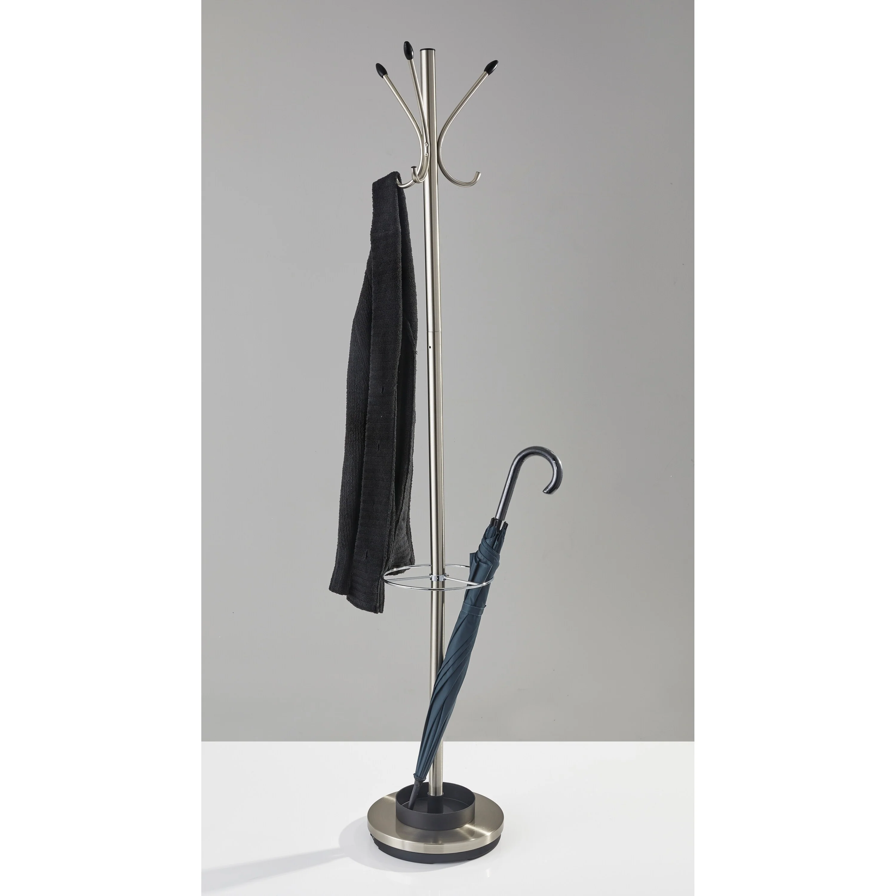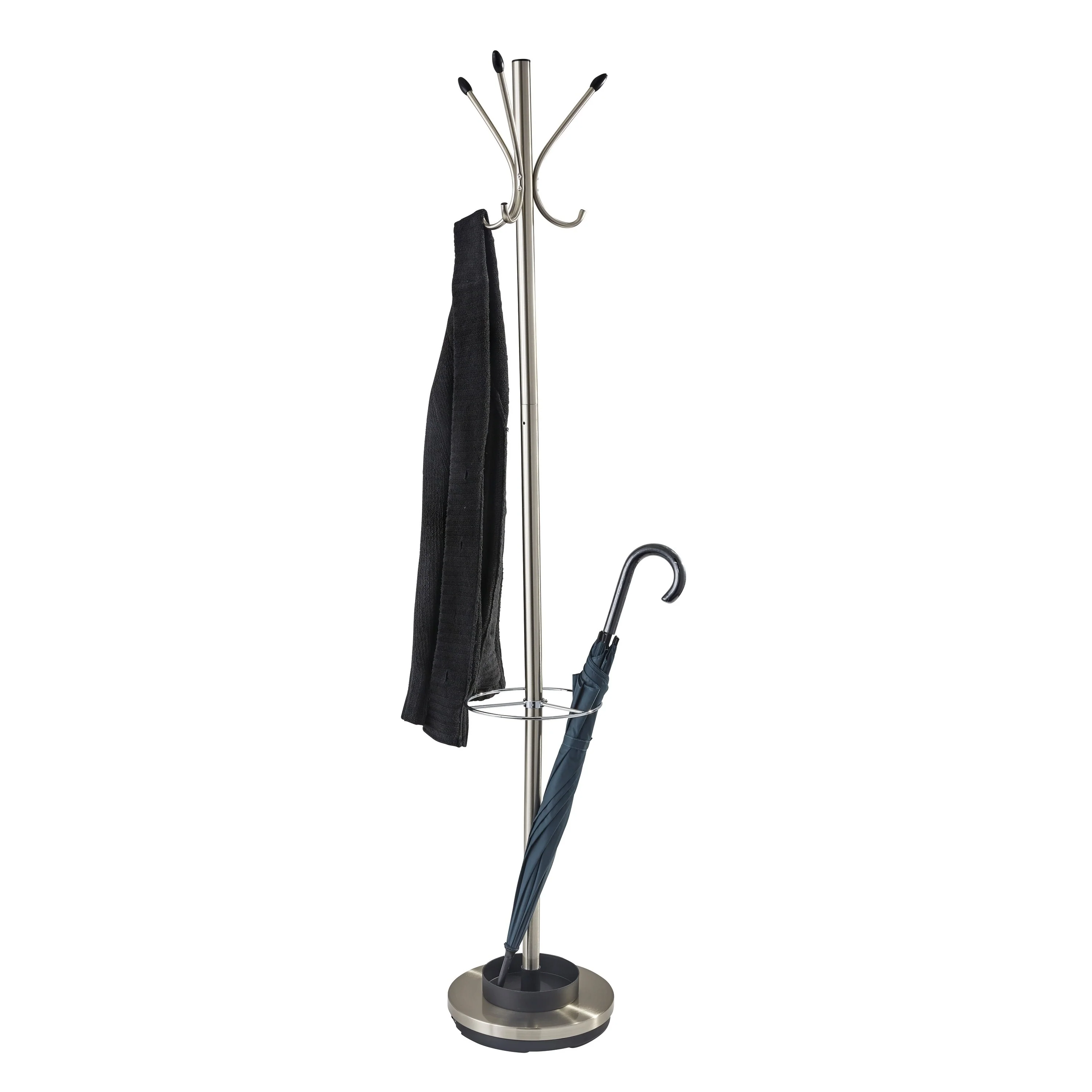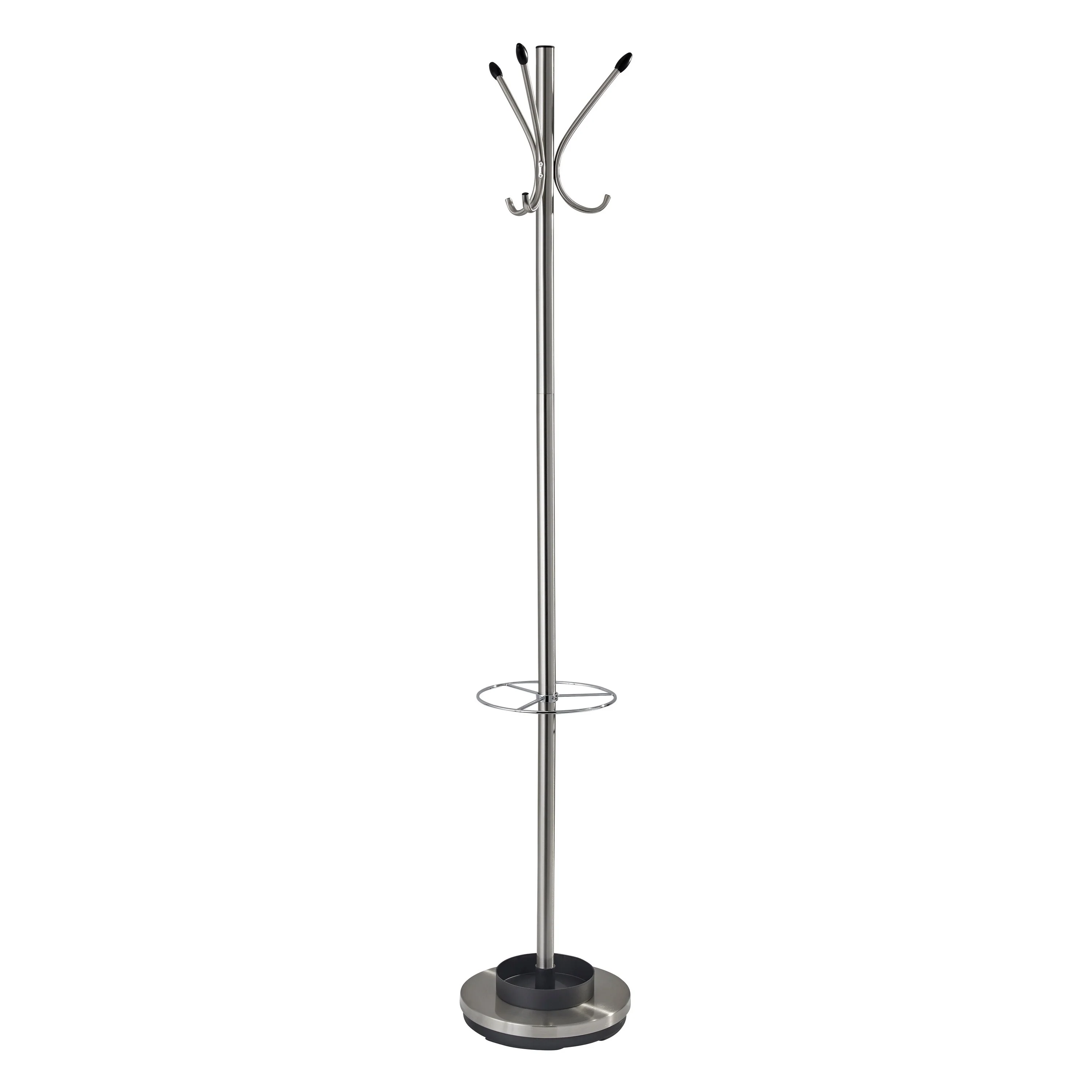 With a slight nod to antique stands, this model features three curving hooks that offer six places to hang coats and jackets. Black wood accents give fashion flair and below, a black plastic tray at the base catches water from dripping umbrellas.