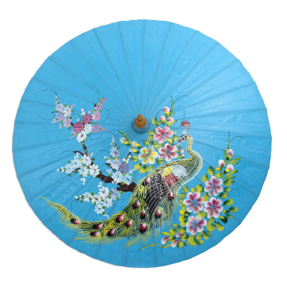 Strutting his stuff, a flamboyant peacock steals the show on an elegant handcrafted parasol. The elegant bird is painted by hand by Thai artisan Nikom on the blue cotton and rayon from bamboo parasol.