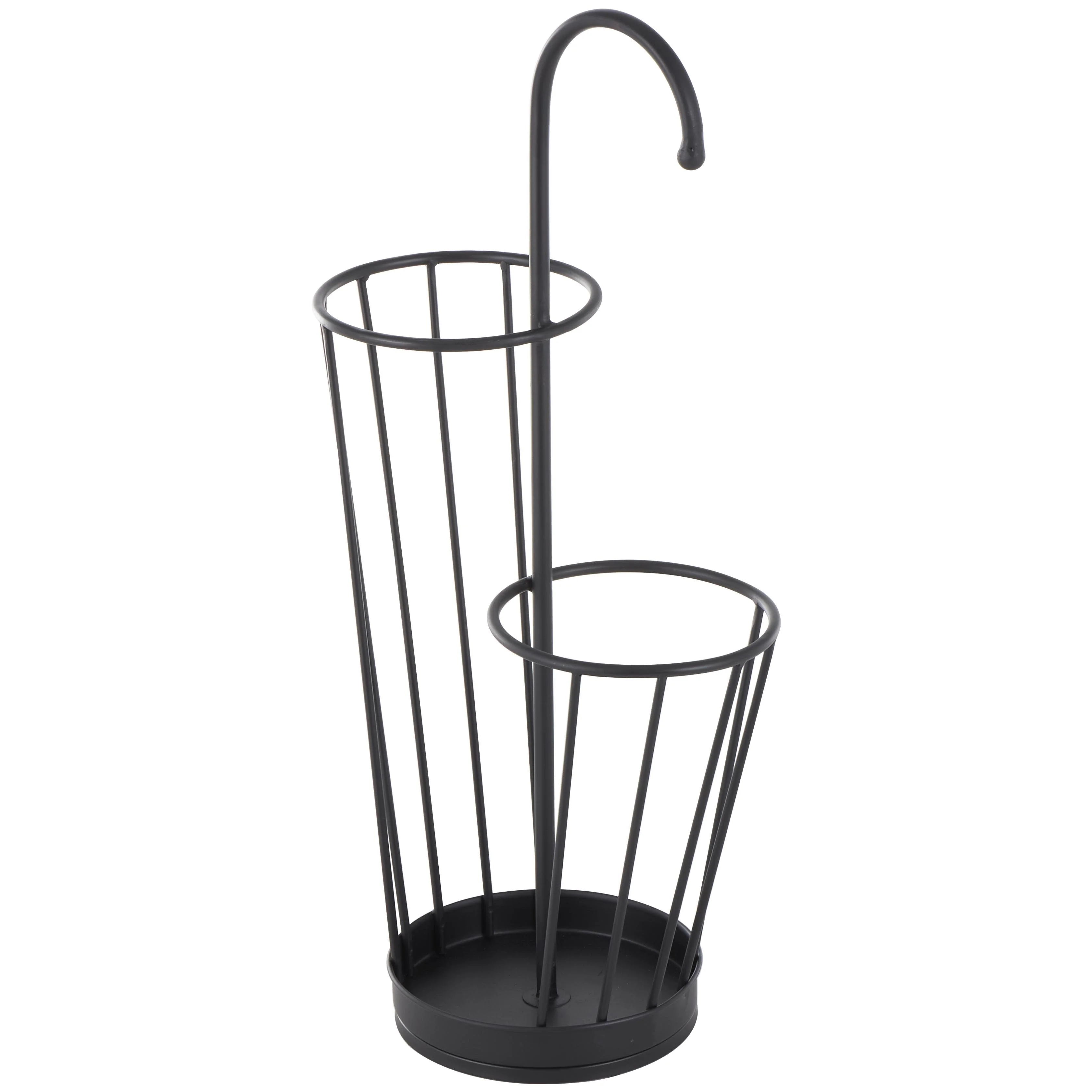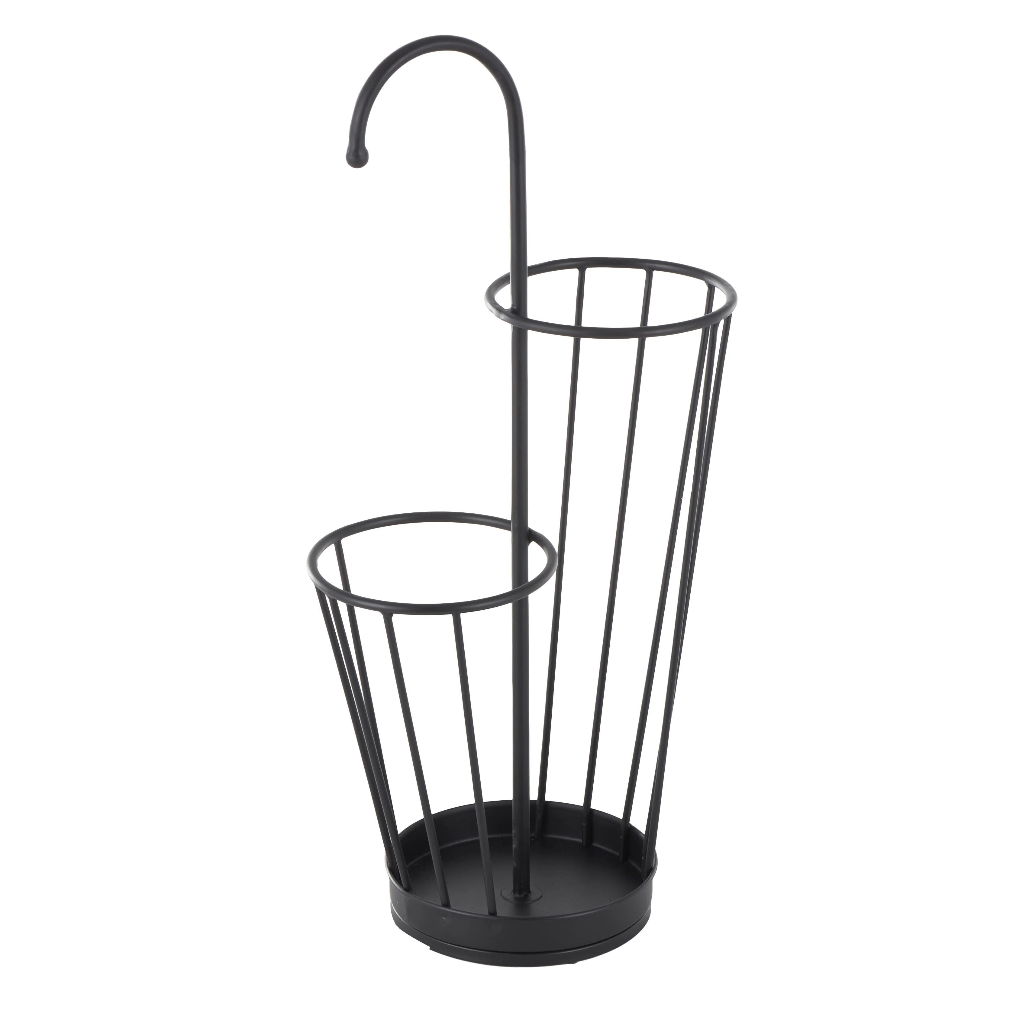 Keep your umbrellas organized in one of the two designated compartments, with a top handle that guarantees easy portability. This product is delivered in a single carton and is intended for indoor use only. No assembly required, as it arrives fully assembled in one piece. Featuring a sleek gold or black finish, this umbrella holder boasts an industrial style design.
