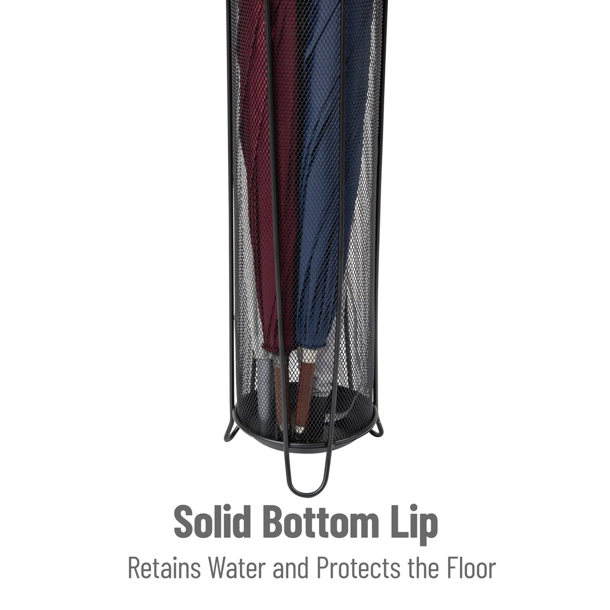 Weighing only 1.6 lbs (0.73 kilogram), this mesh umbrella stand easily fits in an entryway or hall closet without cramping your space. Its efficient design allows it to store up to 4 umbrellas, providing a convenient storage solution for your guests. The thoughtful design features a lip at the bottom to hold water, preventing spills on your floor, while the three decorative feet lift the base off the ground to avoid any potential water damage.