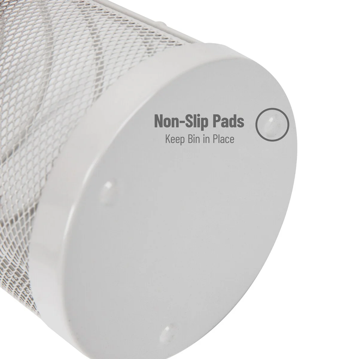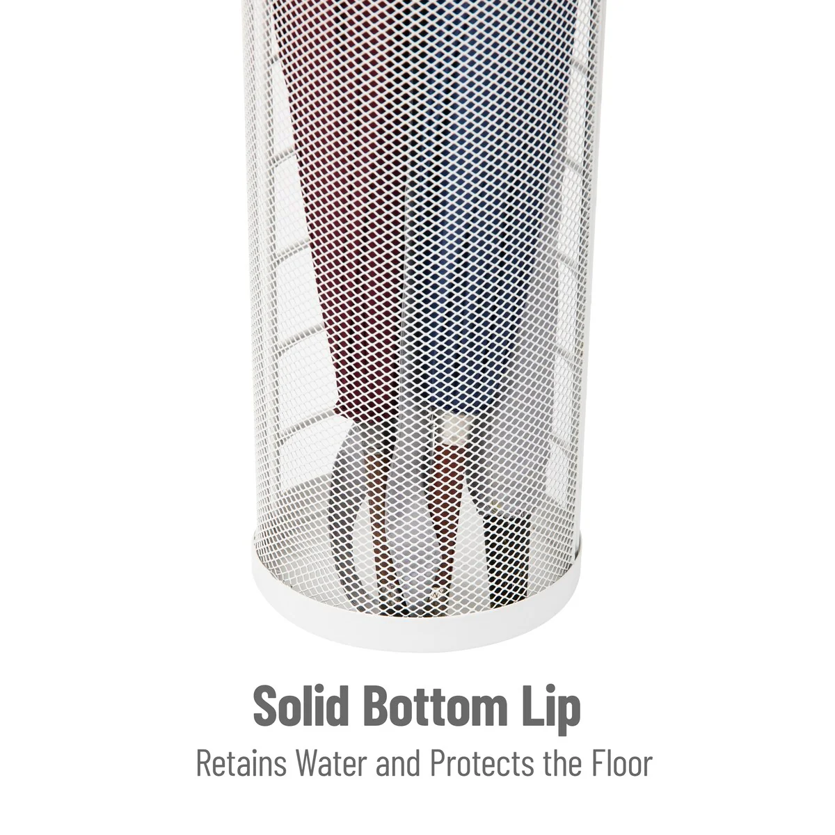 Maximize your storage with our versatile metal mesh umbrella stand, designed to conveniently hold everything from umbrellas at the door to toy swords in the living room to ski poles in the garage. Constructed from high-quality metal, this storage solution ensures durability and can hold up to frequent, repeated use. The contemporary, see-through mesh design brings a touch of minimalism to your home decor, blending seamlessly with a multitude of styles. With a weight of just 1.375 lbs (0.62 kilogram), the umbrella rack is easily portable, fitting comfortably in an entryway or hall closet. Your guests will appreciate the thoughtfulness of this handy storage solution. Despite its lightweight design, the stand can comfortably store up to 4 umbrellas. Its unique design features a lip at the bottom to collect and retain water, avoiding spills onto the floor, and it's elevated by three decorative feet to prevent any moisture damage. While the stand is ideal for indoor use on flat carpets or vinyl floors, you can easily accommodate it in garages or entryways with uneven flooring by placing a rubber mat underneath for additional support. Its compact design also allows it to be tucked into a corner for added stability, making it a storage solution for larger objects like golf umbrellas or patio table umbrellas. Upgrade your storage game with our sleek, multifunctional Mesh Basket Umbrella Stand—where practicality meets style.