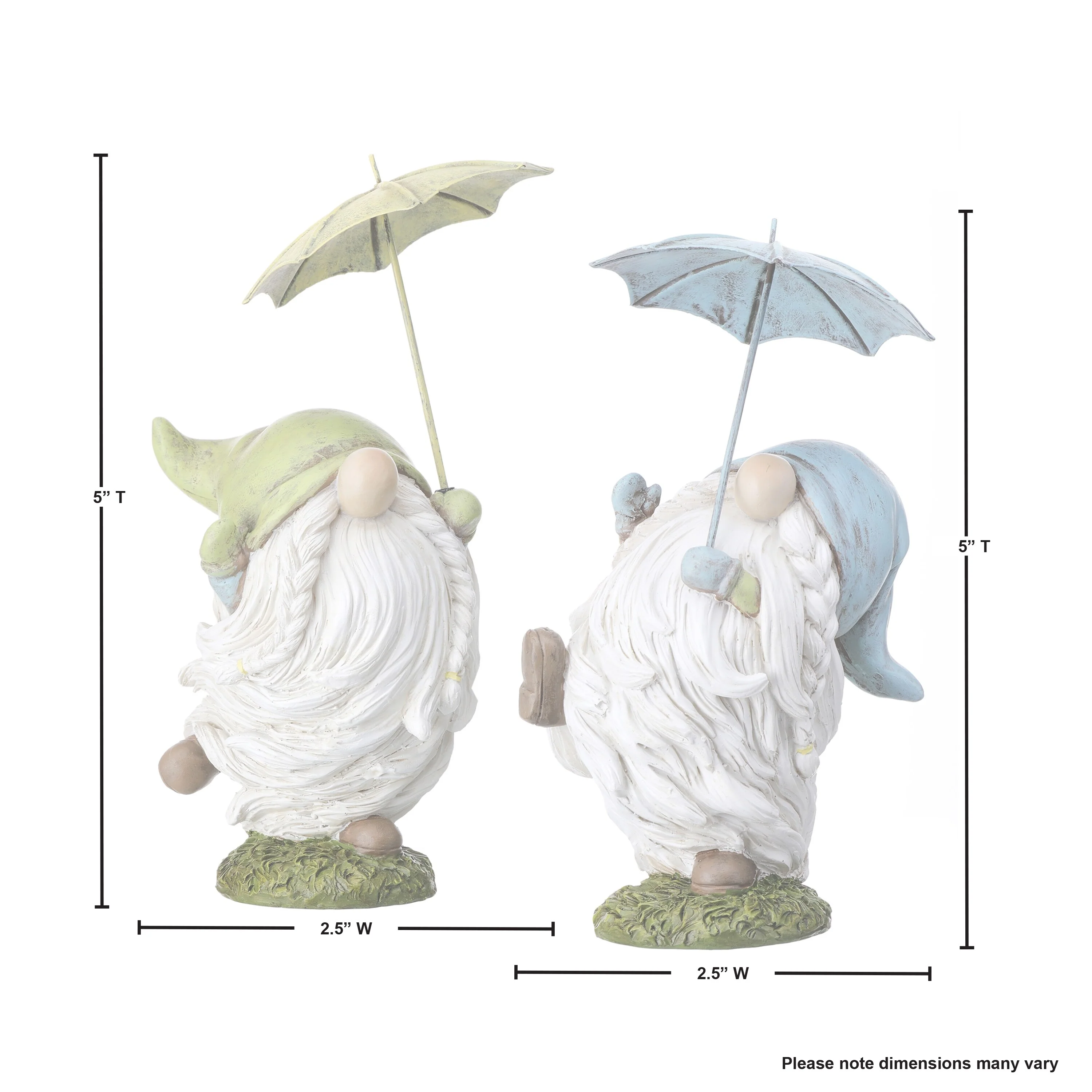 Add the perfect staple piece to your home and garden this spring with this adorable 5' Gnome with Metal Umbrella in an assorted set of two. Crafted of resin. Suitable for indoor and outdoor use. Use it as a festive way to show off your garden or try it on a patio or even on a window sill. This item can be wiped with a damp cloth for cleaning. The overall dimensions are 5' H x 3' W x 4' L.